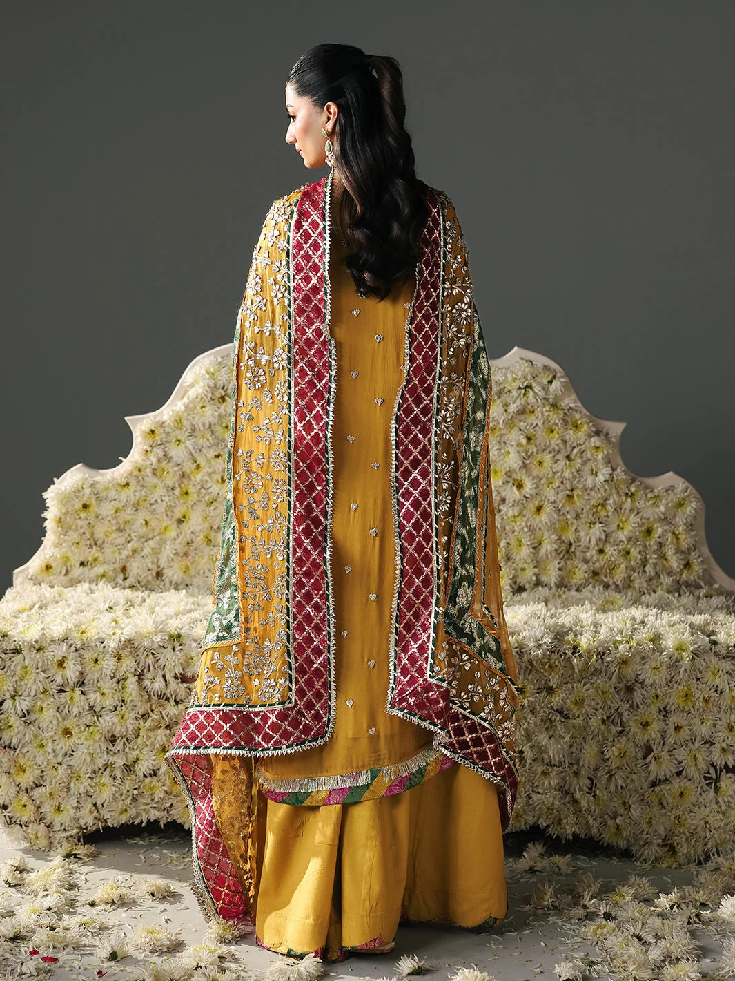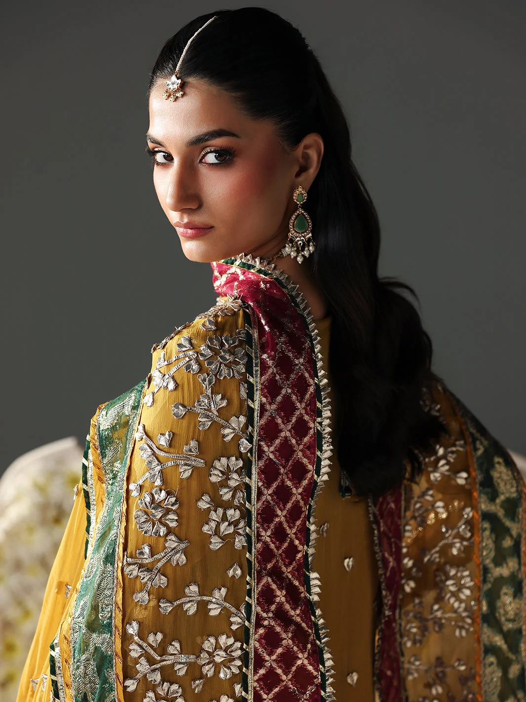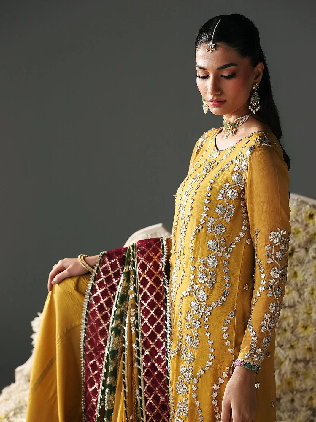 This authentic Allys Official design features a richly embellished Chiffon shirt adorned with striking gold-toned embellishments and intricate detailing that reflects the heritage of Pakistani designer fashion. The flowing lines and panelled Shararah silhouette offer a regal, timeless appeal that elevates any special occasion ensemble.