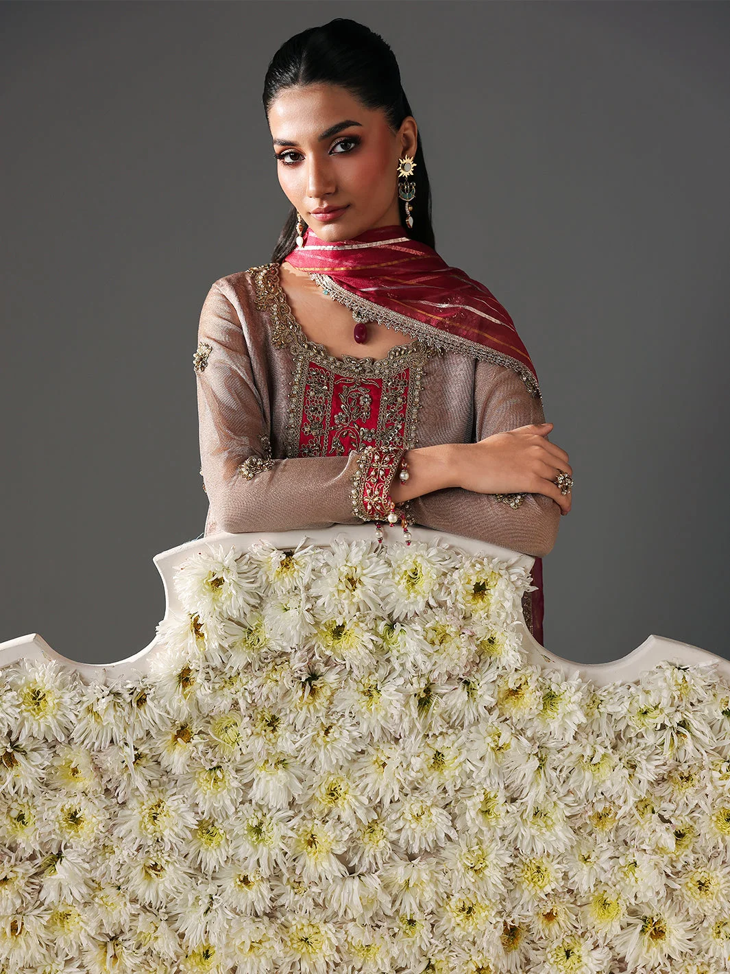Pair this authentic Allys Official sharara set with gold jadau jewelry and heeled khussa or strappy sandals to complete the look. Let the dupatta drape over one shoulder for a classic festive style, or pin it at the wrist for a more modern silhouette. Minimal makeup with a bold lip lets the embellishments speak for themselves.