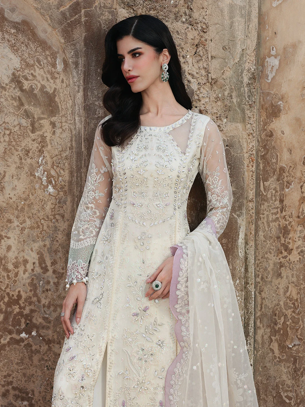 The Shama ensemble is a celebration of traditional Pakistani couture elevated by contemporary sensibility. A multi-tonal, richly embellished organza kurta takes centre stage, adorned with meticulous dabka embroidery and pearl embellishments that catch the light with every movement. The intricate surface work reflects the hallmark artistry that defines authentic Allys Official luxury formals, making this piece a true collector’s statement.