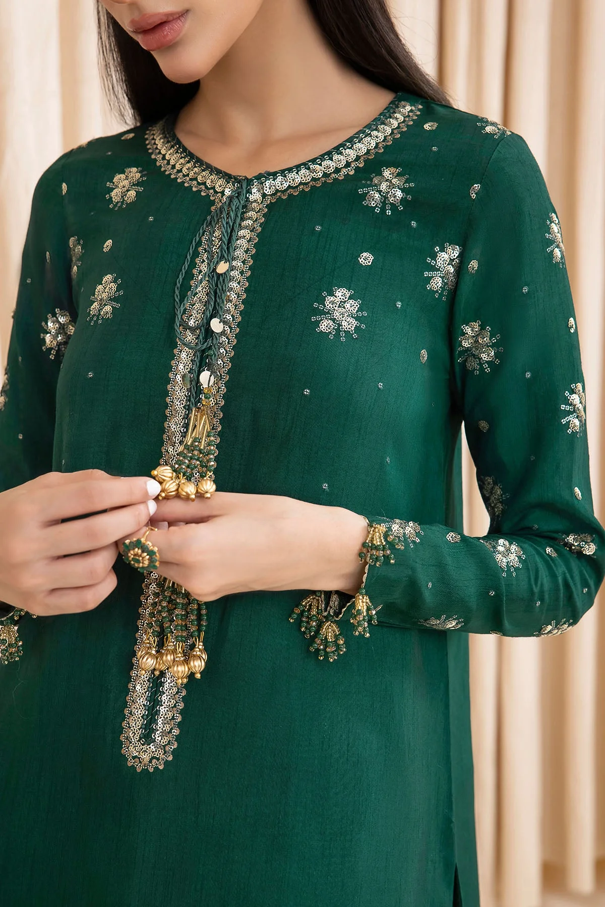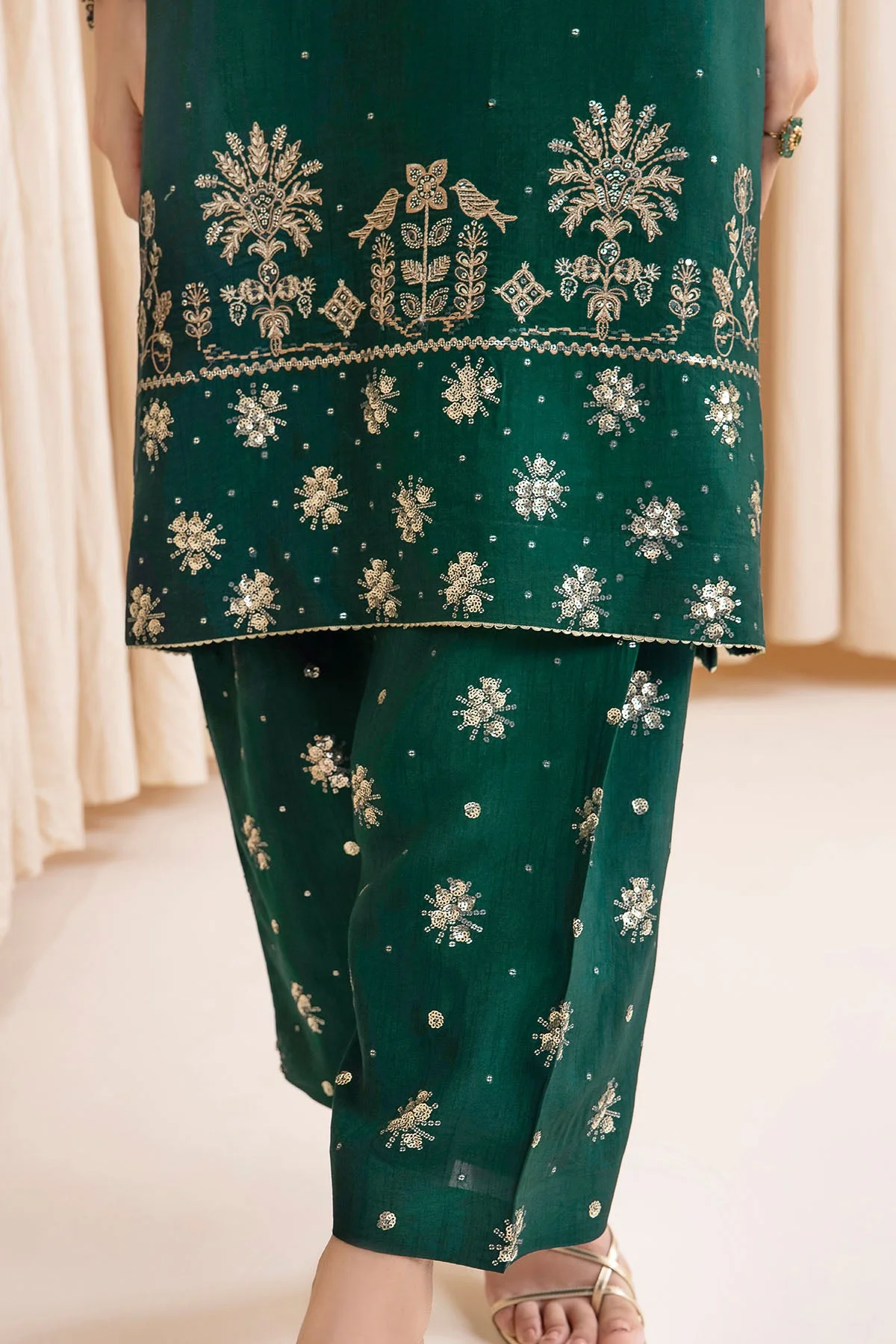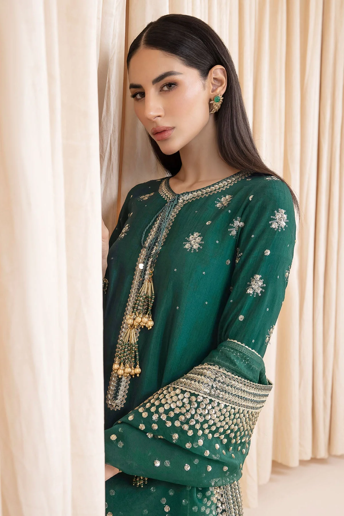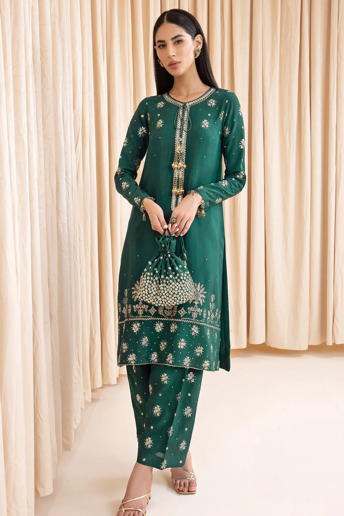 Pair this party wear ensemble with statement gold jewellery and strappy heels for a classic Pakistani formal look. For a modern twist, opt for minimalist ear cuffs and block-heeled mules. The organza dupatta can be draped over the shoulder or styled as a classic Pakistani wrap for different looks.