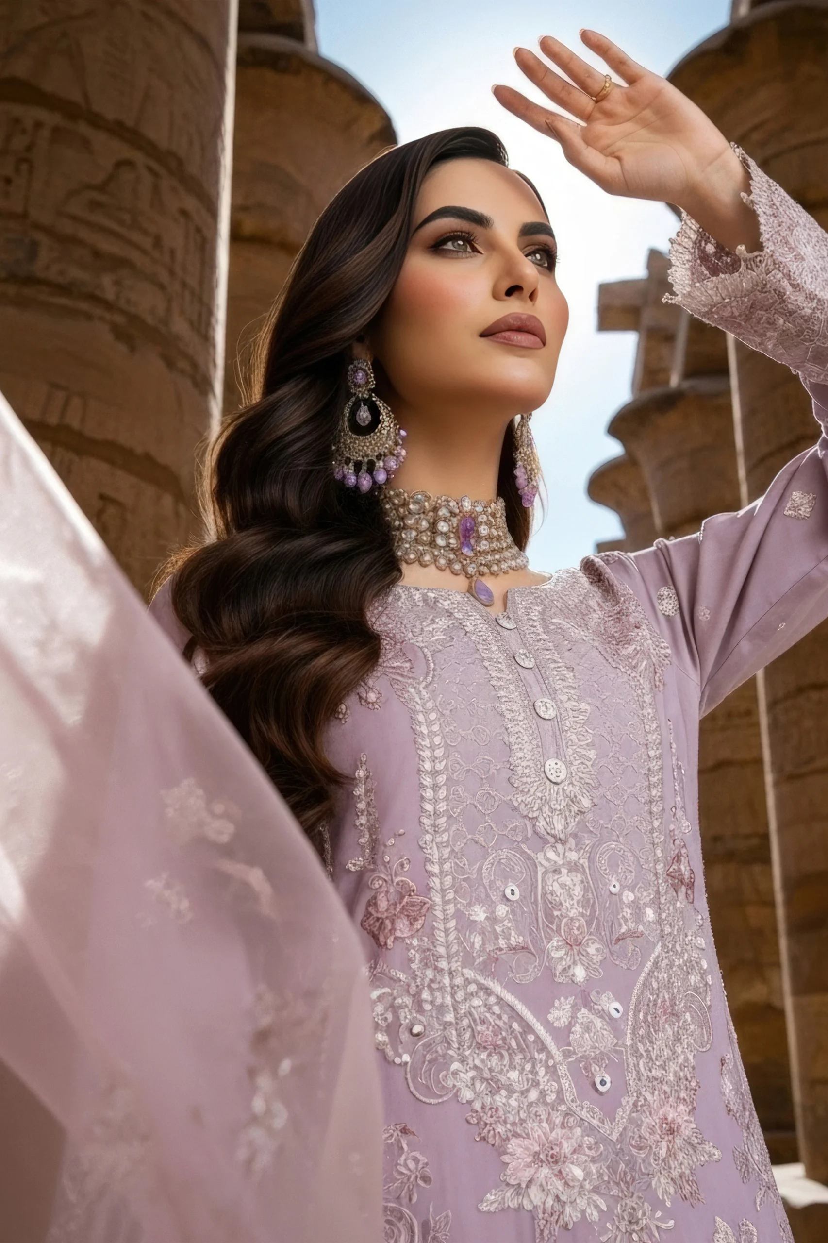 Pair the Ayluna suit with statement jewellery — think chandelier earrings and a layered necklace — to complement the intricate embroidery. Opt for strappy heels in a nude or gold tone to let the outfit take centre stage. A sleek updo or soft waves will perfectly frame the beautifully draped dupatta.