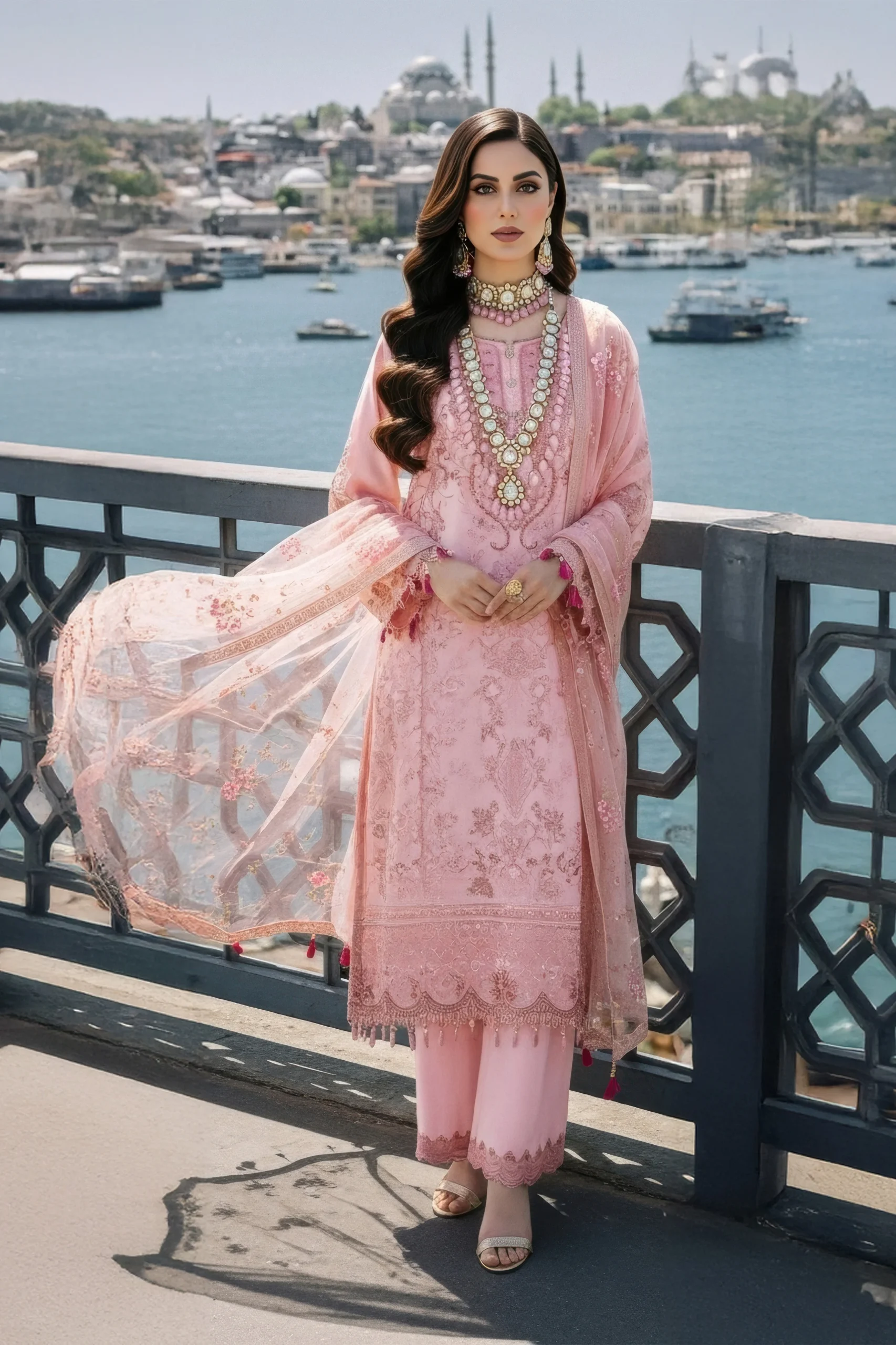 The Meleknaaz design is a masterclass in Pakistani designer fashion. The front features handmade embellishments over an embroidered chiffon base, while meticulously crafted organza jaal panels on both the left and right sides add architectural depth and visual richness. Every edge — from the front and back to the sleeves — is finished with embroidered organza borders for a cohesive, polished look that is unmistakably Imrozia Premium.