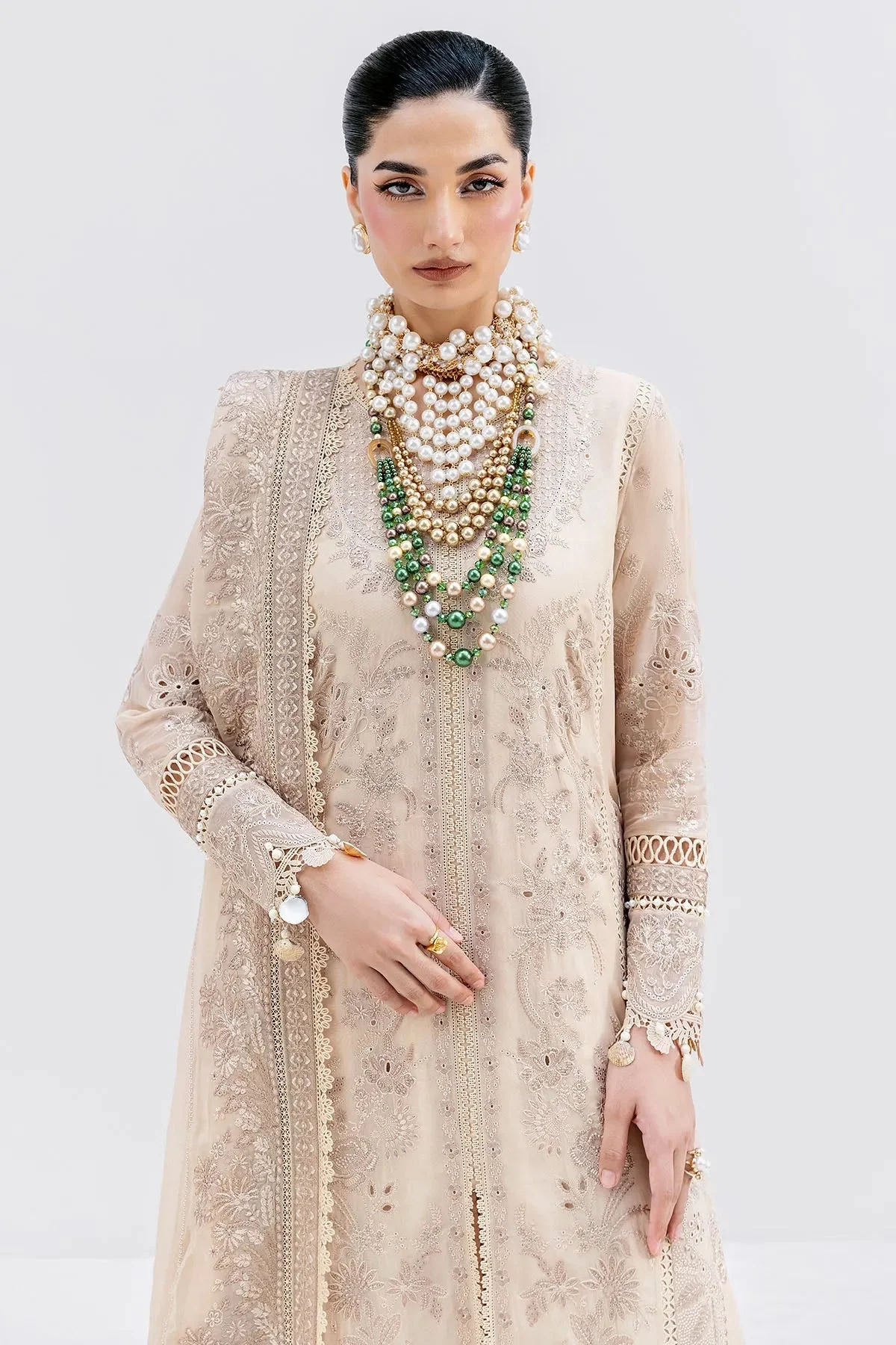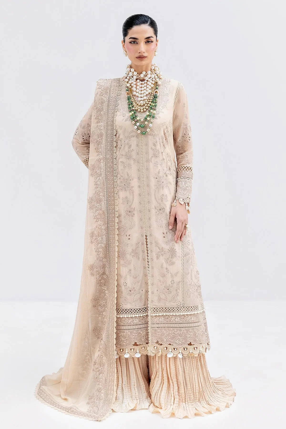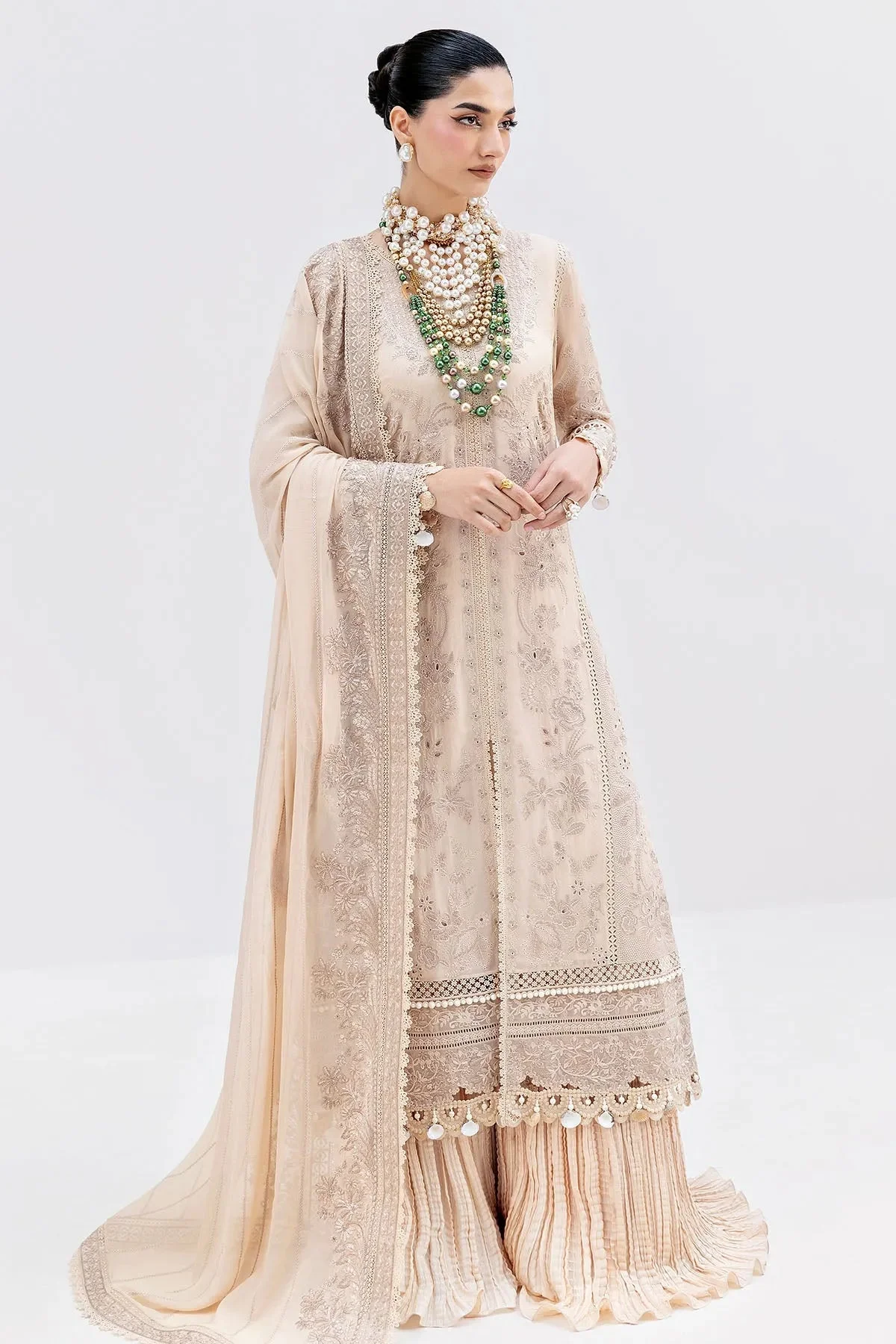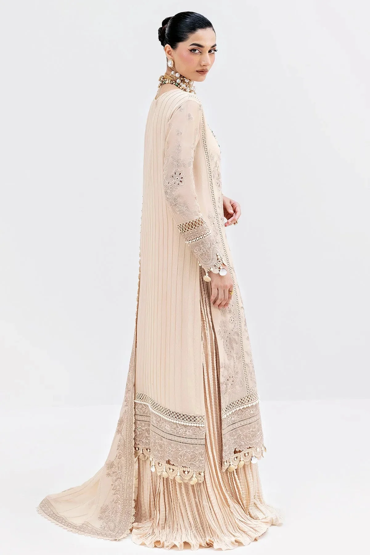 The sand-coloured palette exudes timeless sophistication, making it a versatile choice for a range of occasions. Rich embroidery adorns the georgette shirt and dupatta, featuring delicate motifs that reflect the hallmark artistry of Imrozia Serene. Every stitch is a testament to the brand’s commitment to luxury, precision, and wearable elegance.