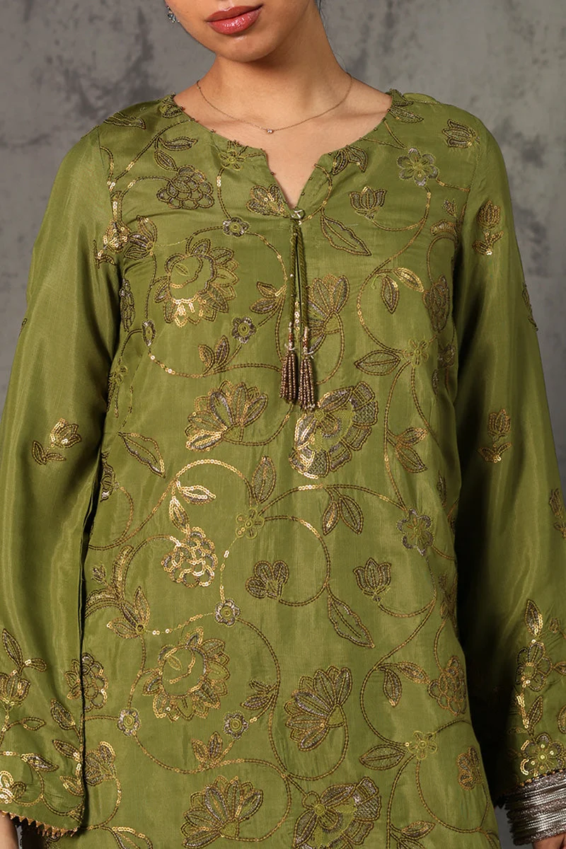 Kalamkaar Grape Green Raw Silk Farshi Formal Wear 3-Piece