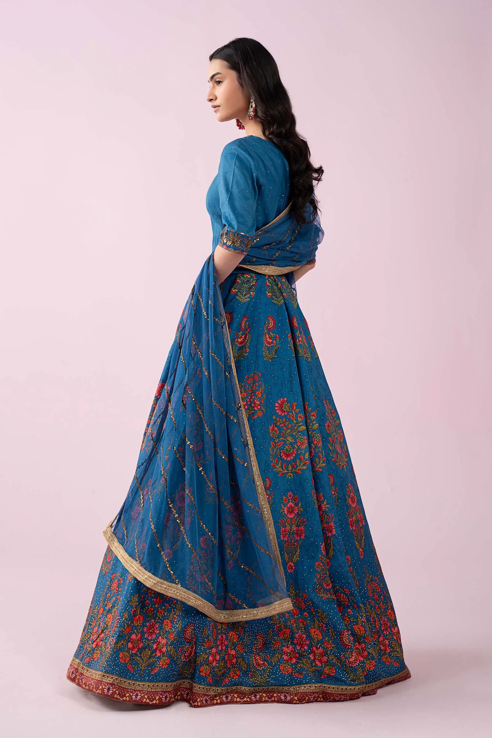 • Dupatta: Sheer net dupatta with four-side embroidered border, printed facing, and intricate sequin and thread embroidery throughout
