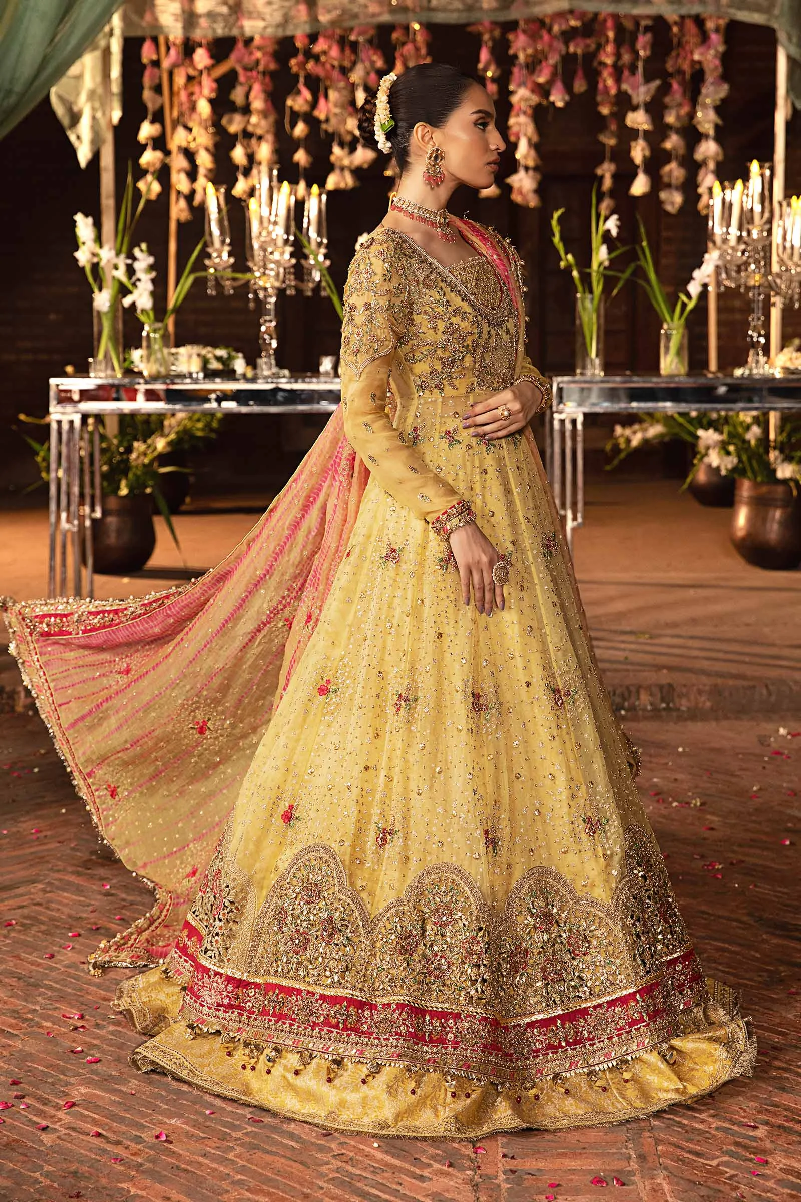 Discover the Maria.B. Oriel Lehenga Set — an exquisite masterpiece from the Maria.B. Couture Vol-10 collection, radiating a vibrant yellow palette adorned with handcrafted sequins, dabka naqshi, gotta kanari, and intricate cutwork border embellishments. This stunning three-piece formal wear ensemble is designed for the woman who commands every room she enters. Order authentic Maria.B. online with free worldwide delivery and elevate your wardrobe with genuine Pakistani designer couture.