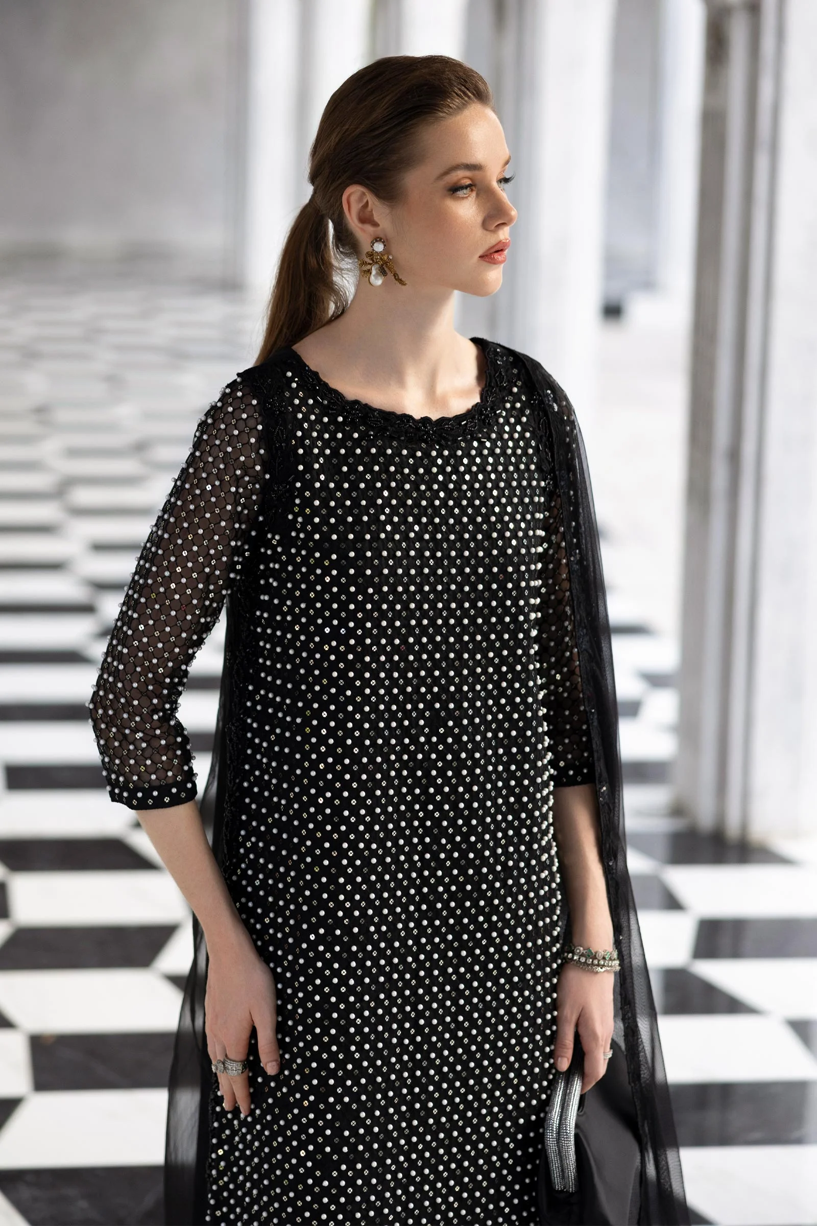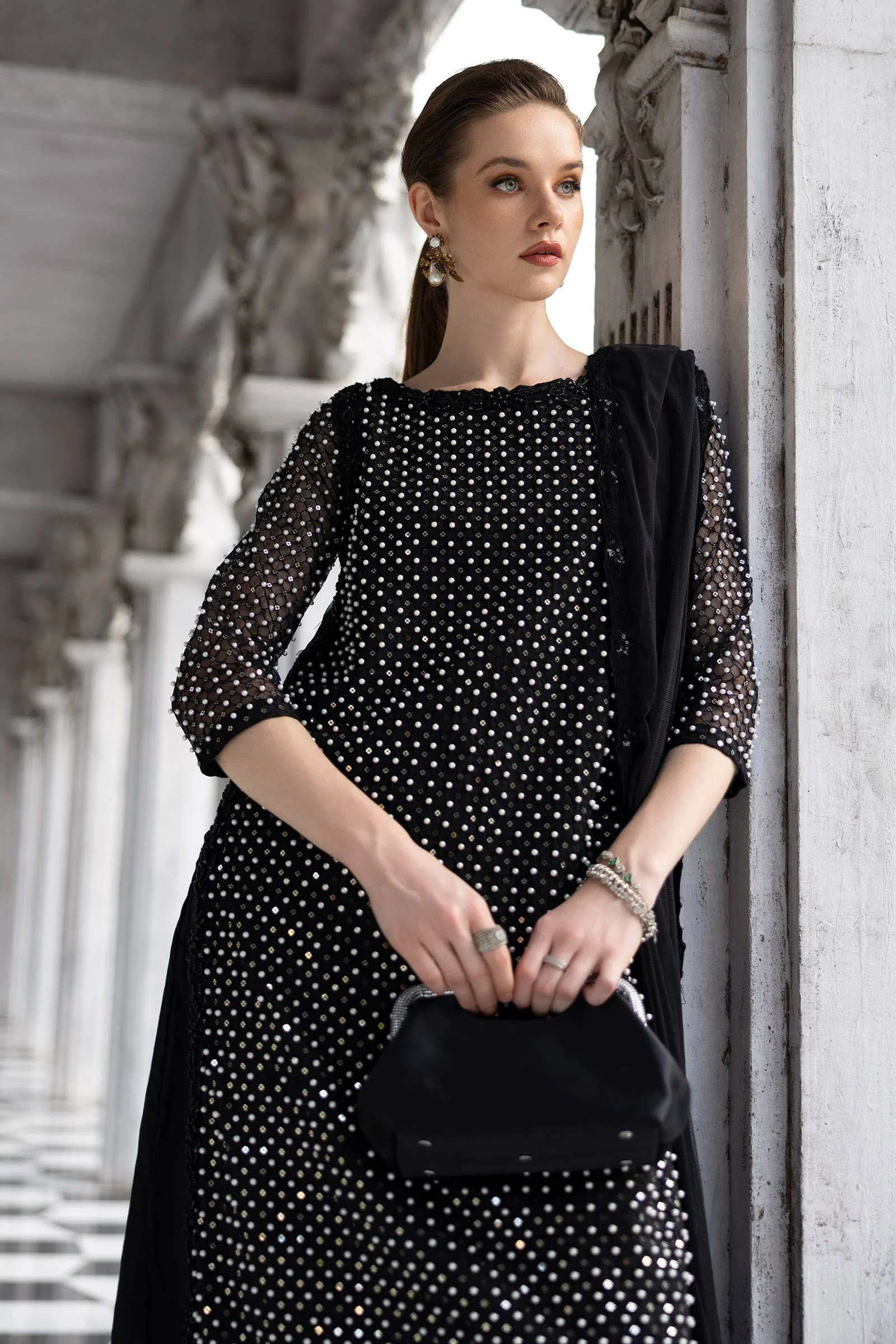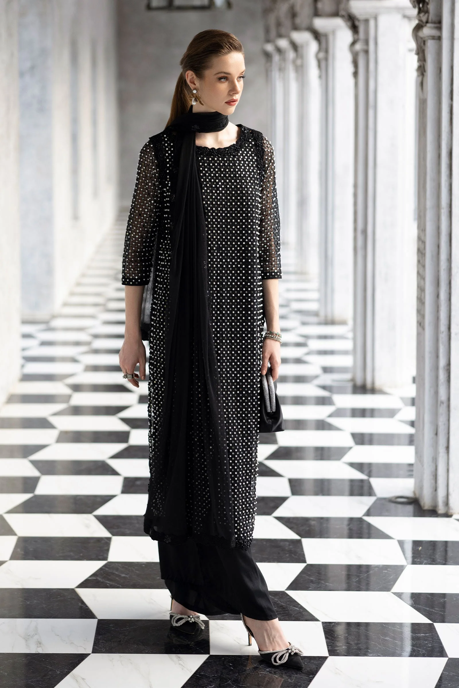 Style this original Maria.B. collection piece with statement jewellery — think chandelier earrings and a layered choker — to amplify the regal aesthetic. Nude or gold heels complement the black palette beautifully, while a sleek bun or soft waves complete the look for a polished, camera-ready appearance at any formal event.