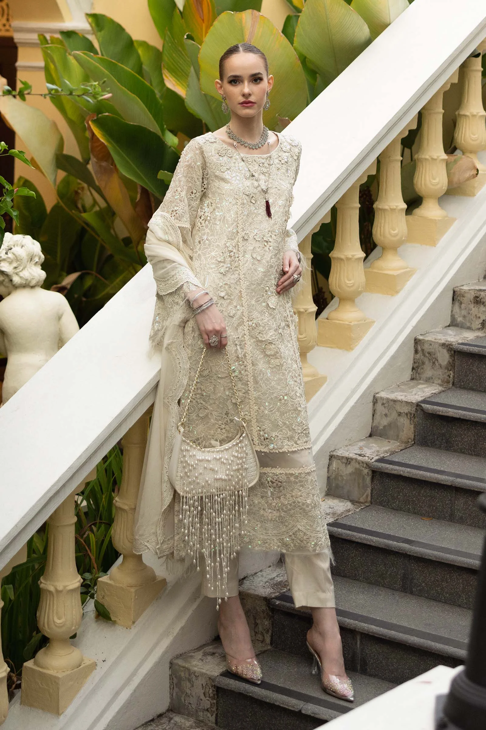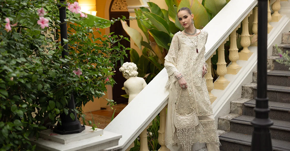 Elevate your festive wardrobe with this exquisite Maria.B. 3-Piece Embroidered Organza Suit — a masterpiece of Pakistani luxury fashion featuring 3D floral embellishments, laser-cut detailing, and a pearl-adorned chiffon dupatta in a timeless off-white palette. Crafted for the discerning woman who demands authentic Pakistani designer elegance for party wear, Eid gatherings, and formal evenings. Shop original Maria.B. online with free worldwide delivery.