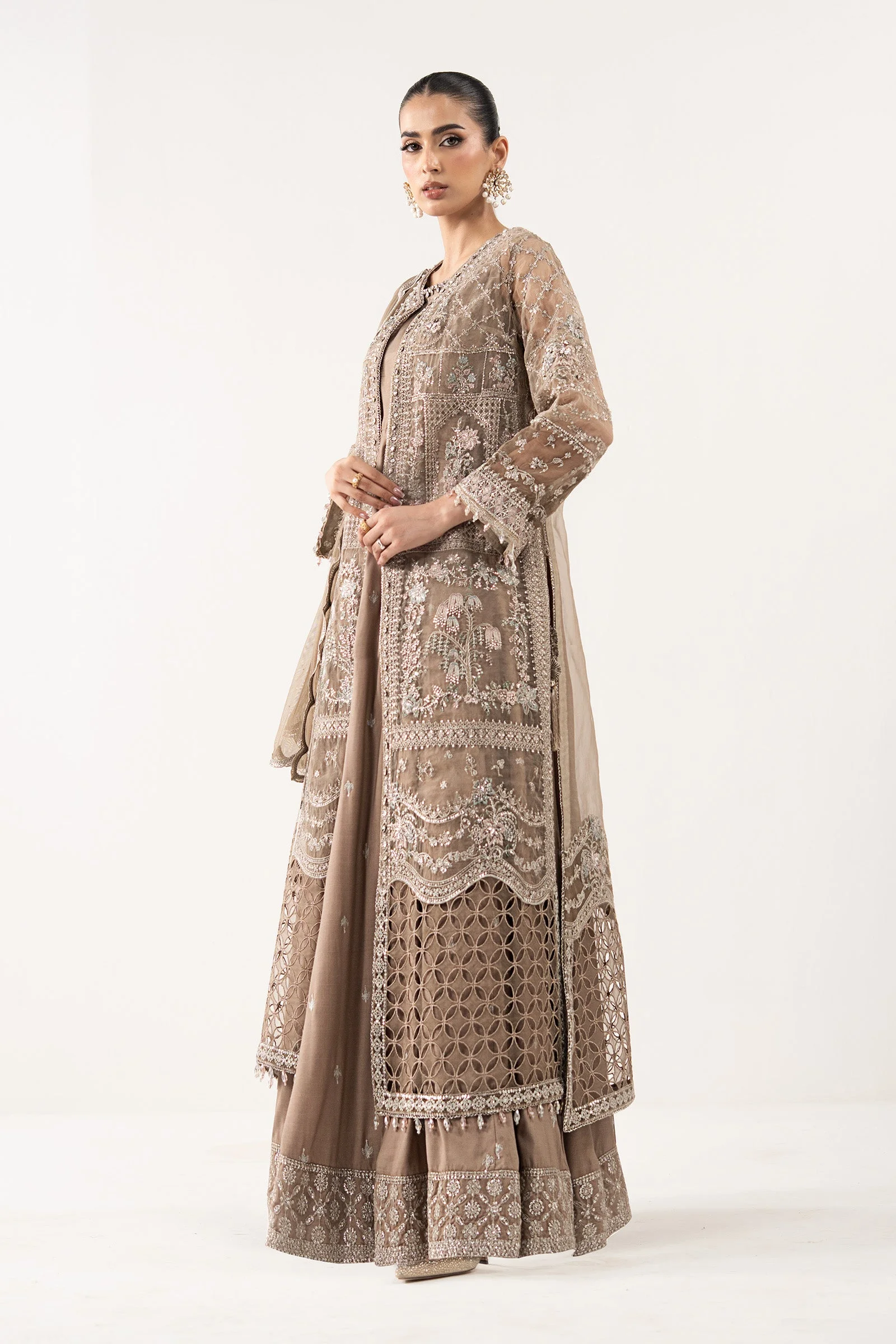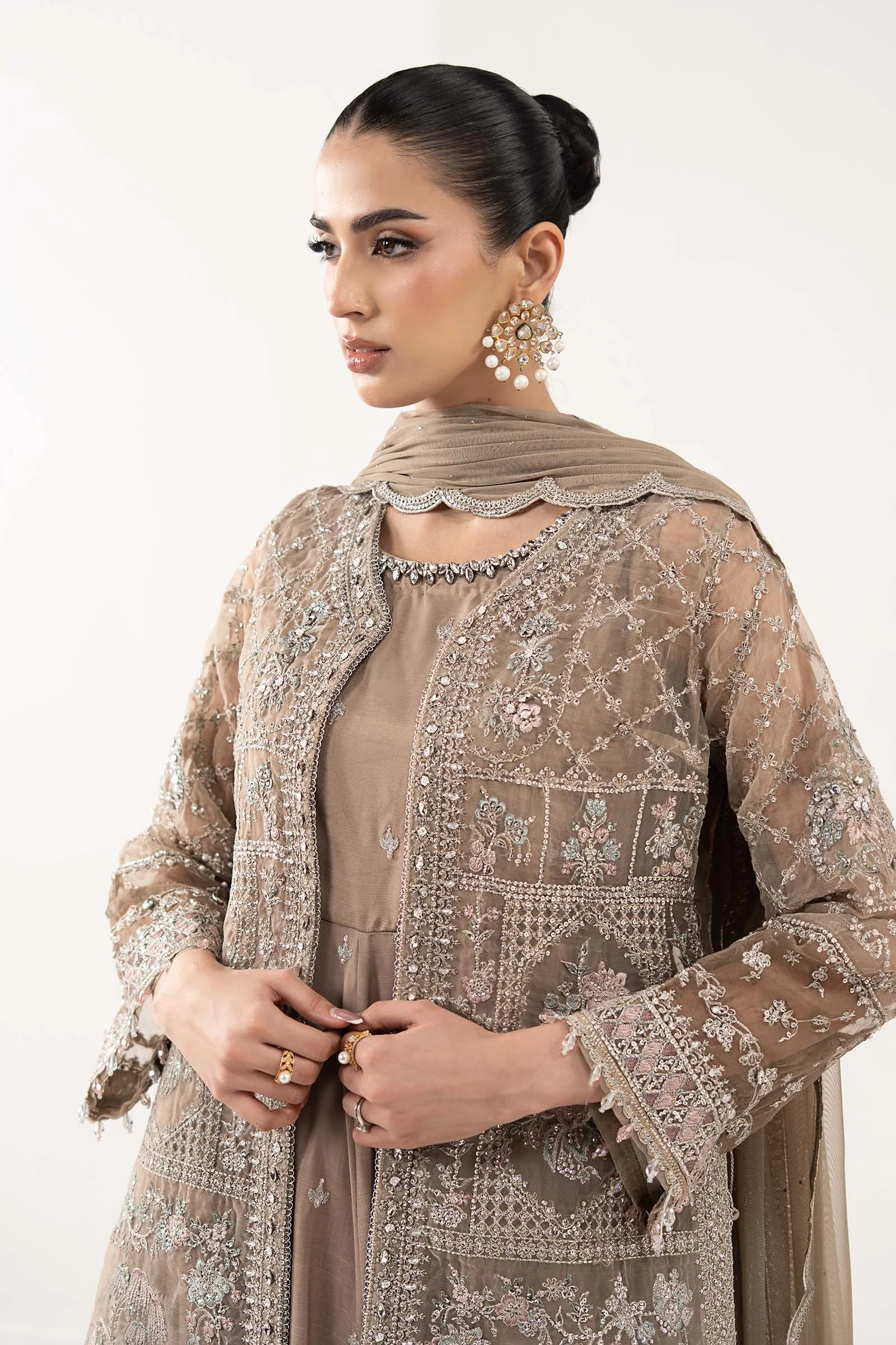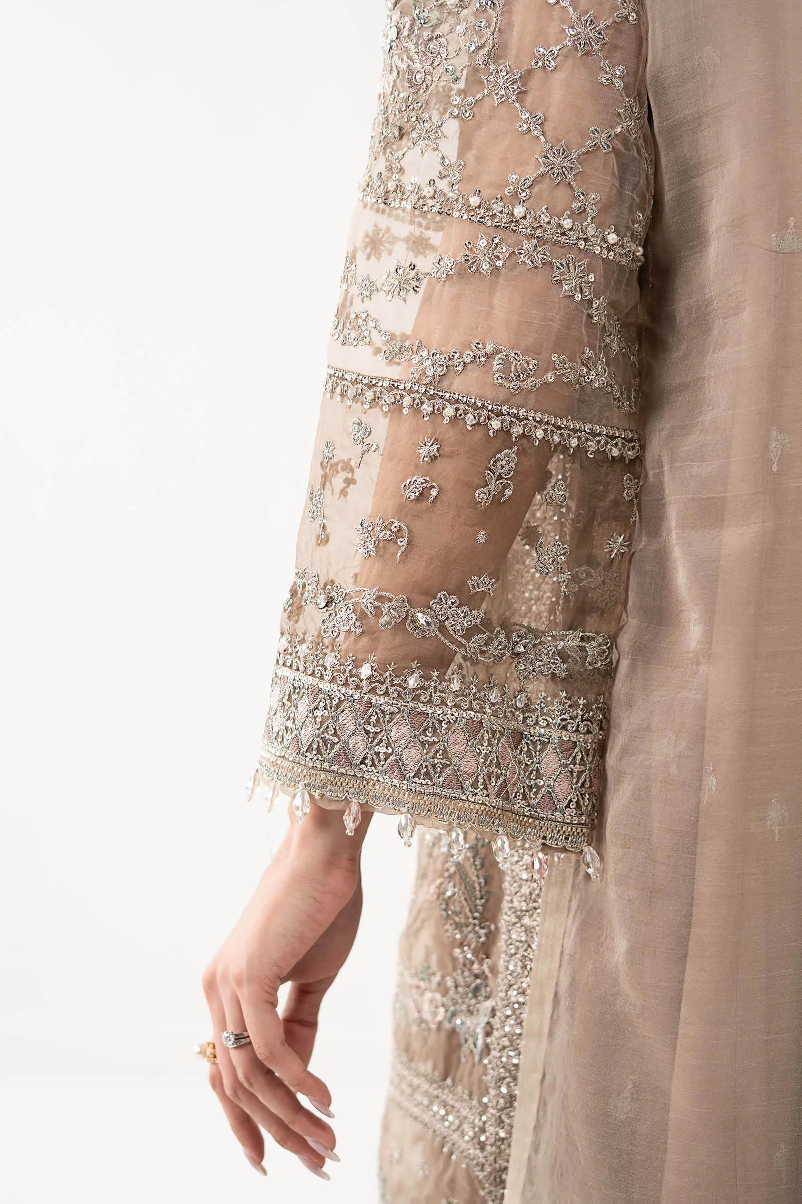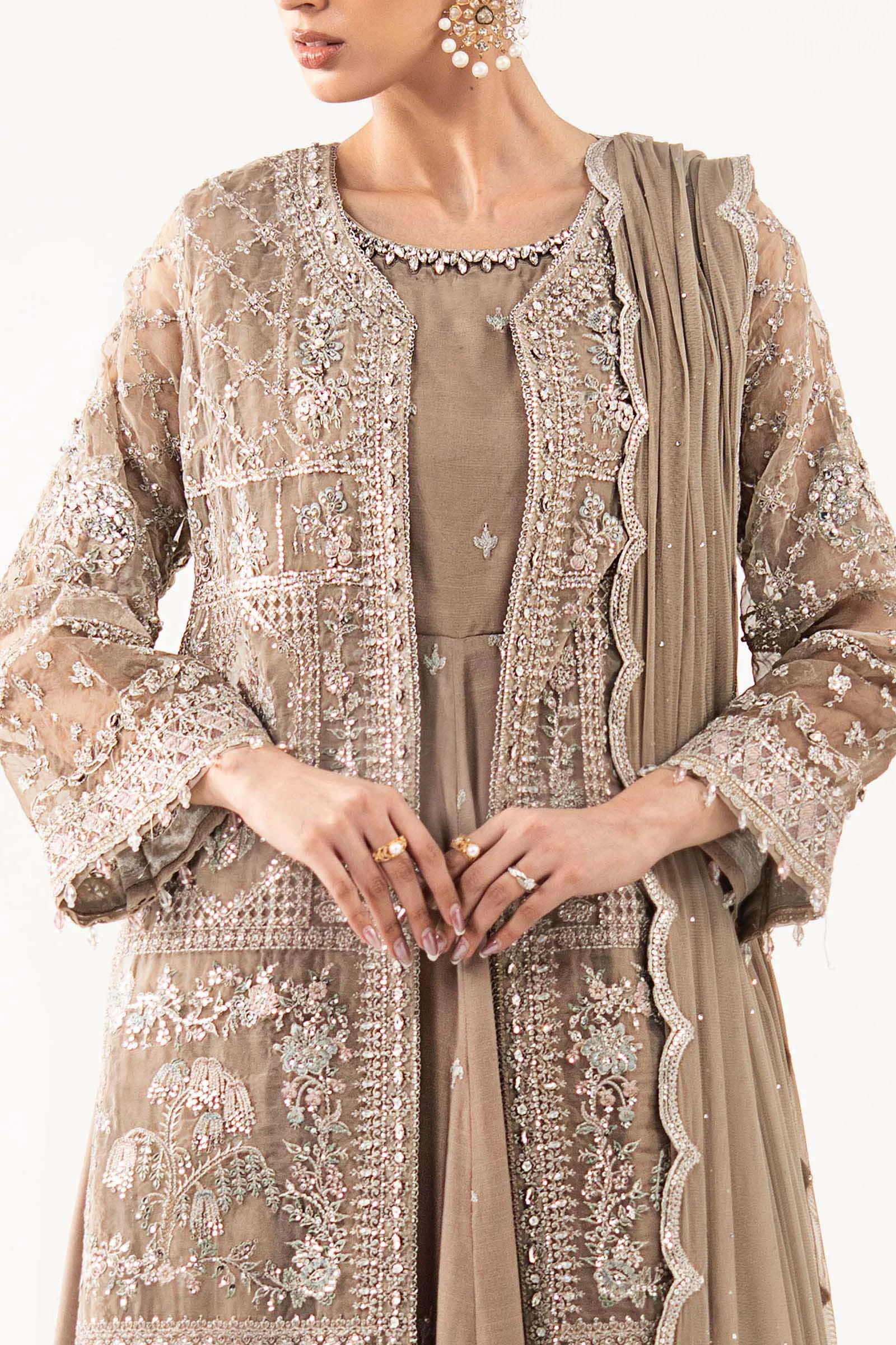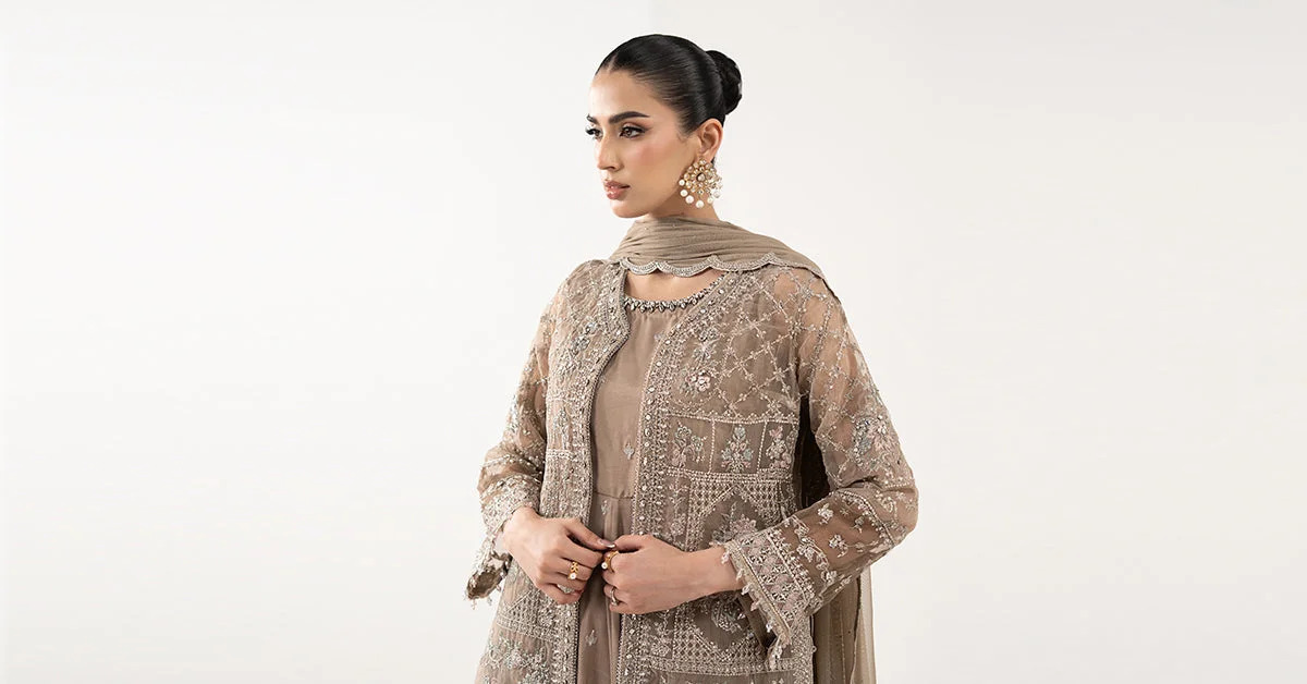 The centerpiece of this look is a front-open embroidered organza jacket adorned with intricate embellishments that reflect Maria.B.’s signature attention to detail. Paired with a sleeveless raw silk frock and a flowing net dupatta, the three-piece ensemble creates a layered, sophisticated silhouette that transitions effortlessly from daytime Eid prayers to evening wedding dinners. The rich coffee brown tone adds warmth and depth, making it a versatile choice for multiple festive settings.