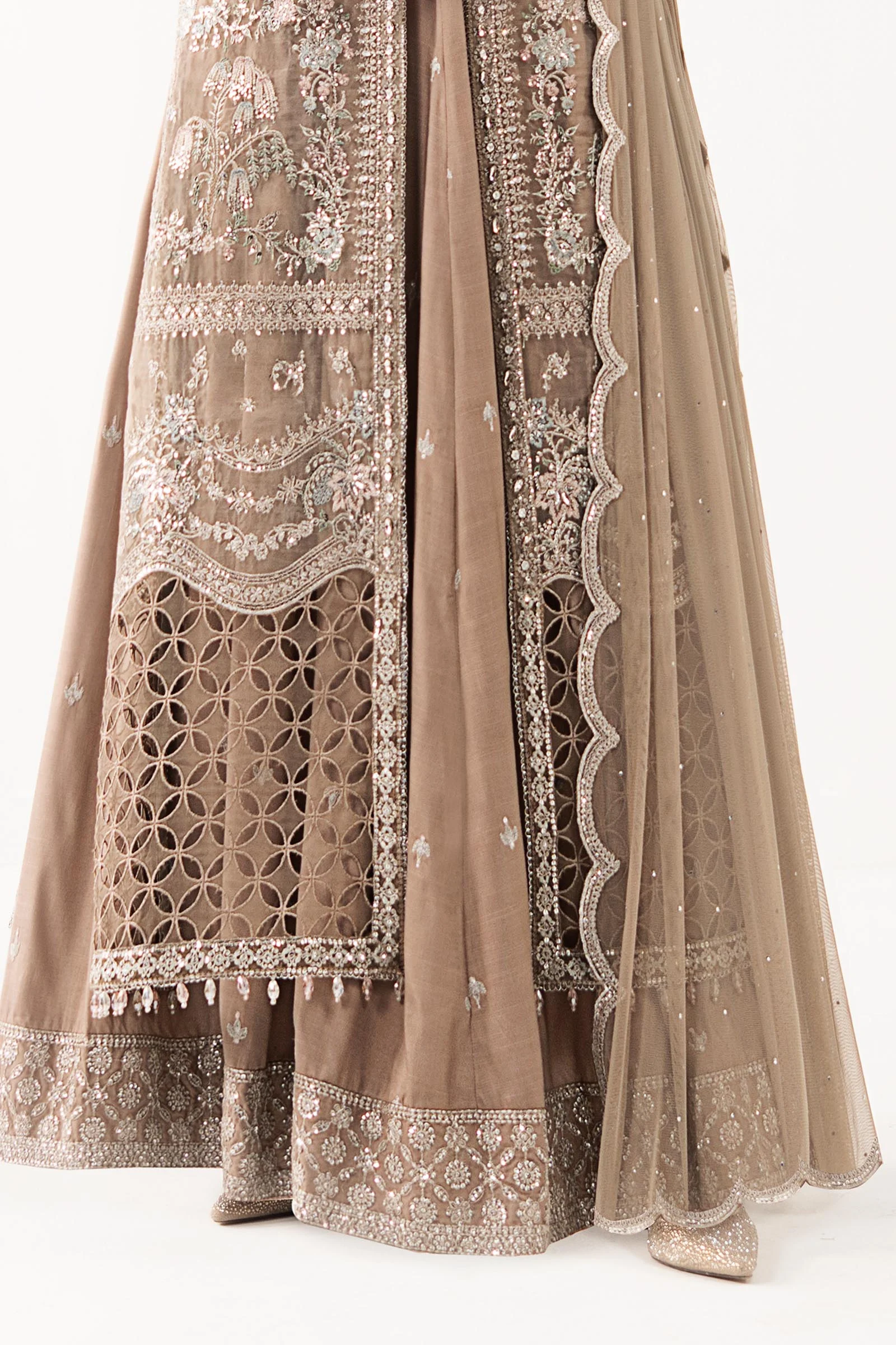 Style the dupatta draped over one shoulder for a classic formal look, or pin it across both for a more regal, bridal-inspired appearance. Pair with gold jhumkas and strappy heels to complement the coffee palette. For a contemporary edge, let the front-open jacket fall loose over the frock and opt for minimalist jewellery to let the embroidery take centre stage.