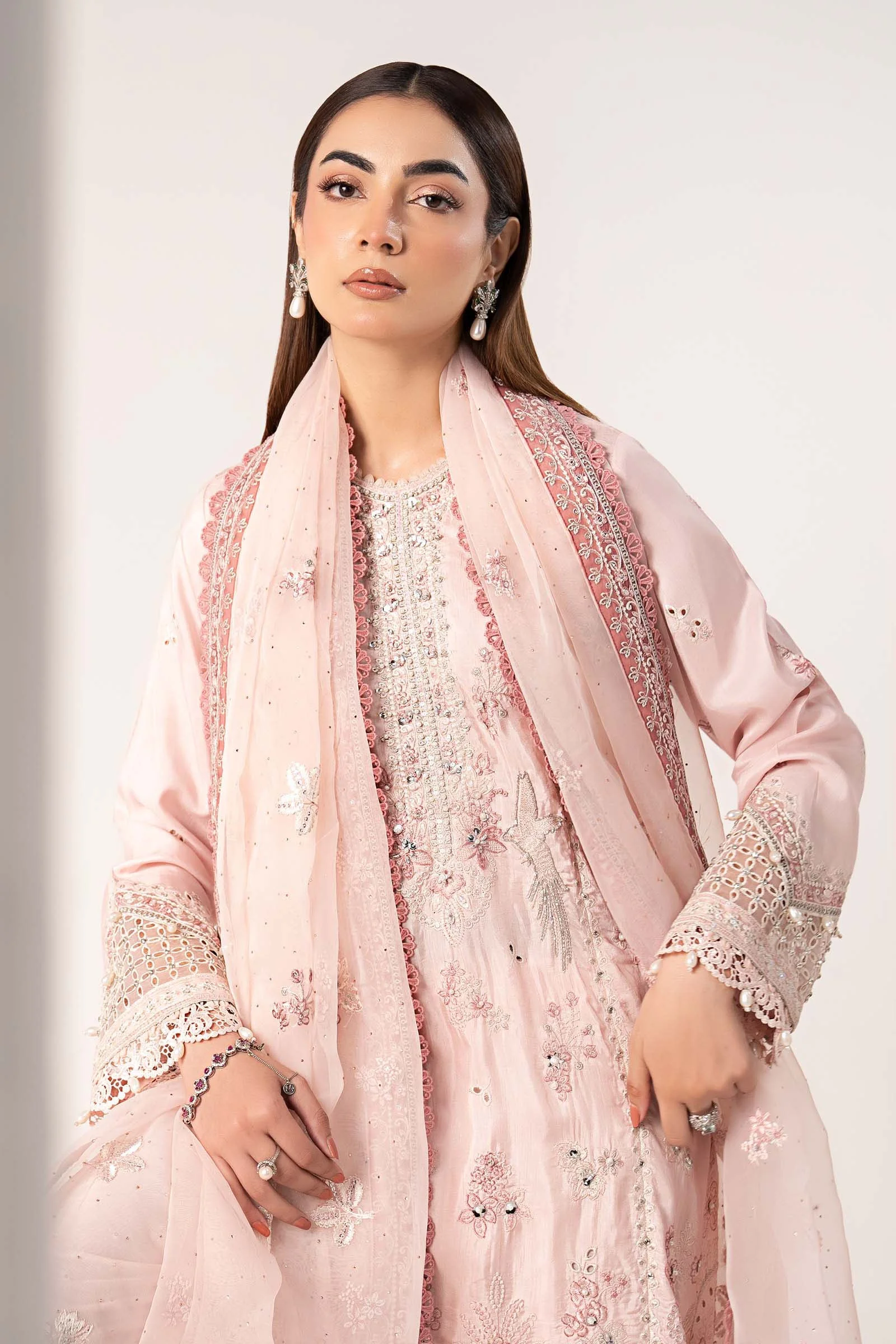 Discover the art of Pakistani designer fashion with this exquisite Maria.B. 3-piece embroidered raw silk suit — a breathtaking party wear ensemble from the coveted Eid Edit I collection. Designed for the woman who commands attention, this blush pink creation seamlessly blends traditional craftsmanship with contemporary silhouettes, making it the ultimate choice for festive evenings, glamorous iftars, and luxury formal events.