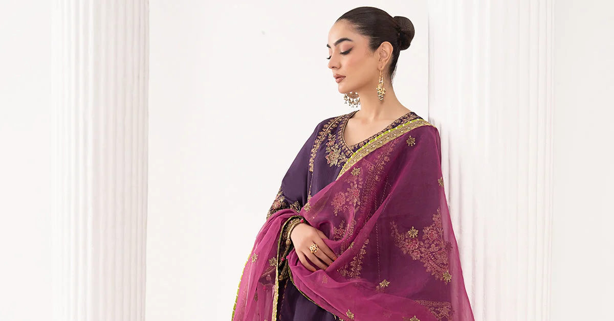 Elevate your festive wardrobe with this authentic Maria.B. 3-Piece Embroidered Raw Silk Angrakha Suit — a showstopping party wear ensemble crafted for women who command attention. Featuring a richly embroidered angrakha with tassel detailing, a coordinated purple raw silk sharara, and a dreamy pink organza dupatta adorned with sequin, tilla, and thread embroidery, this is Pakistani designer fashion at its finest. Buy Maria.B. online at Zilverah with free worldwide delivery and wear the original collection with confidence.