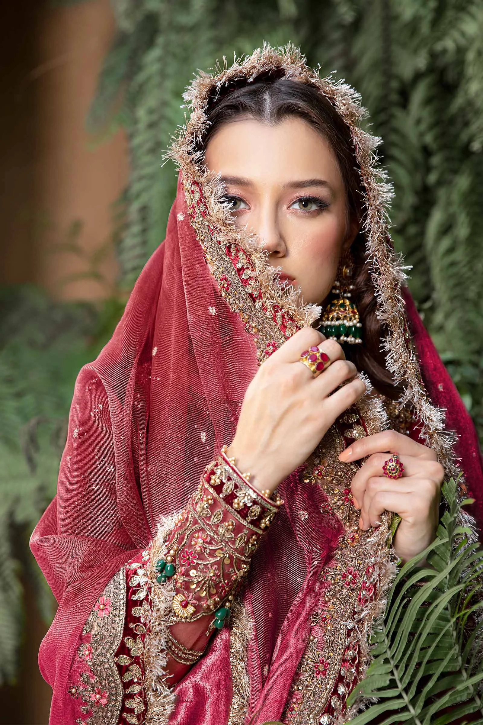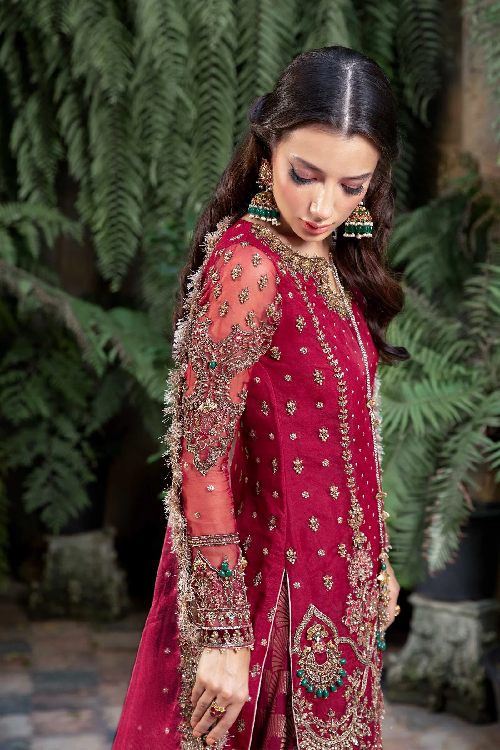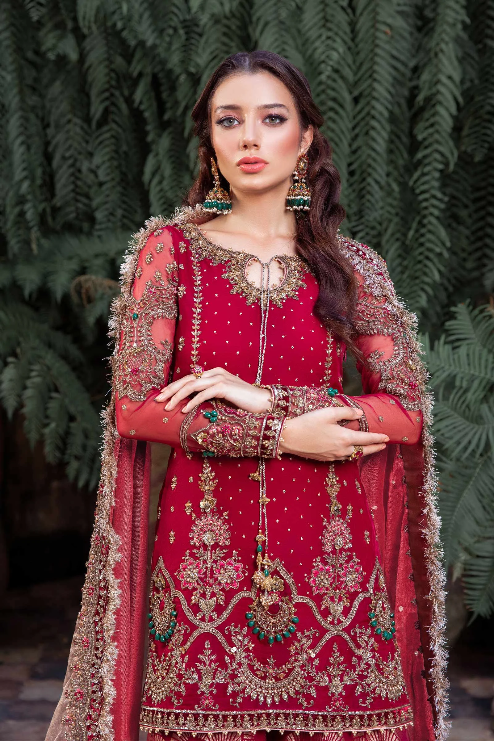 Introducing Shireen by Maria.B. Designs — an opulent 3-piece gharara set crafted in rich red organza and jamawar, adorned with sequins, naqshi, diamantes, kiran, salma, and sitara embellishments that make it the ultimate formal wear statement. This authentic Maria.B. couture piece brings Pakistan’s finest heritage craftsmanship to life, perfect for festive celebrations, weddings, and special occasions. Shop this original Maria.B. collection online with free worldwide delivery.