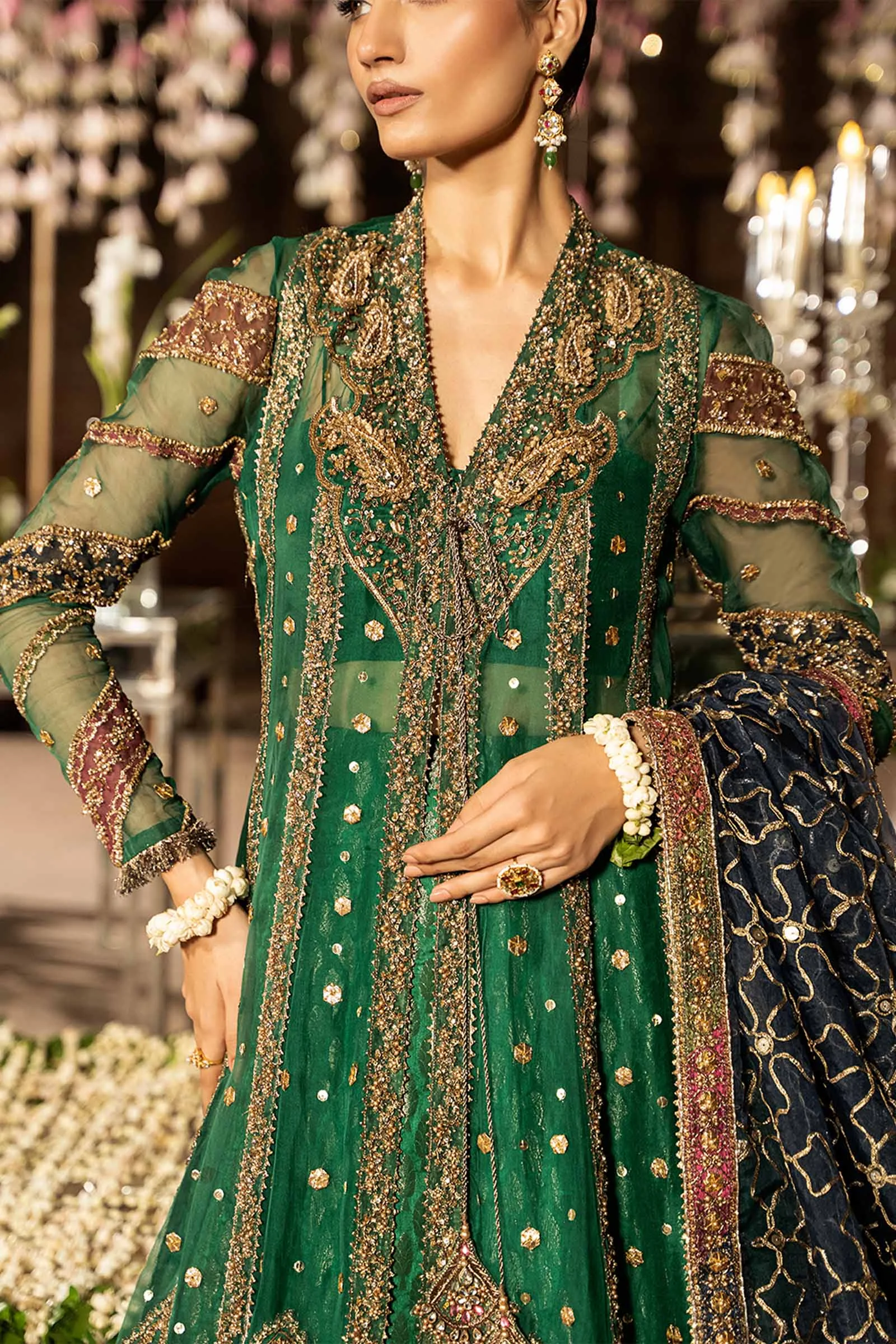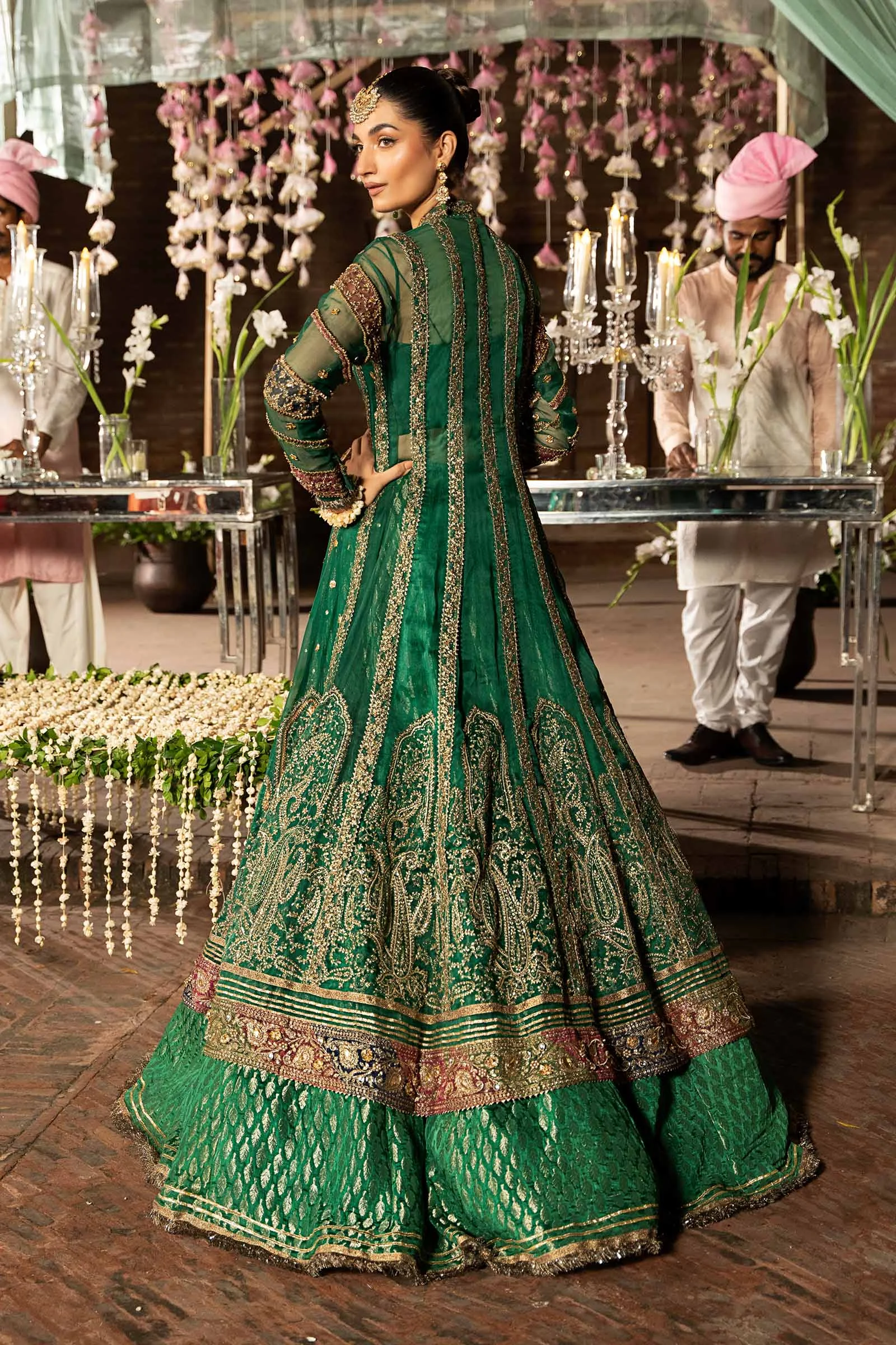 Introducing Shyla by Maria.B. Designs — an emerald green couture frock set adorned with lustrous gotta, dabka-naqshi embroidery, and intricate kinari detailing, crafted for unforgettable formal wear moments at Mehndi, Shendi, and Nikah occasions. This authentic Maria.B. masterpiece from the Couture Vol-10 collection merges timeless Pakistani heritage with ethereal feminine grace. Buy Maria.B. online at Zilverah with free worldwide delivery.