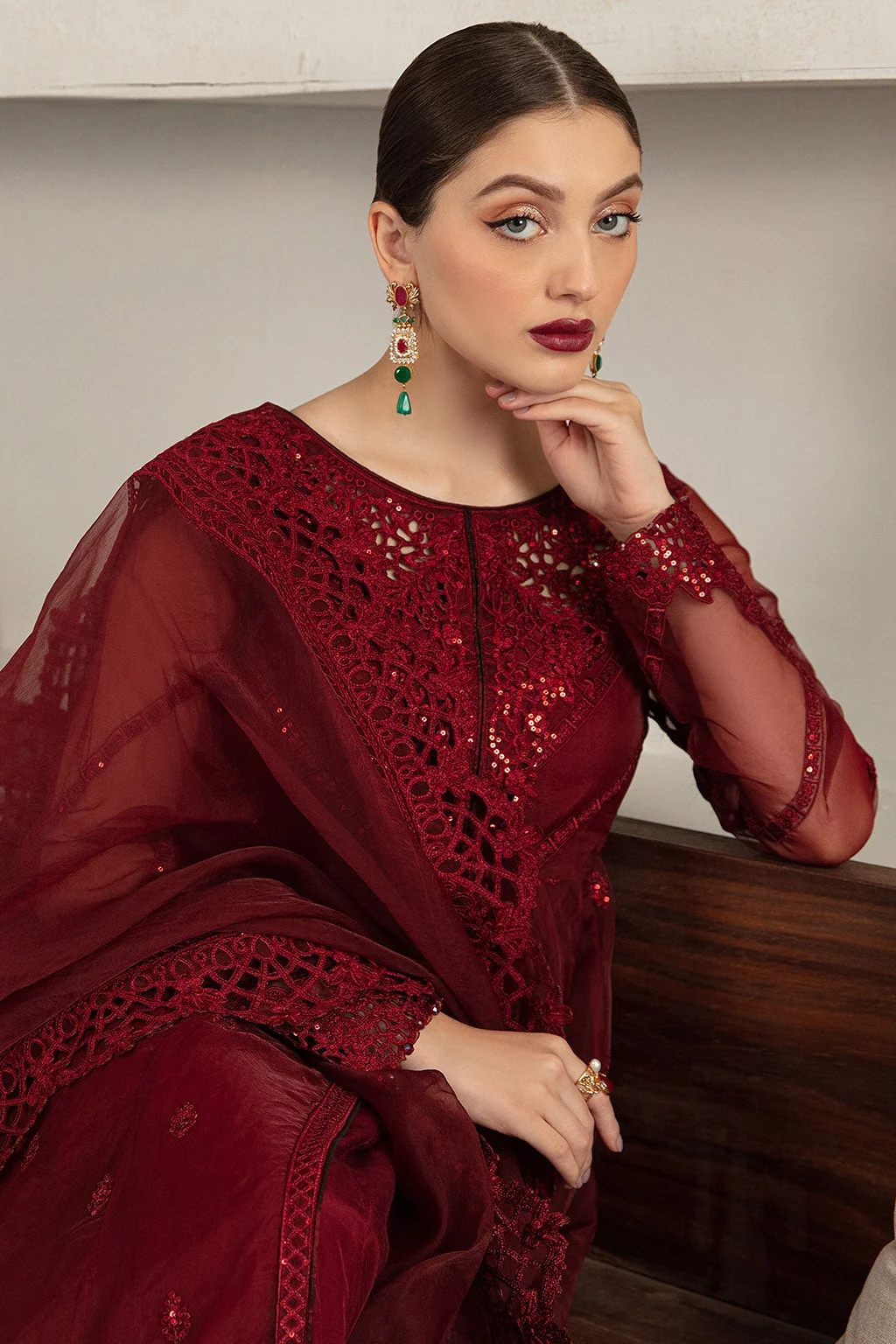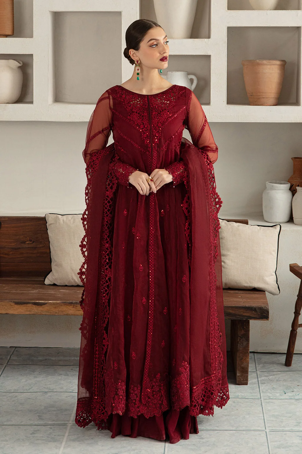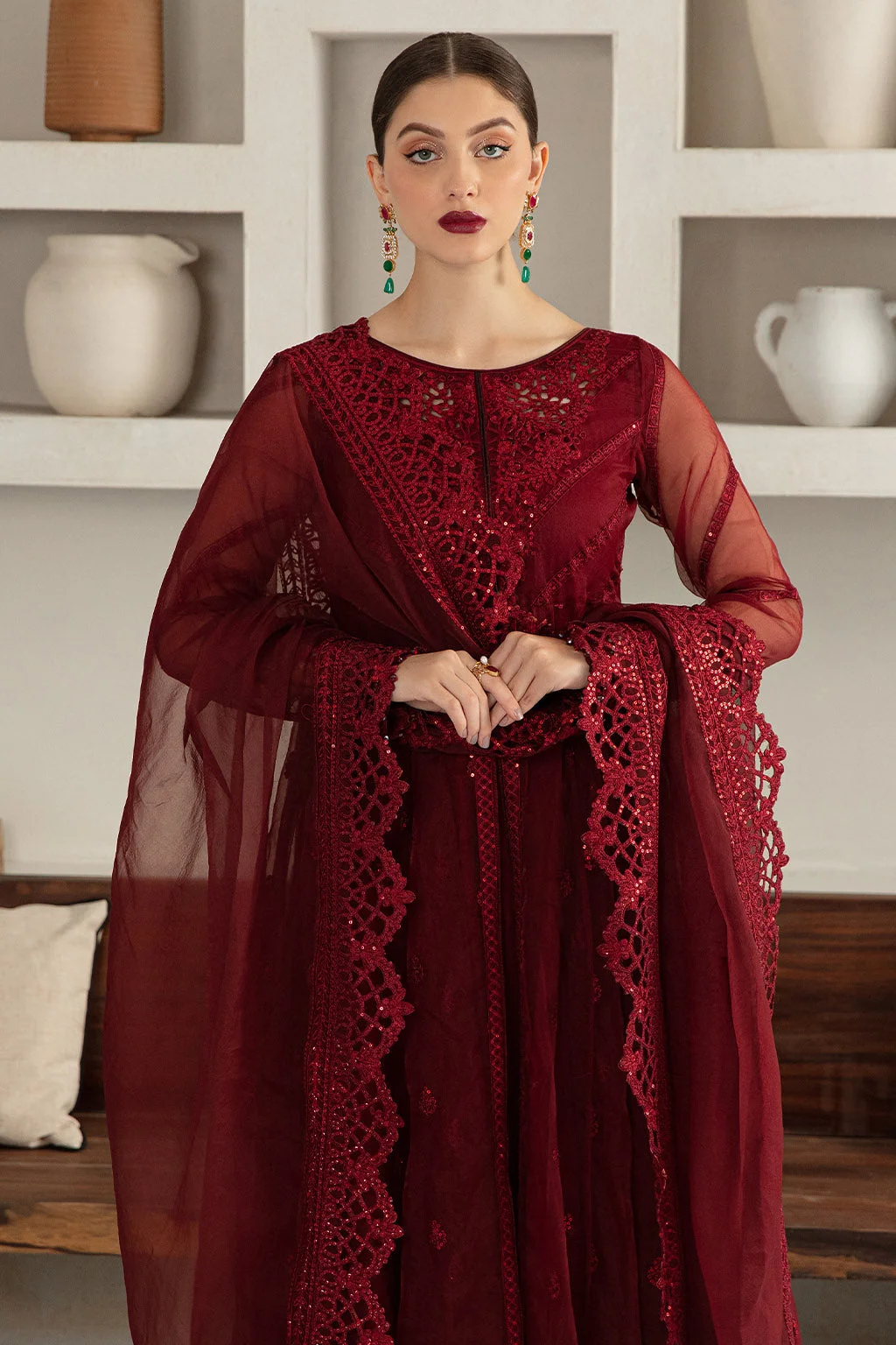 Pair this maroon organza gown with gold or antique jewellery — statement earrings, a layered necklace, and matching bangles will complete the look beautifully. Opt for nude or gold heeled sandals to elongate the silhouette. Drape the organza dupatta over one shoulder for a classic Pakistani formal style, or pin it at the wrist for a more contemporary feel.