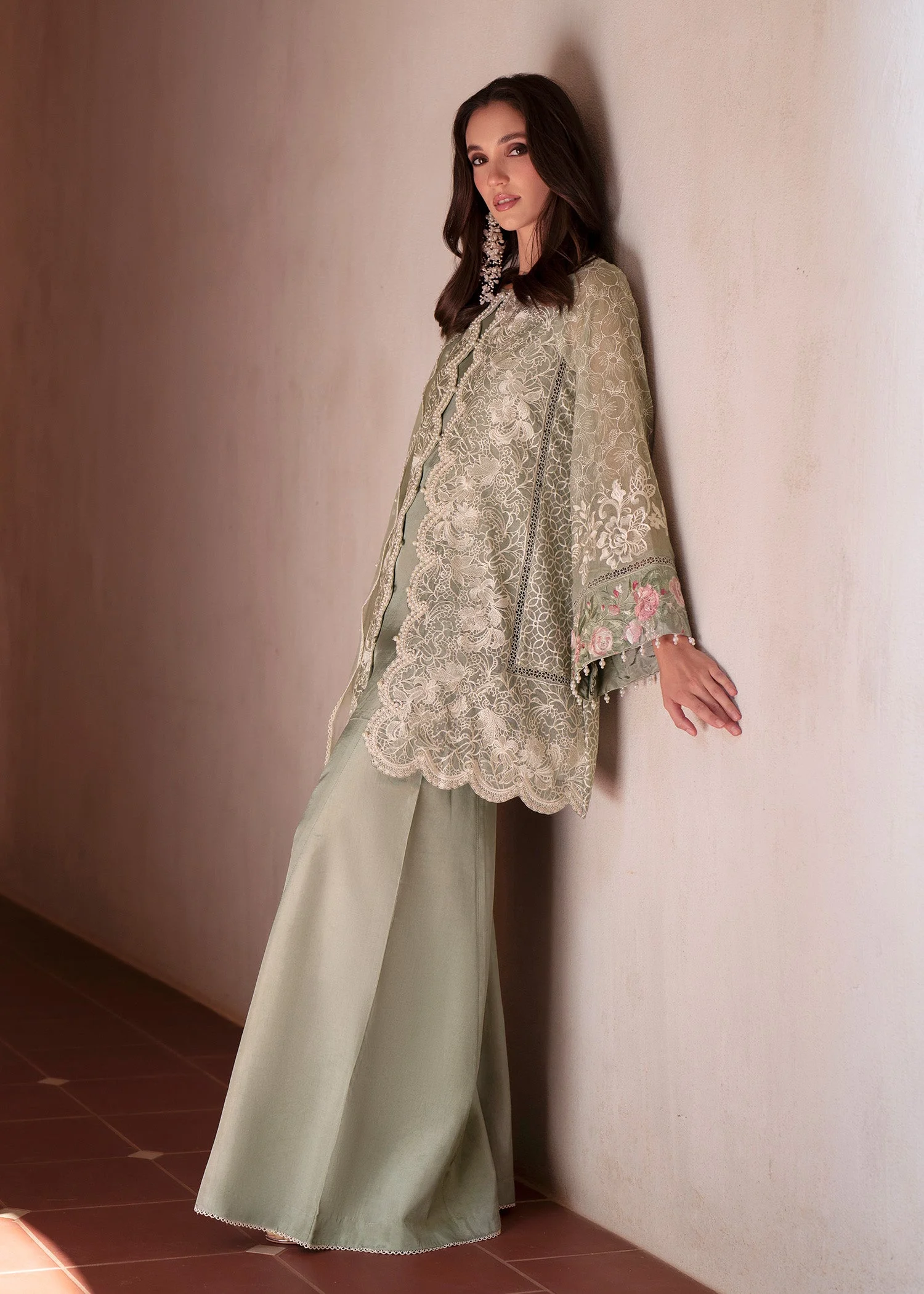 Every stitch of authentic Mehak Yaqoob Couture reflects an uncompromising commitment to artistry. Eva’s centrepiece is a front-open embroidered jacket adorned with intricate hand-embellished pearl detailing — a hallmark of luxury couture that sets this look apart from mainstream fashion. The carefully considered silhouette is both modern and graceful, striking the perfect balance between statement dressing and wearable elegance.