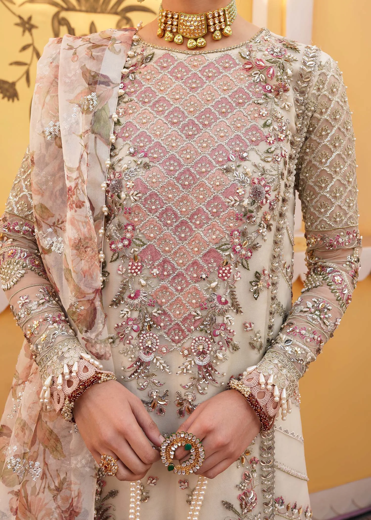 Discover the breathtaking Venice by Mehak Yaqoob Couture — a luxurious long shirt in delicate off-white organza, adorned with intricate floral embroidery in blush pink and peach, and handcrafted crystal and stone embellishments that shimmer with every movement. Perfectly suited as an elegant formal wear choice for weddings and festive occasions, this three-piece ensemble effortlessly blends romance with Pakistani couture artistry. Shop authentic Mehak Yaqoob Couture online at Zilverah and enjoy free worldwide delivery.