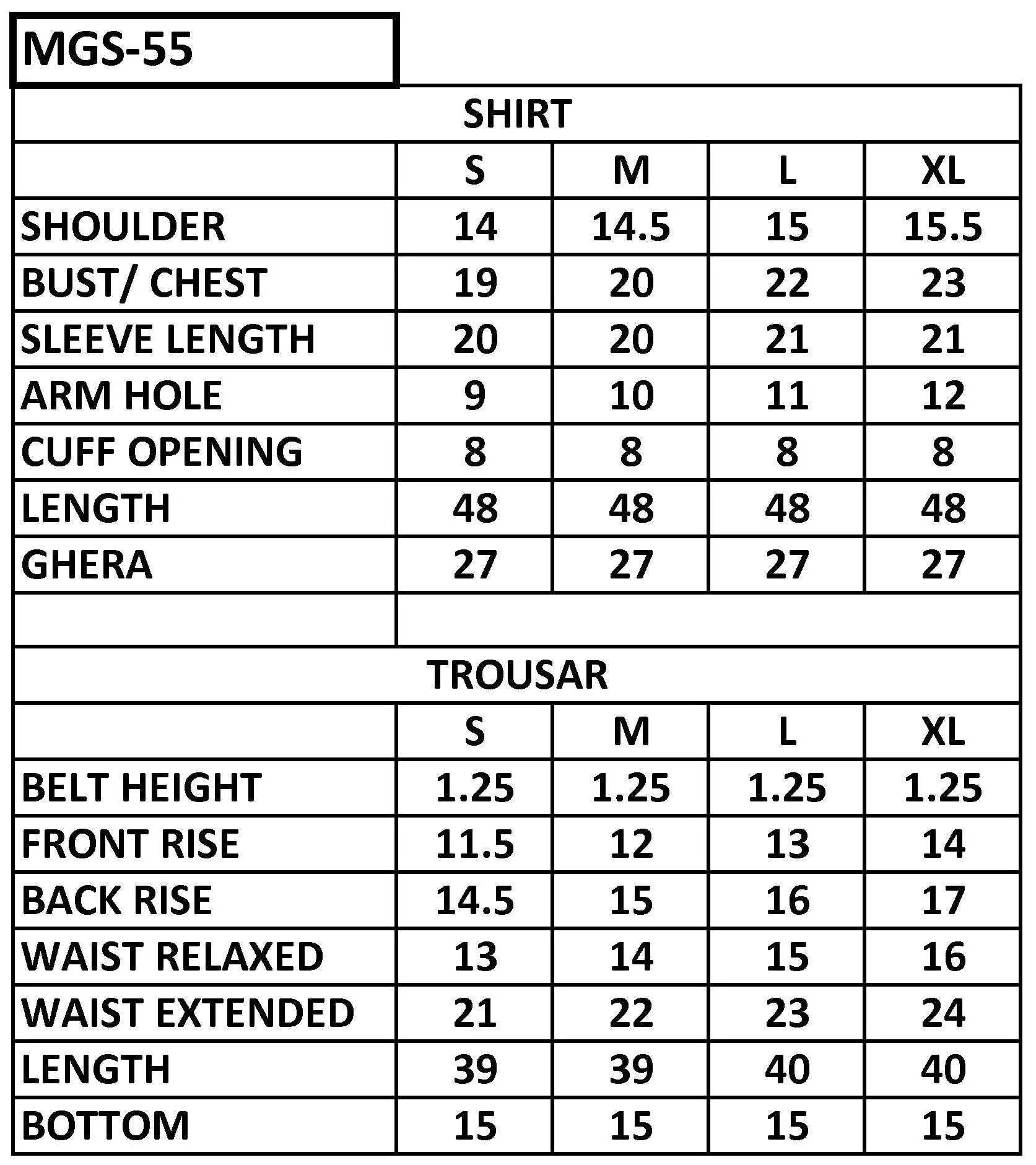 | Shoulder | 14 | 14.5 | 15 | 15.5 |