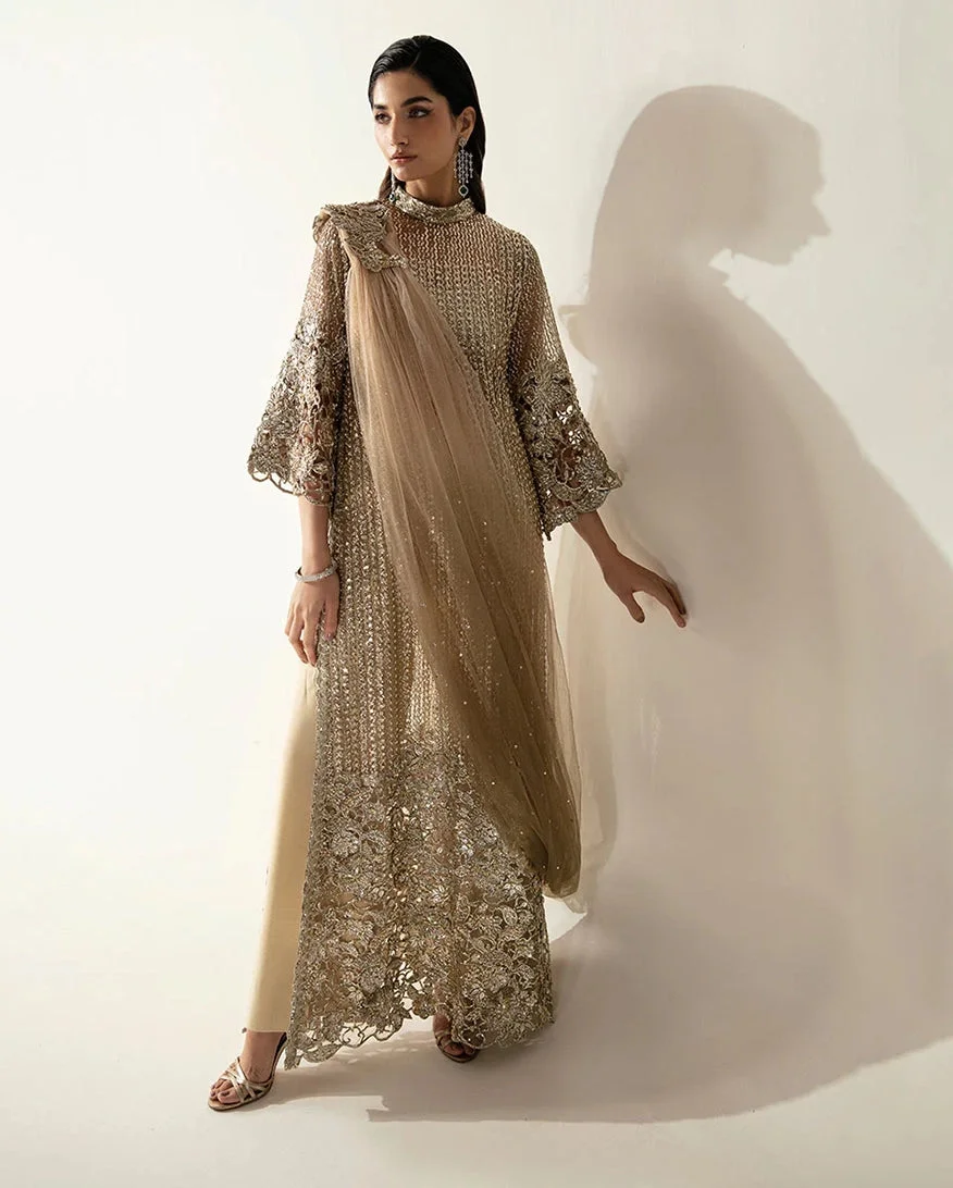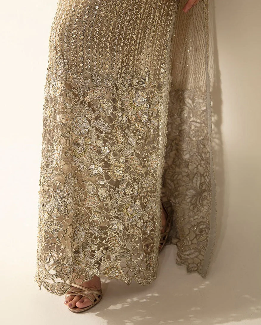 The Mushq Eve is a study in refined ornamentation. Every inch of the pale gold net surface is adorned with crystal and Swarovski-inspired embellishments that catch the light with every movement, creating a luminous, almost ethereal effect. The silhouette is designed to complement the modern Pakistani woman – graceful, structured, and unmistakably luxurious. This is authentic Mushq design at its finest, where each embellishment placement is intentional and each seam is executed with precision.