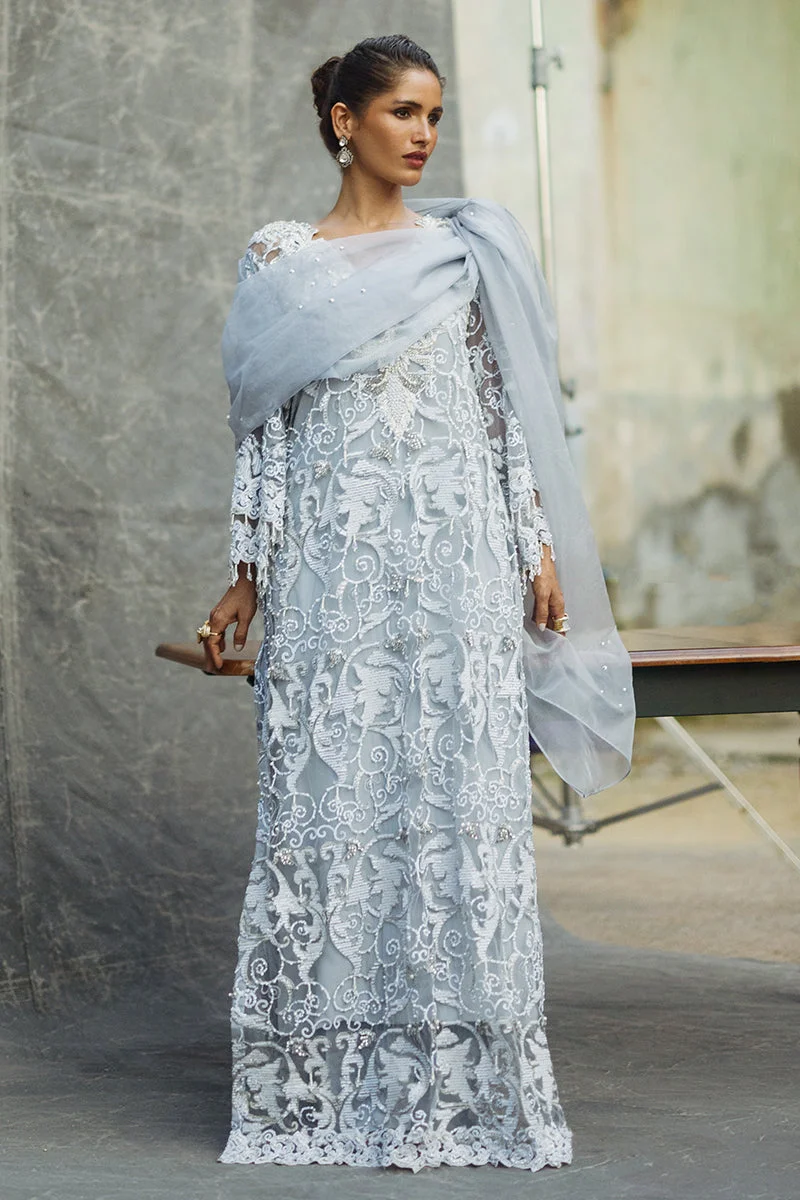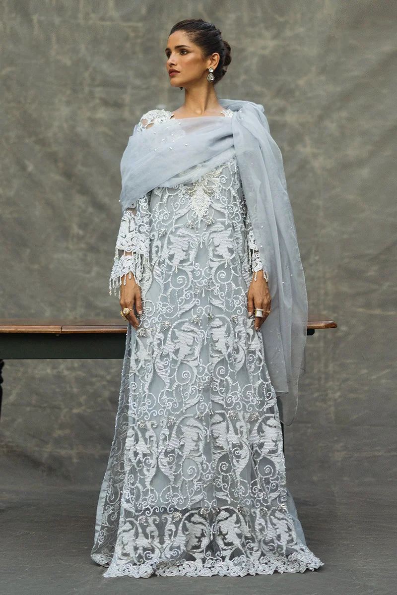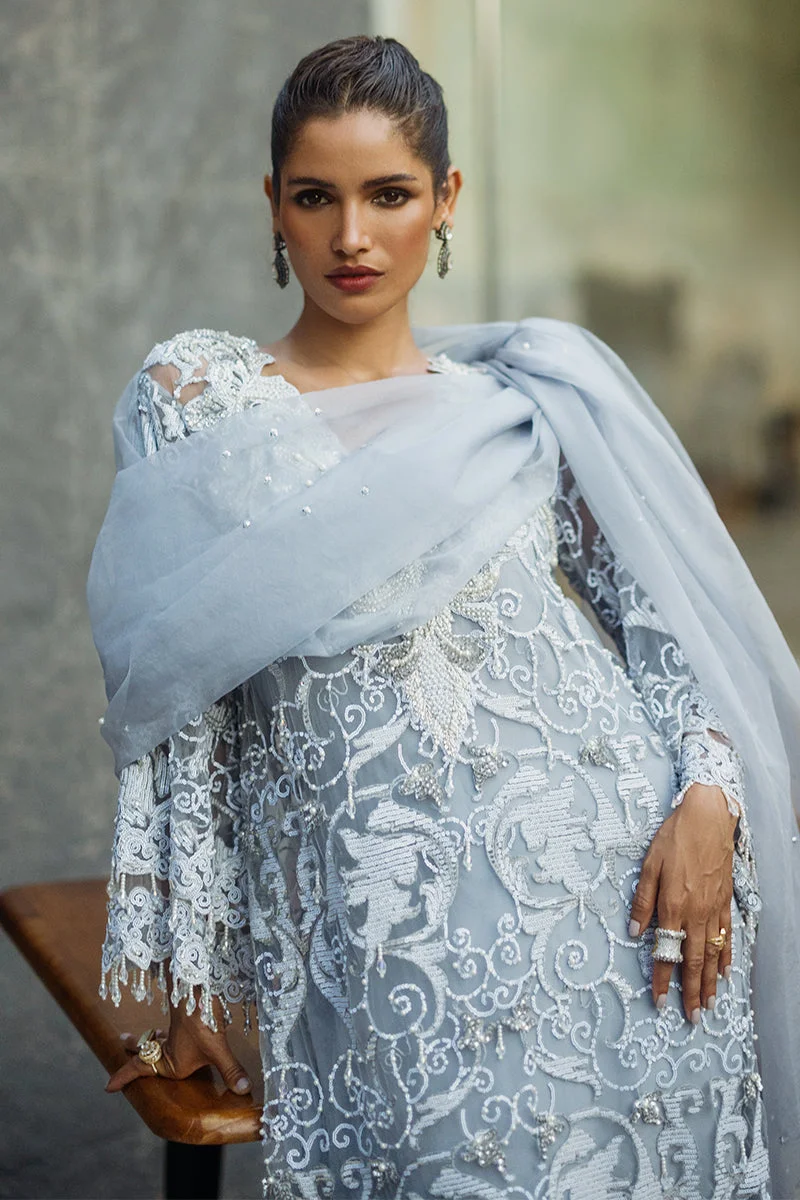Style Iris with statement gold or silver jewellery to complement the steel grey tones. Opt for strappy heels in nude or metallic tones to elongate the silhouette. A sleek updo or soft curls both pair perfectly with the embellished organza dupatta draped over one shoulder for a classic Pakistani formal look.