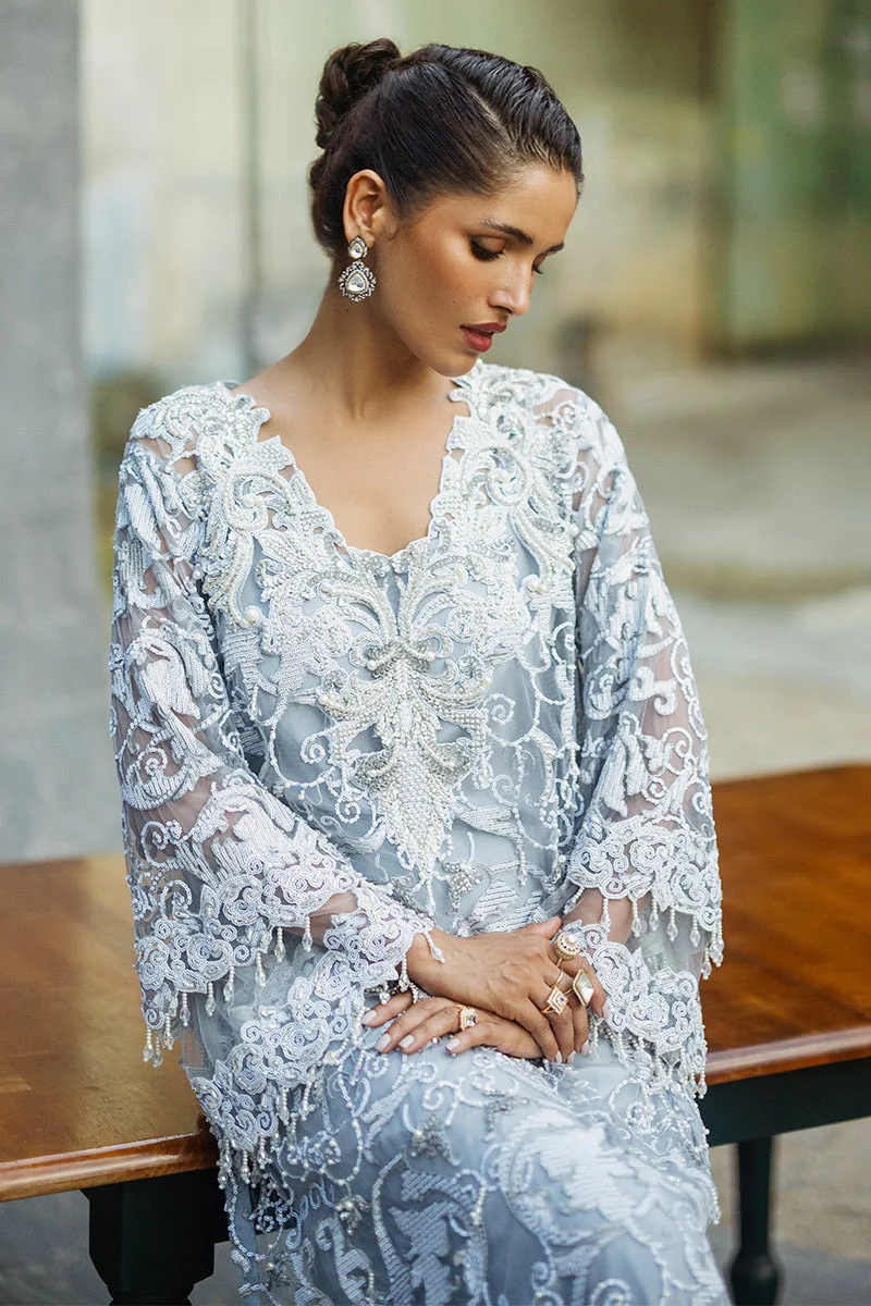 Iris is a testament to Mushq’s signature philosophy of blending timeless silhouettes with contemporary embellishment techniques. The deep steel grey palette lends a sophisticated, modern edge that transitions seamlessly from evening formals to festive celebrations.