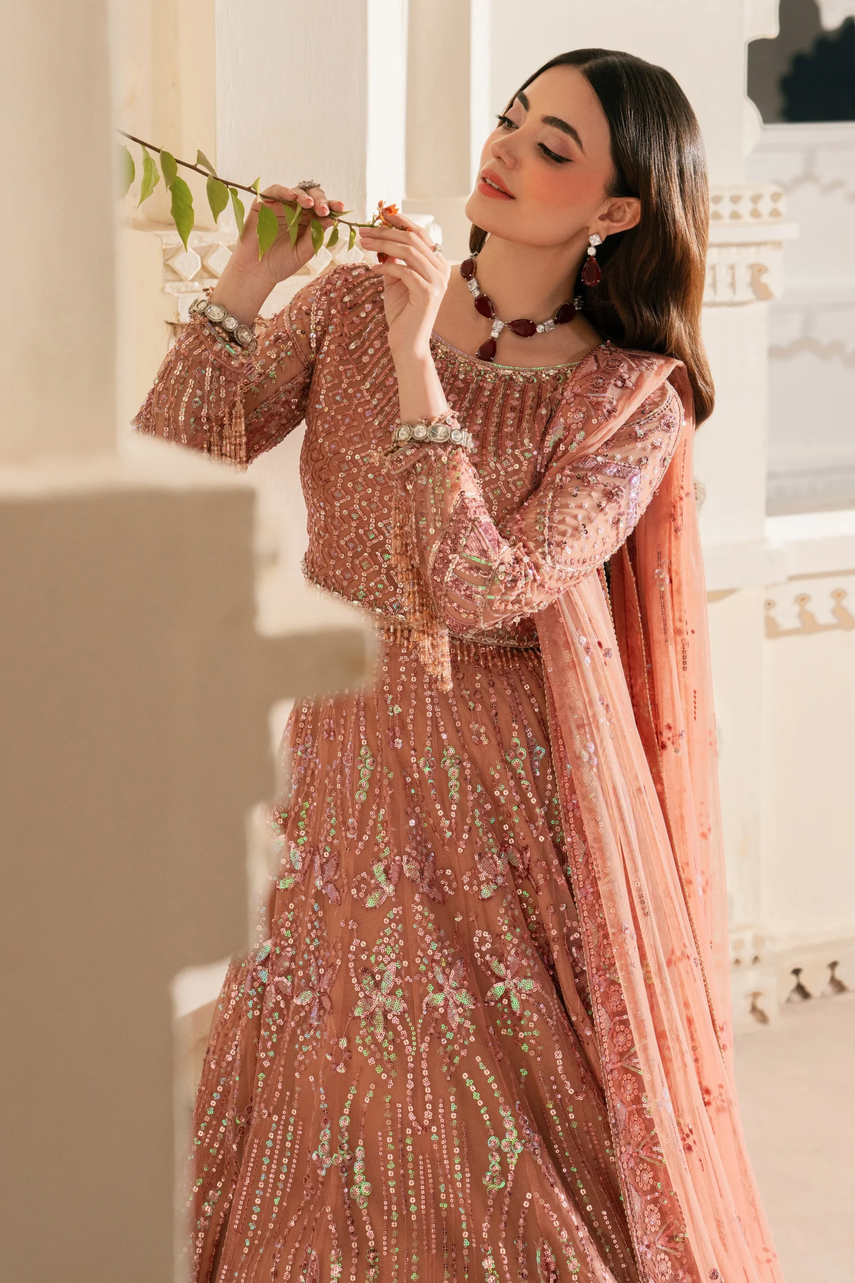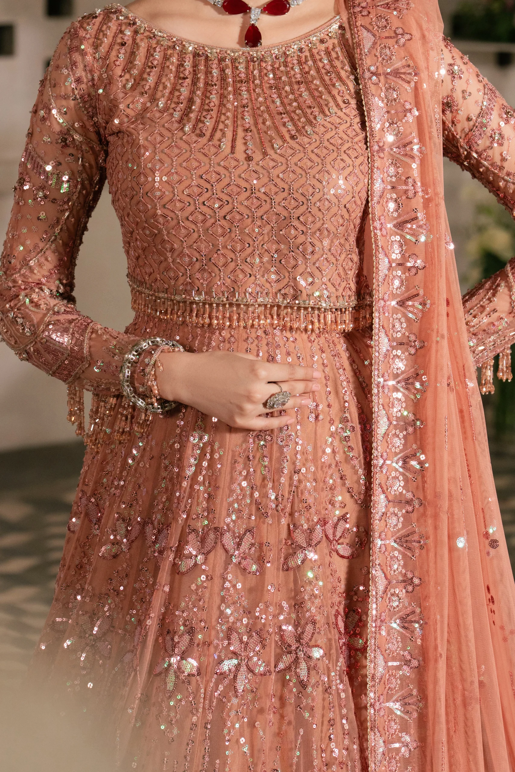 Pair the NAQSHI Patricia with statement gold or kundan jewellery to complement the peach tones. Opt for nude or champagne heeled sandals to elongate the silhouette. Drape the net dupatta over one shoulder for a classic bridal-inspired look, or wear it as a shawl for a modern formal finish.