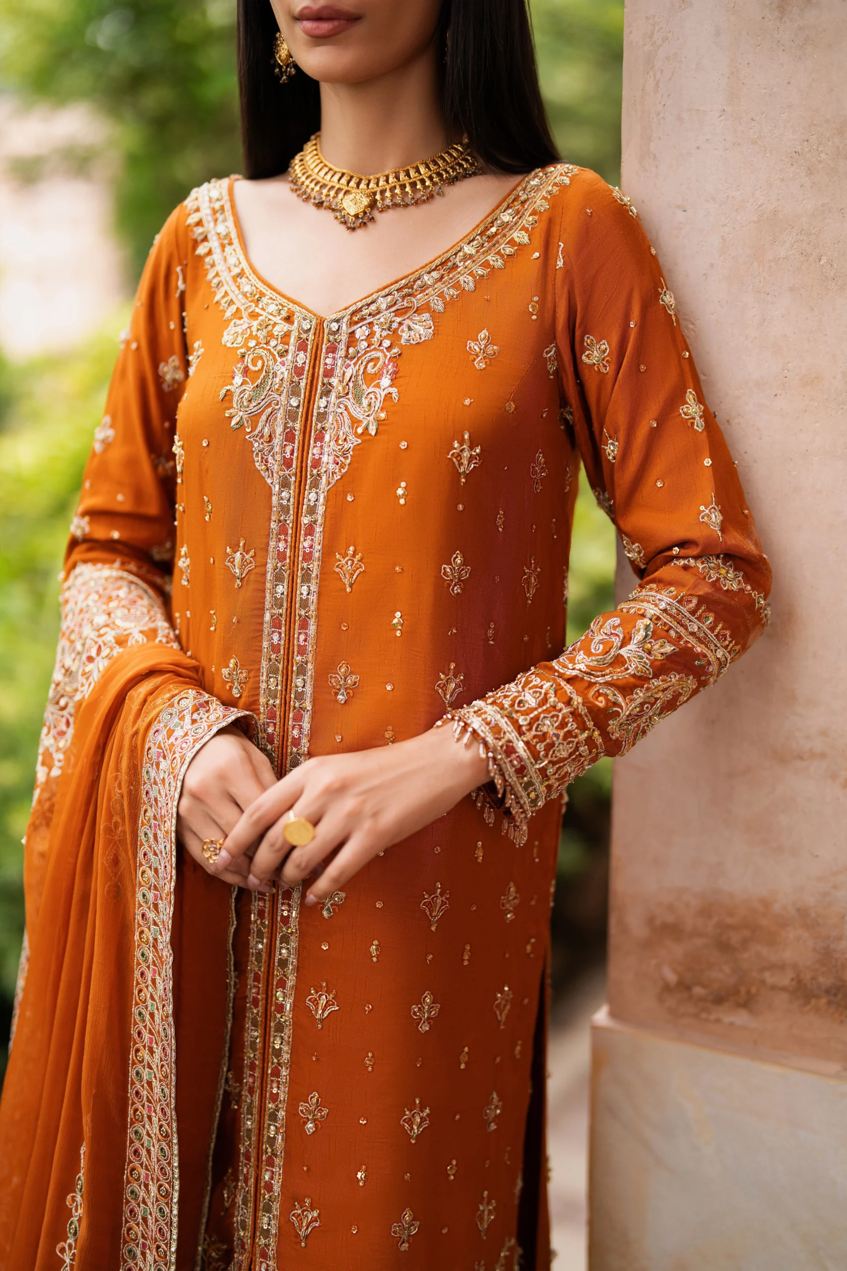 Introducing the NAQSHI Gul-e-Farosh — a breathtaking addition to the world of Pakistani formal wear, designed for women who command attention with effortless grace. Rendered in sumptuous Indian raw silk in a rich rust hue, this gown is a testament to NAQSHI’s mastery of luxury embellishment and silhouette design. Whether you’re attending a formal soirée, a walima, or an upscale dinner event, this piece delivers timeless elegance with every step.