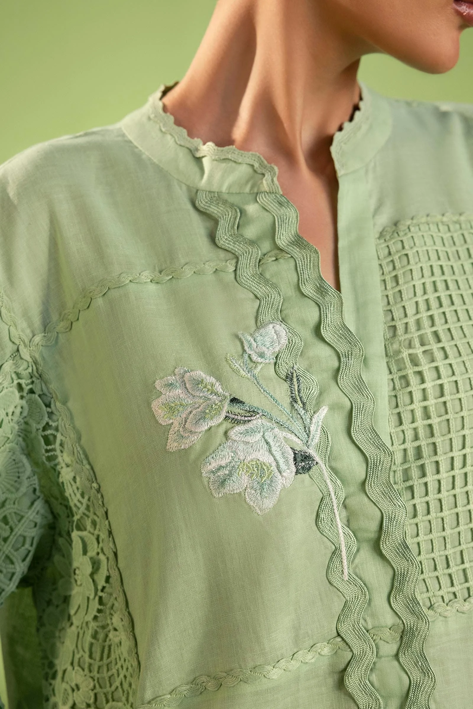 Pair this authentic Sana Safinaz ensemble with embroidered khussas or strappy heels for a polished look. Add a contrast organza or chiffon dupatta in ivory or gold to complement the green palette beautifully. Minimalist gold jewellery — think jhumkas and a statement cuff — will complete the look with grace. Note: Slip and dupatta are not included.
