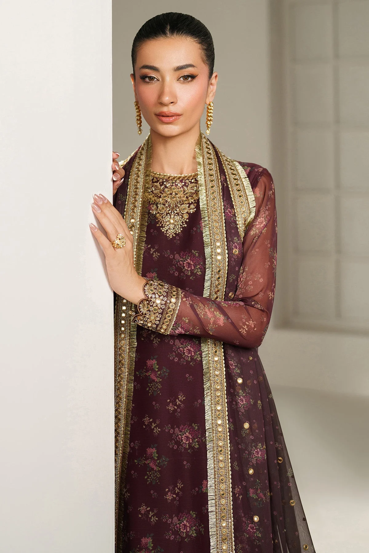Crafted from premium chiffon and raw silk, this suit offers a luxurious hand-feel and elegant drape that is immediately recognizable as high-quality Pakistani couture. Chiffon is celebrated for its lightweight, breathable nature — ideal for long celebrations — while the raw silk bottom adds a structured, opulent contrast that elevates the overall look.