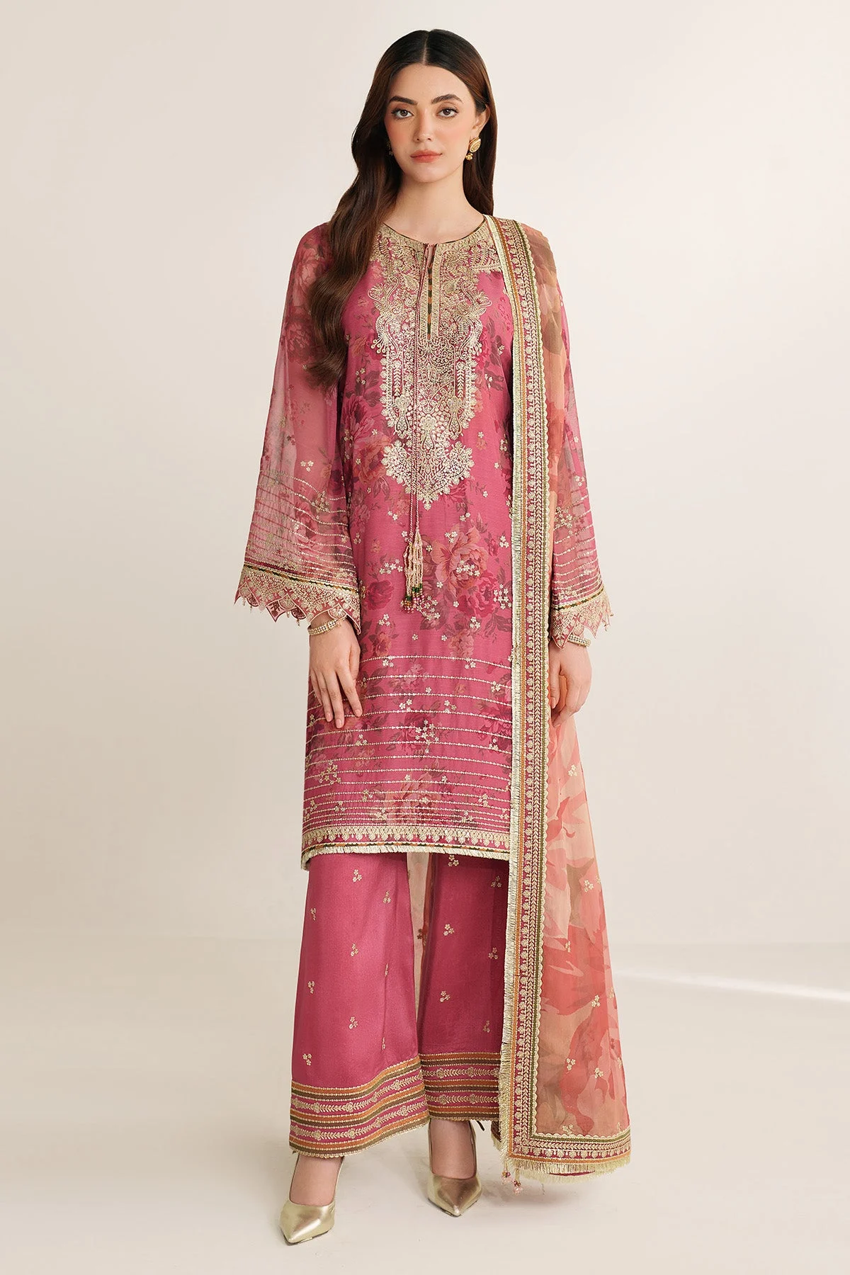 The centerpiece of this ensemble is a multi-toned embroidered chiffon shirt featuring delicately worked embroidered motifs in rich, festive tones. The embroidery is precisely crafted to catch the light beautifully, making it ideal for evening events and celebrations. The coordinating embroidered chiffon dupatta mirrors the shirt’s artistry, completing the look with graceful elegance.