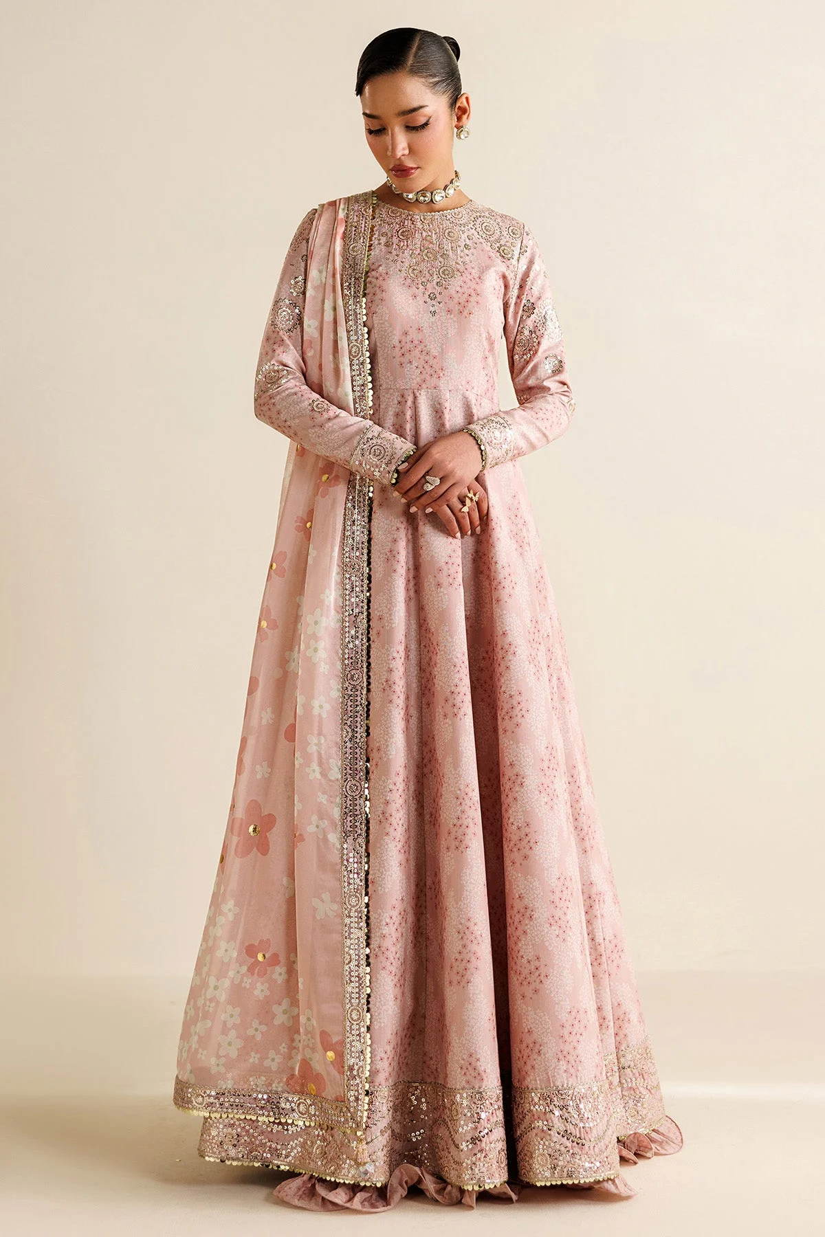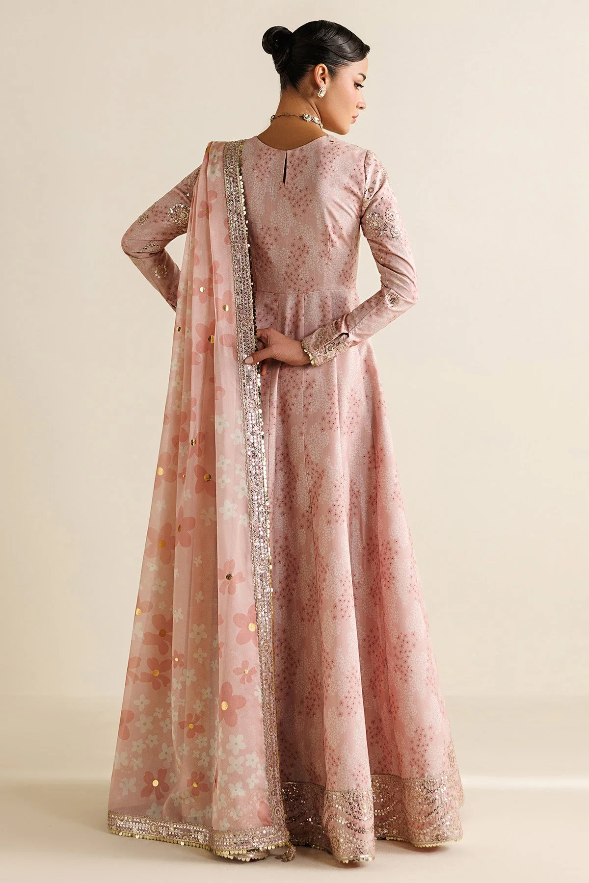 This breathtaking ensemble is a celebration of meticulous embroidery and refined digital printing. The embroidered front yoke and sleeves are the focal points, showcasing delicate threadwork that speaks to Pakistani couture at its finest. Ornate embroidered borders frame the front, back, and sleeves, while the digitally printed front and back panels bring a modern artistic sensibility to a classically structured silhouette. The cohesive back yoke and bottom further enhance the garment’s polished, head-to-toe elegance.