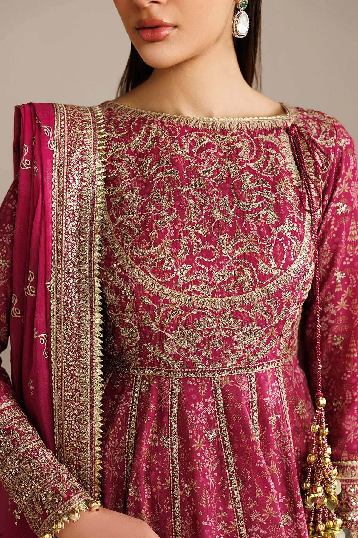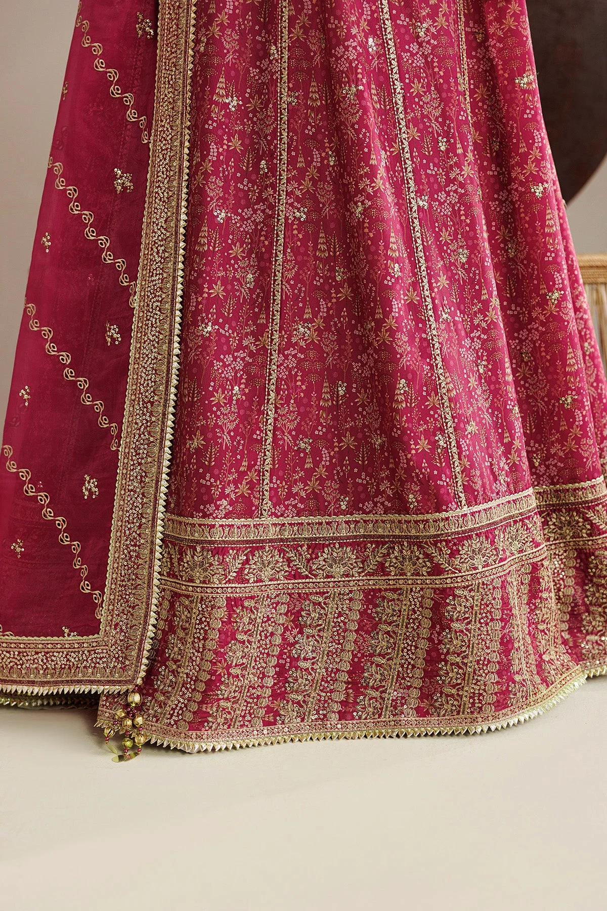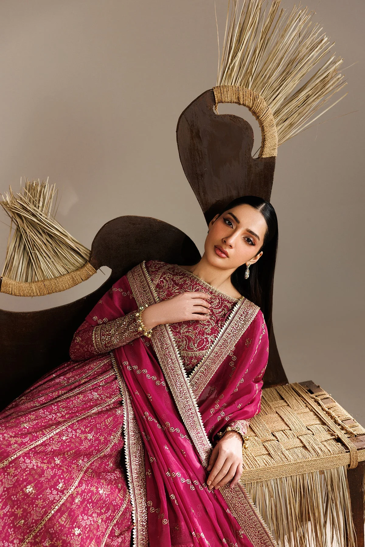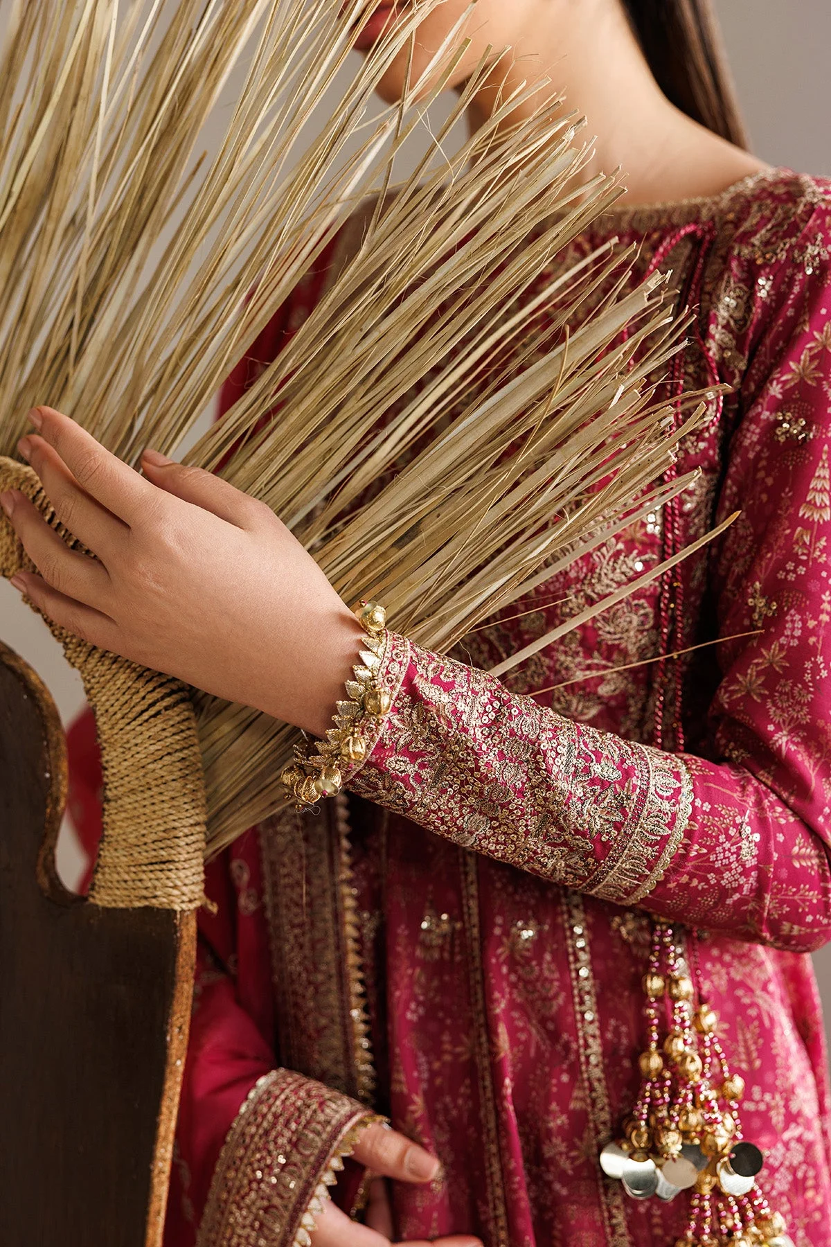 The raw silk fabric lends a natural sheen and graceful drape that elevates this suit from merely beautiful to truly luxurious. Paired with an embroidered organza dupatta, the ensemble achieves the perfect balance of structure and ethereal lightness — a combination beloved in Pakistani formal fashion.