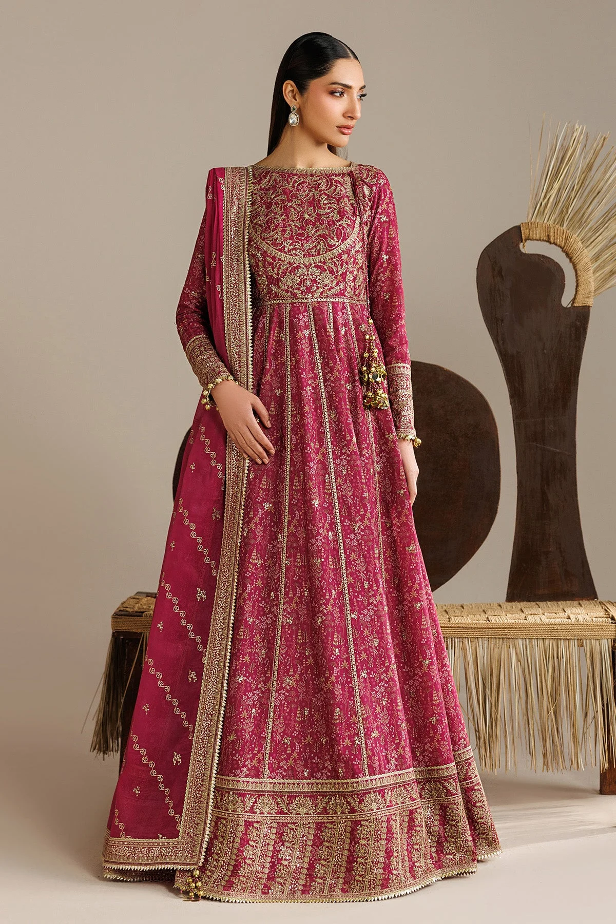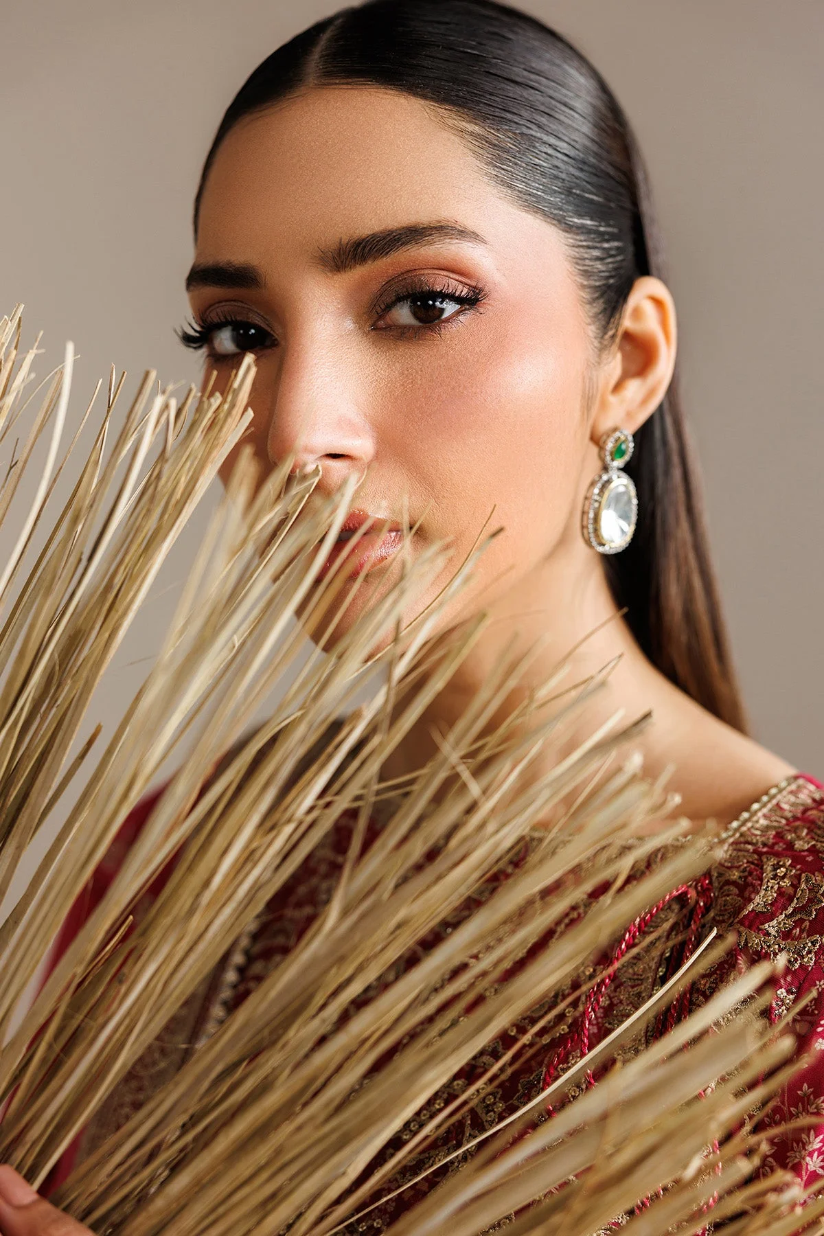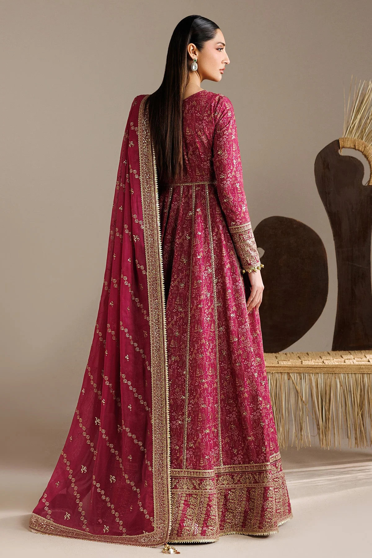 The raw silk fabric lends a natural sheen and graceful drape that elevates this suit from merely beautiful to truly luxurious. Paired with an embroidered organza dupatta, the ensemble achieves the perfect balance of structure and ethereal lightness — a combination beloved in Pakistani formal fashion.
