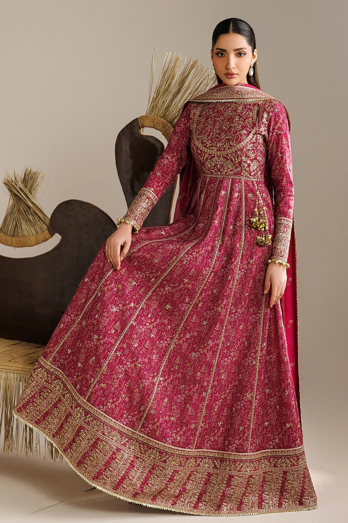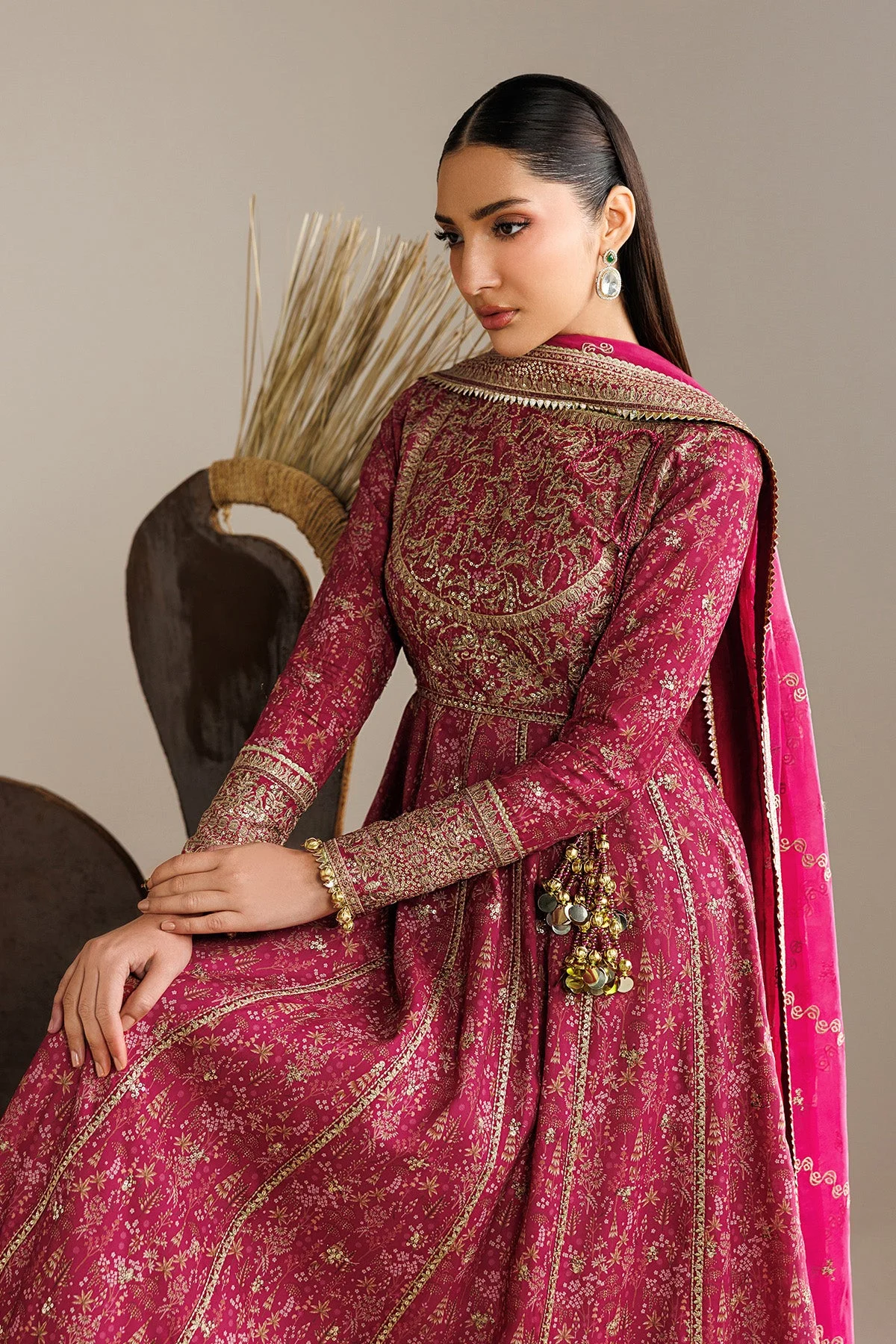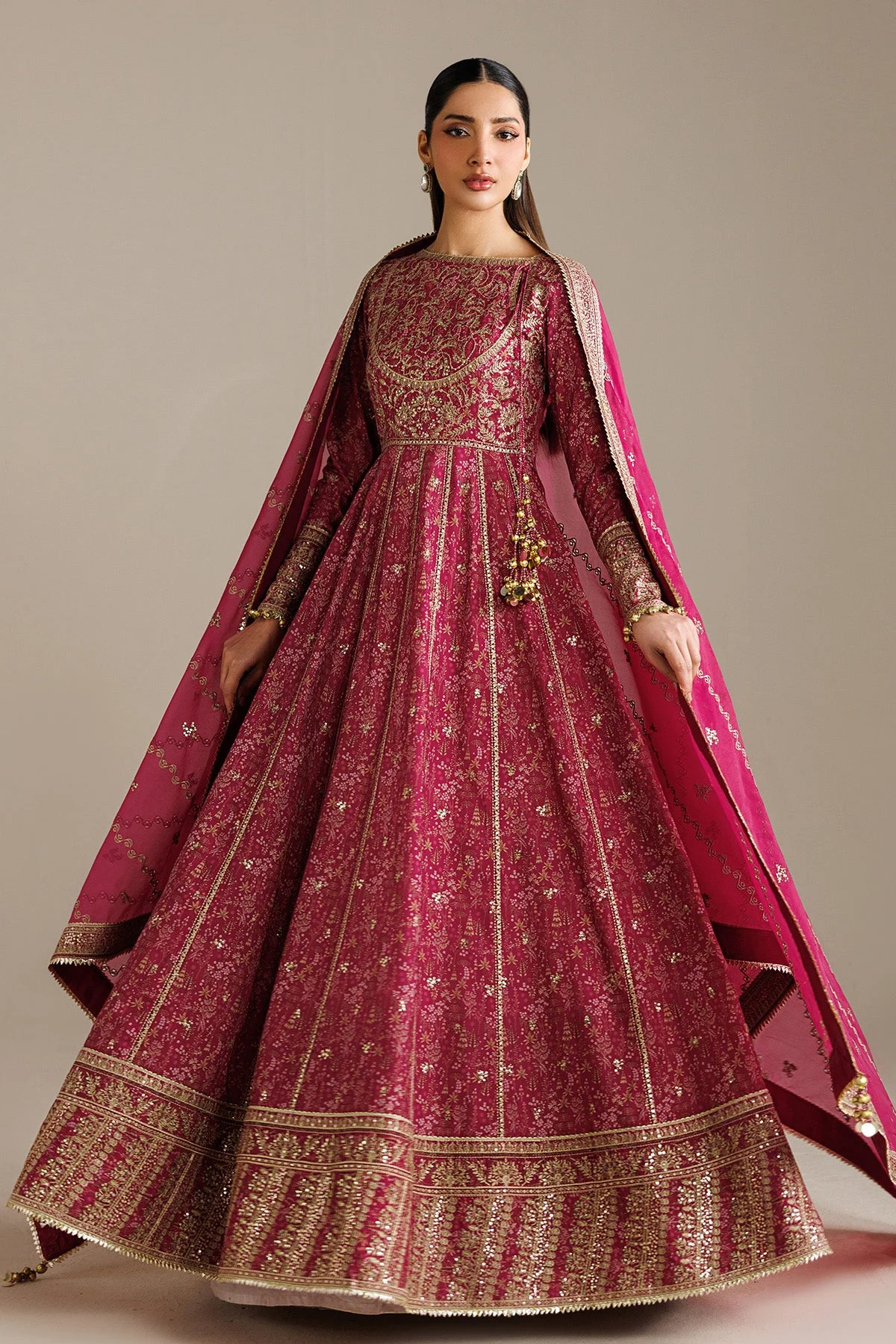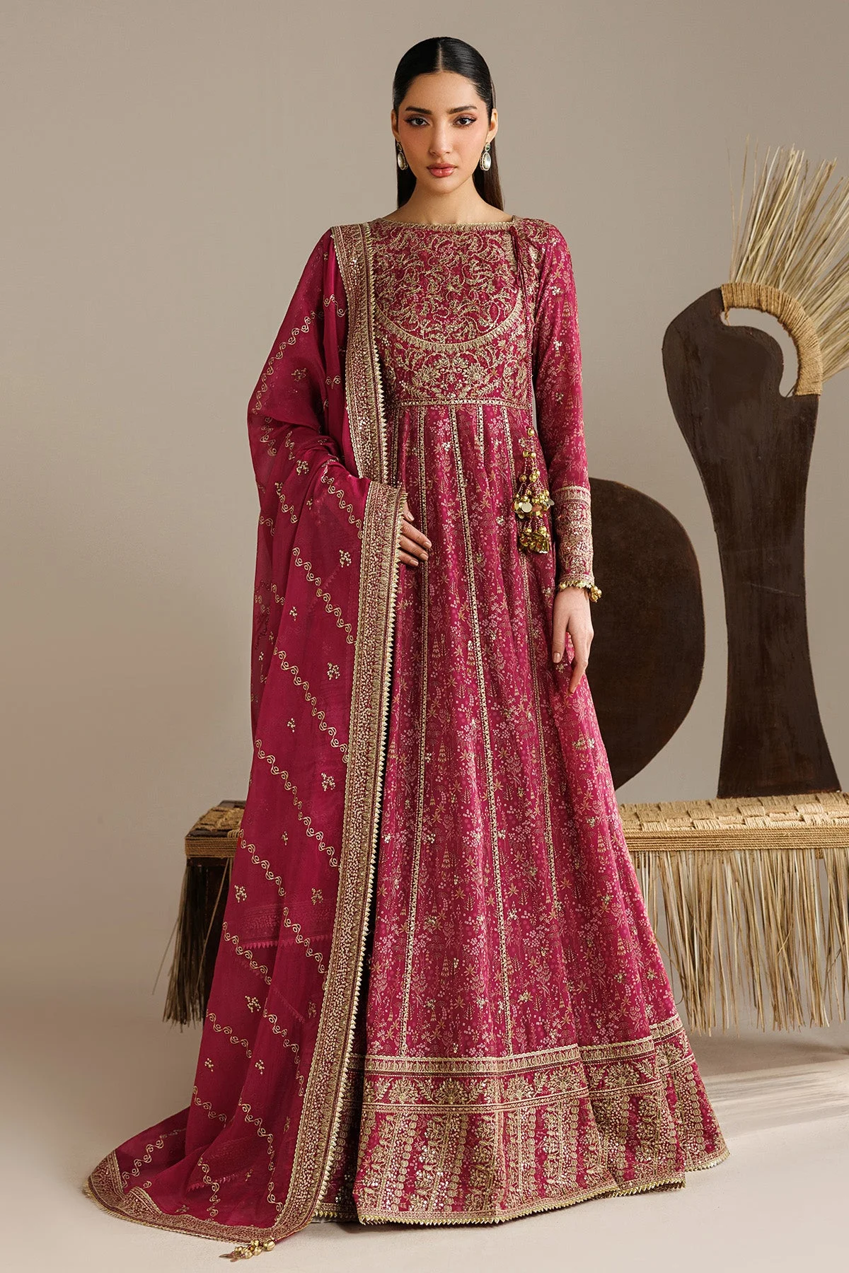 The raw silk fabric lends a natural sheen and graceful drape that elevates this suit from merely beautiful to truly luxurious. Paired with an embroidered organza dupatta, the ensemble achieves the perfect balance of structure and ethereal lightness — a combination beloved in Pakistani formal fashion.