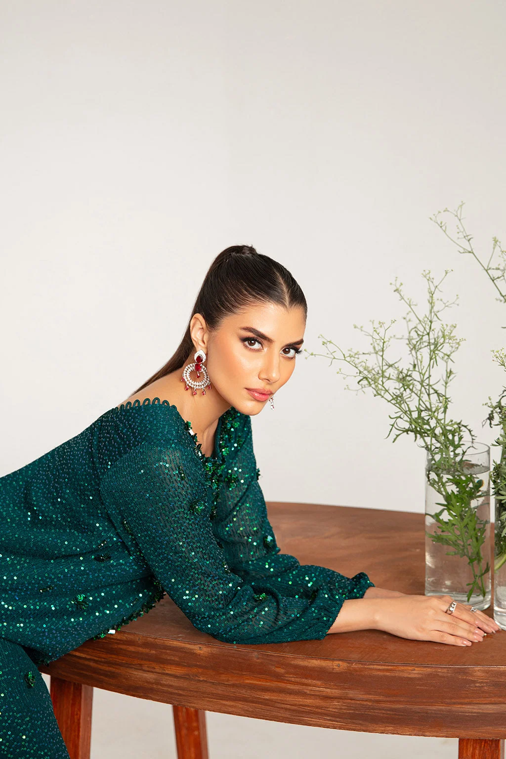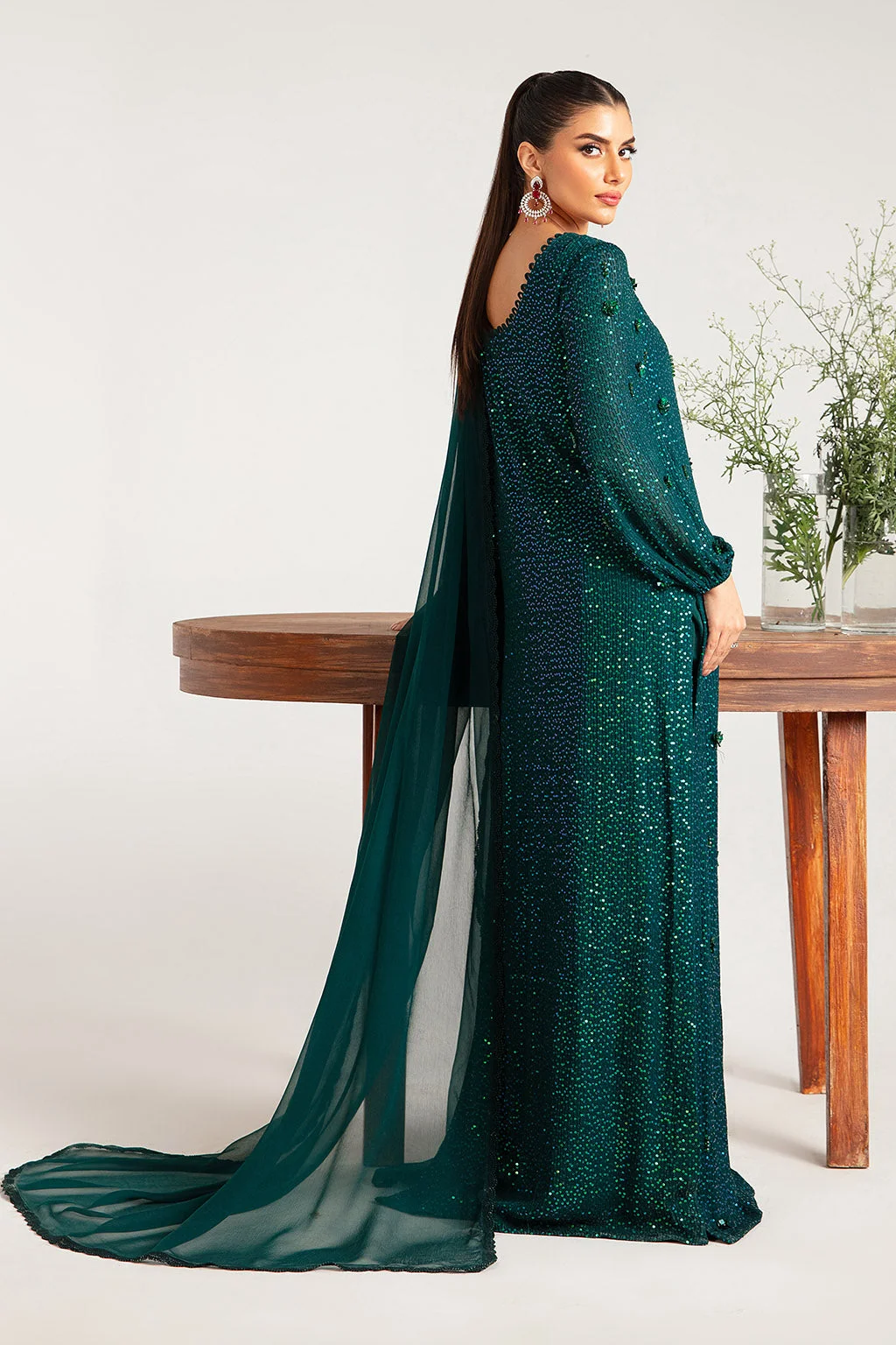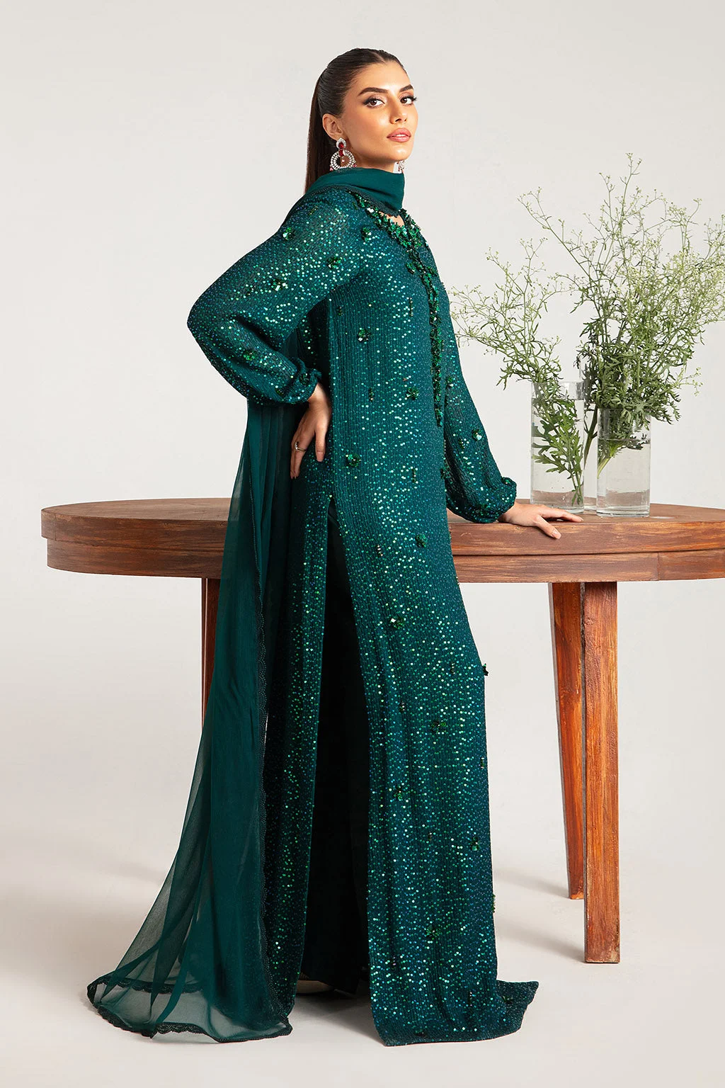 Every inch of this stunning ensemble has been thoughtfully crafted to make you shine. The fully sequined green long shirt catches the light beautifully, while the hand-embroidered neckline and sleeves add a refined, couture-quality finish. The rich emerald-green tone is bold yet sophisticated, making it one of the most sought-after shades in Pakistani designer fashion this season.