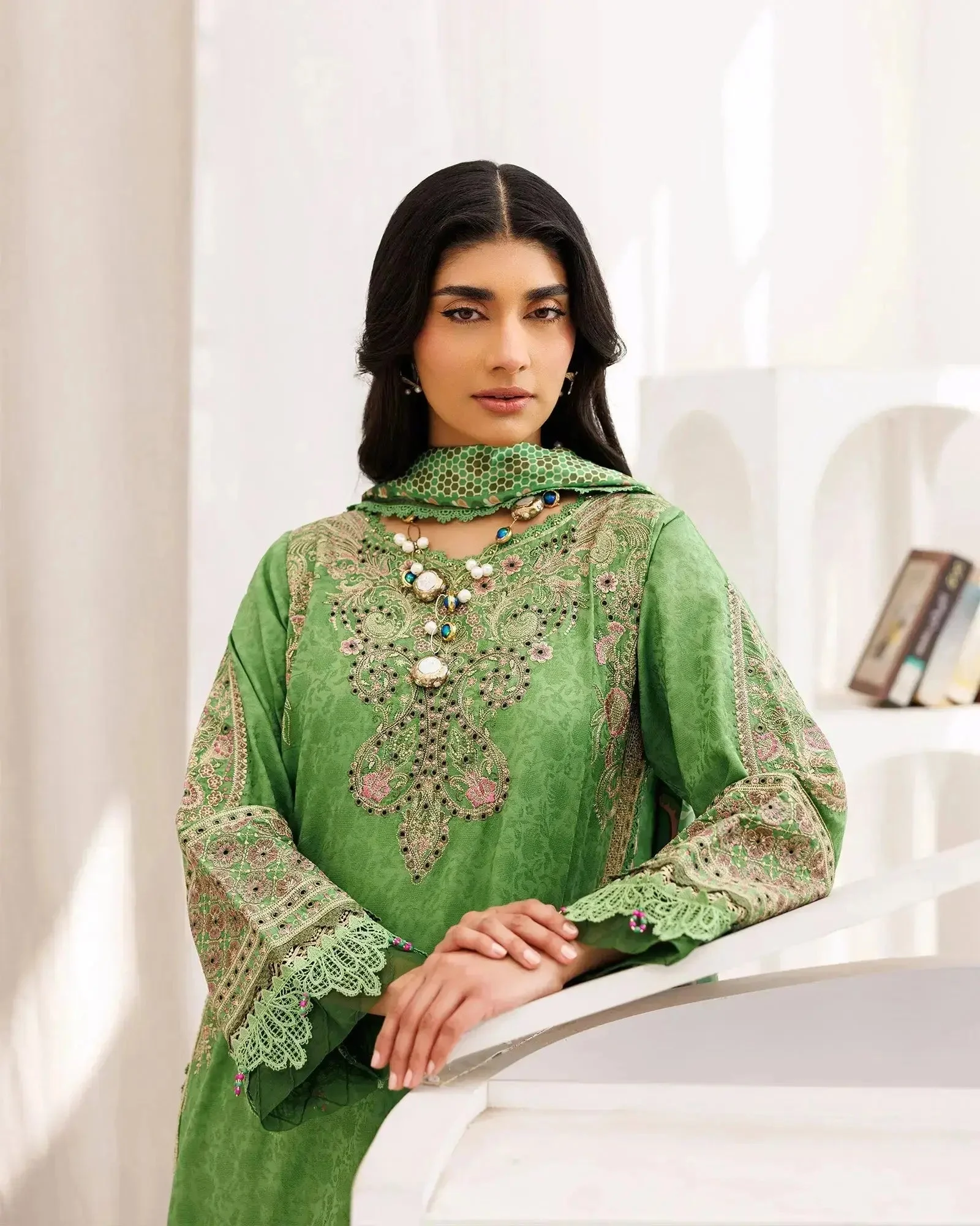 Discover the elegance of Sha Posh Textile with this exquisite Jacquard Cotton 3-piece party wear suit, crafted for women who appreciate the artistry of authentic Pakistani designer fashion. The rich green hue, paired with tilla embroidery and a flowing silk dupatta, makes this ensemble a breathtaking choice for those seeking original Sha Posh collection pieces that command attention at every gathering.