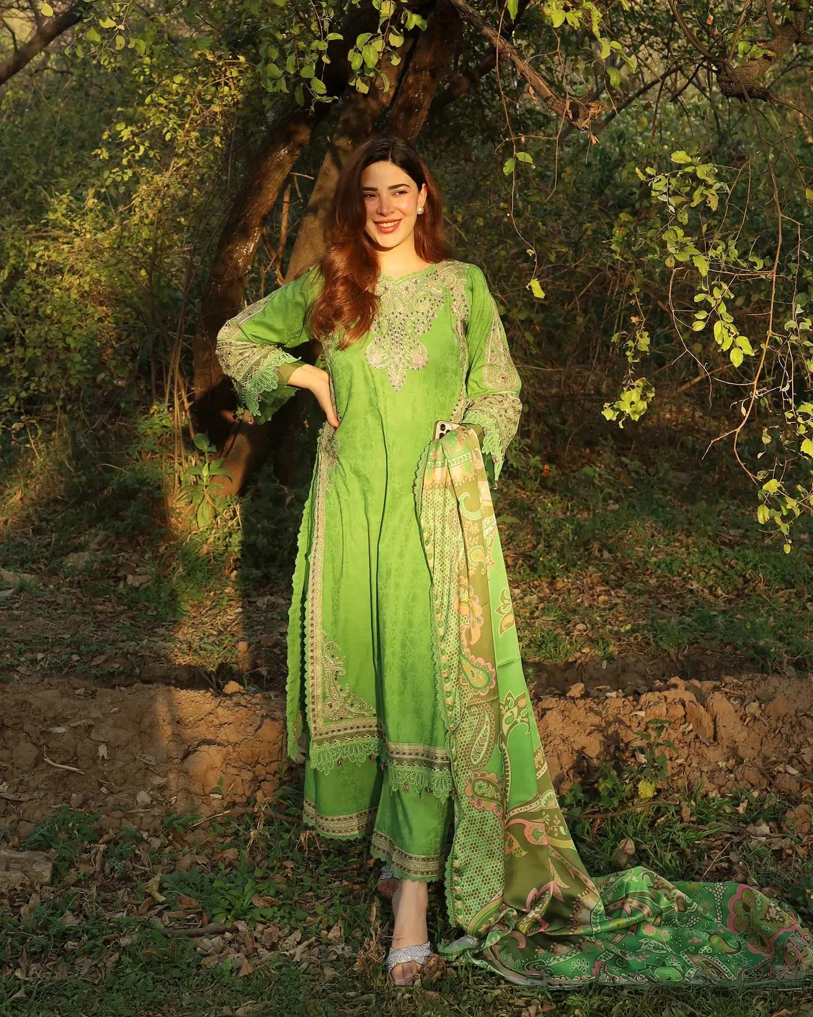 Style this Sha Posh Textile party wear suit with gold jhumkas and strappy heeled sandals for a classic South Asian evening look. Add a statement clutch in gold or ivory to complement the green tones and tilla embroidery. Keep hair sleek and accessories minimal to let the embroidery take centre stage.
