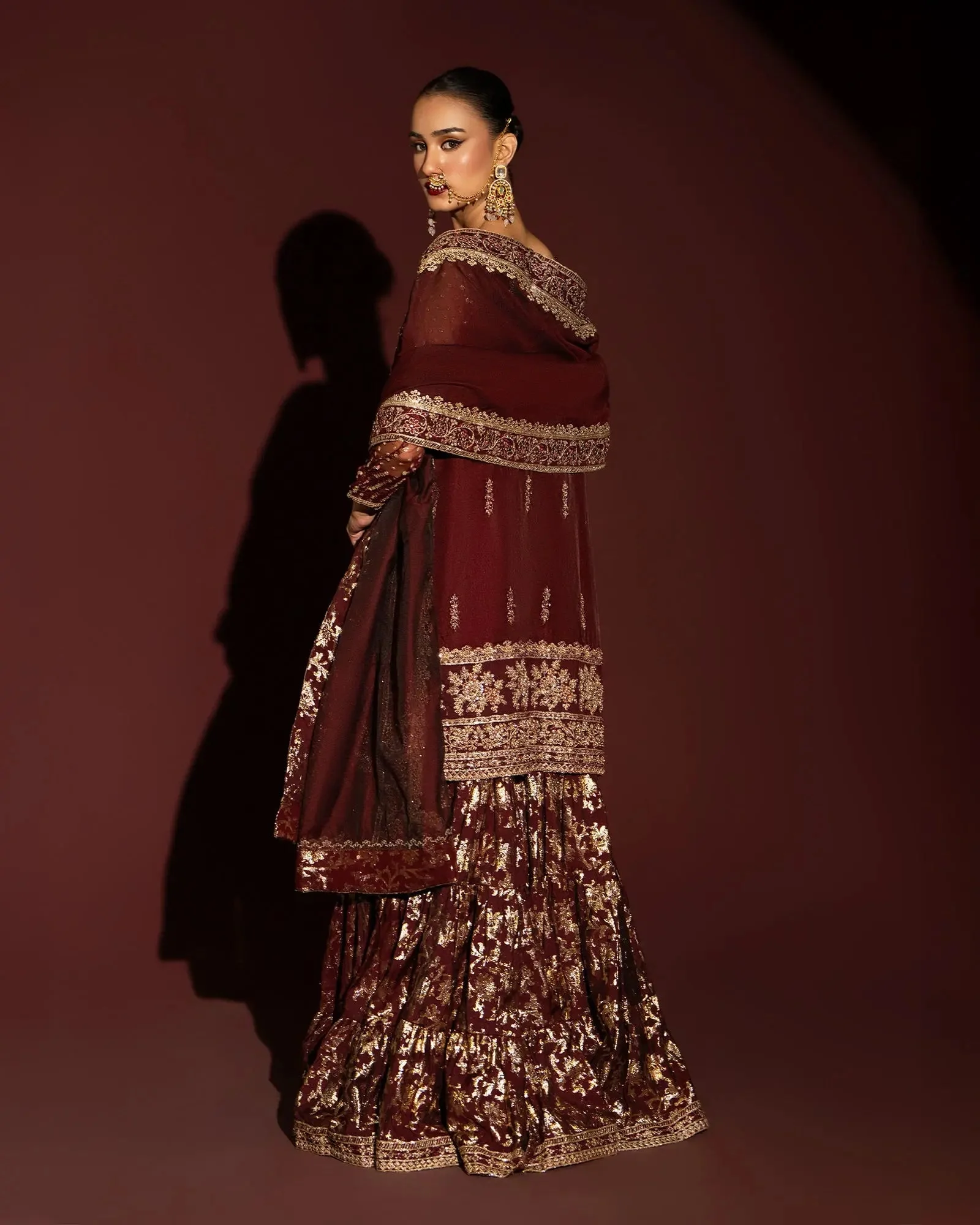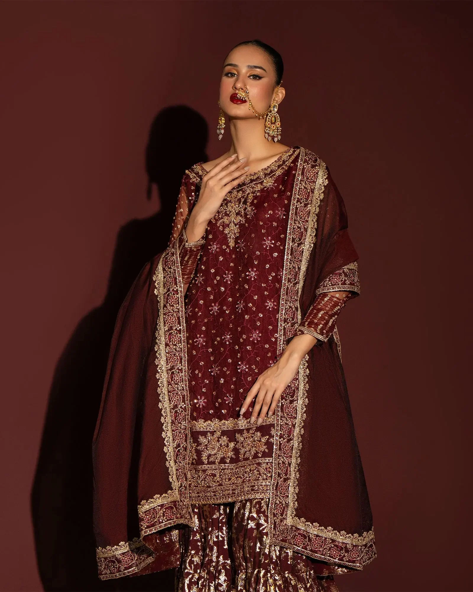 The rich maroon palette radiates warmth and regality, making it an ideal choice for wedding functions and formal festive events. The ensemble features delicate embellishments and surface work that reflect the hallmark artistry of authentic Sha Posh Textile craftsmanship. The flowing silhouette of the gharara paired with the structured organza shirt creates a timeless, camera-ready look perfect for every celebration.