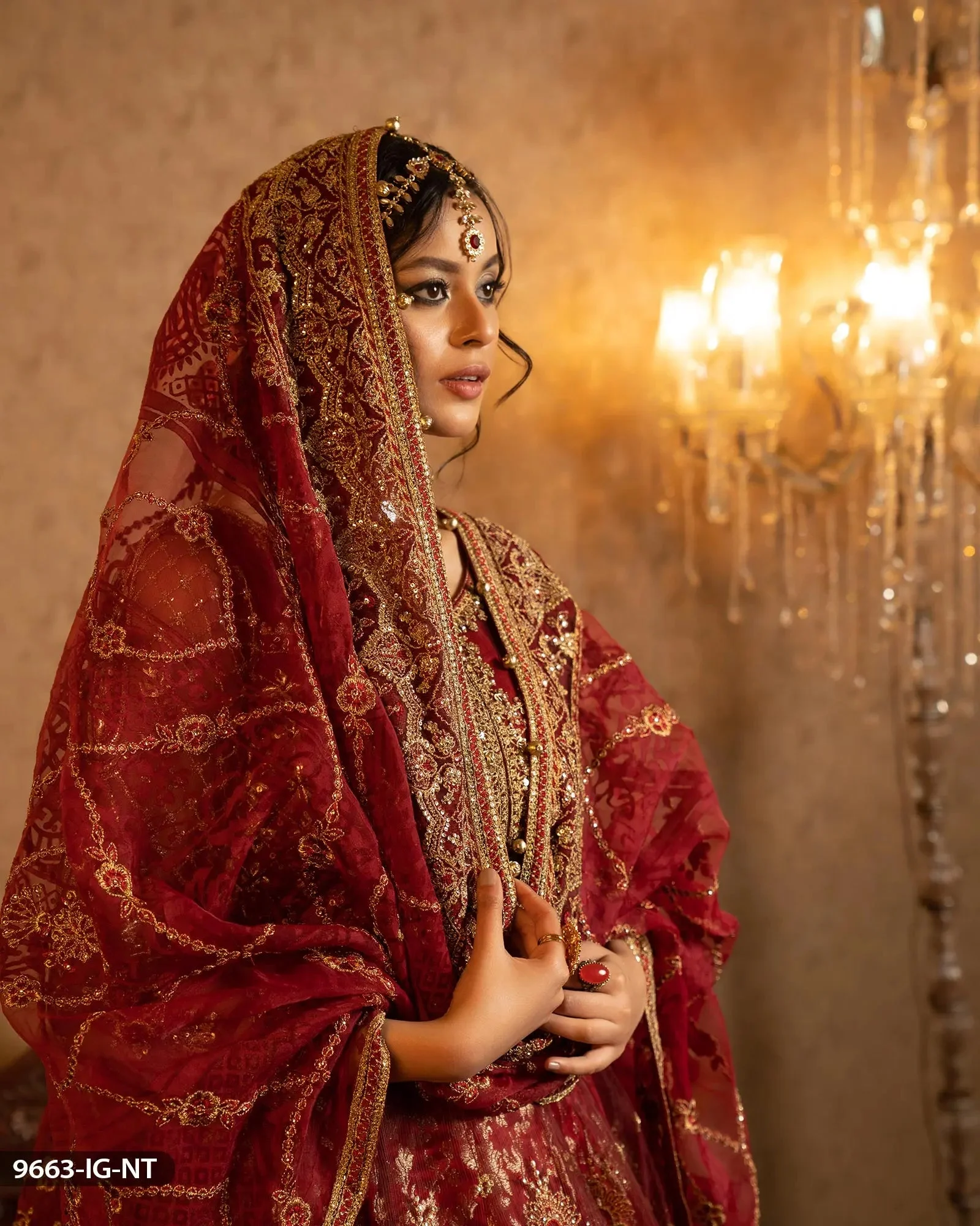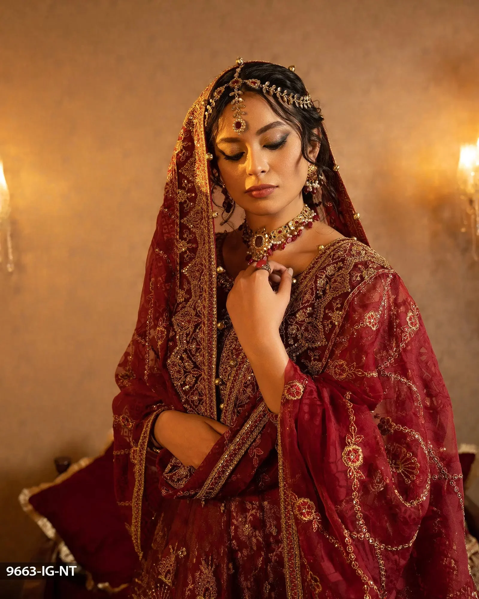 This show-stopping frock with lehenga silhouette is a celebration of intricate craftsmanship. The flowing Net shirt is adorned with fine embellishments and detailed tilla embroidery work, while the structured Jamawar lehenga adds a rich, heritage dimension to the overall look. The complementary Organza dupatta completes the ensemble with effortless grace. Available in two distinctive colorways — a deep, romantic Maroon and a refreshing, eye-catching Ferozi — each version is a statement in its own right.