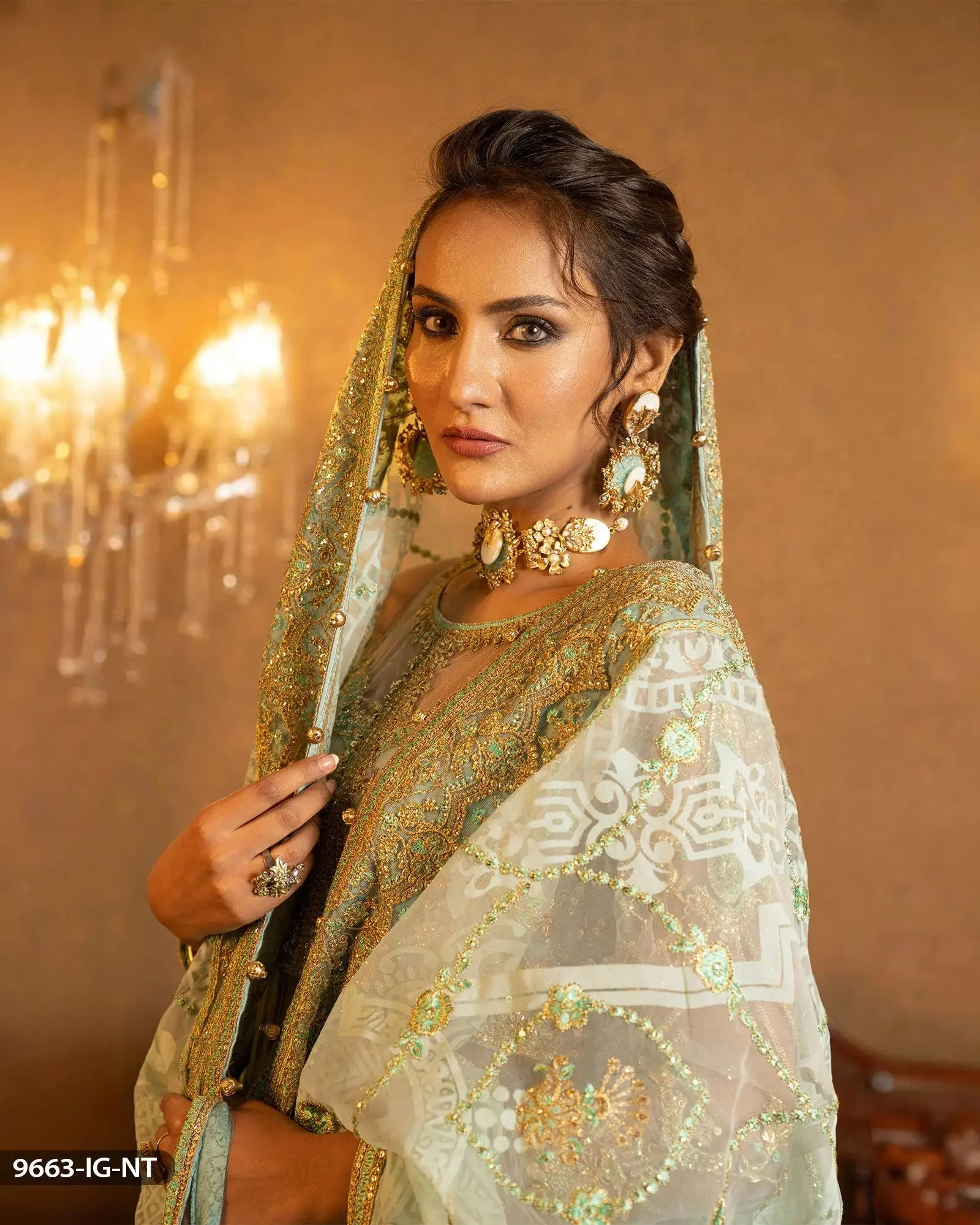 Pair this frock lehenga with statement jhumkas and a classic clutch for a Barat or Walima look. For Mehndi or Eid events, opt for lighter jewelry to let the Ferozi colorway shine. High heels or embroidered khussa footwear both complement the silhouette beautifully. Style the Organza dupatta draped over one shoulder for a modern, editorial finish.