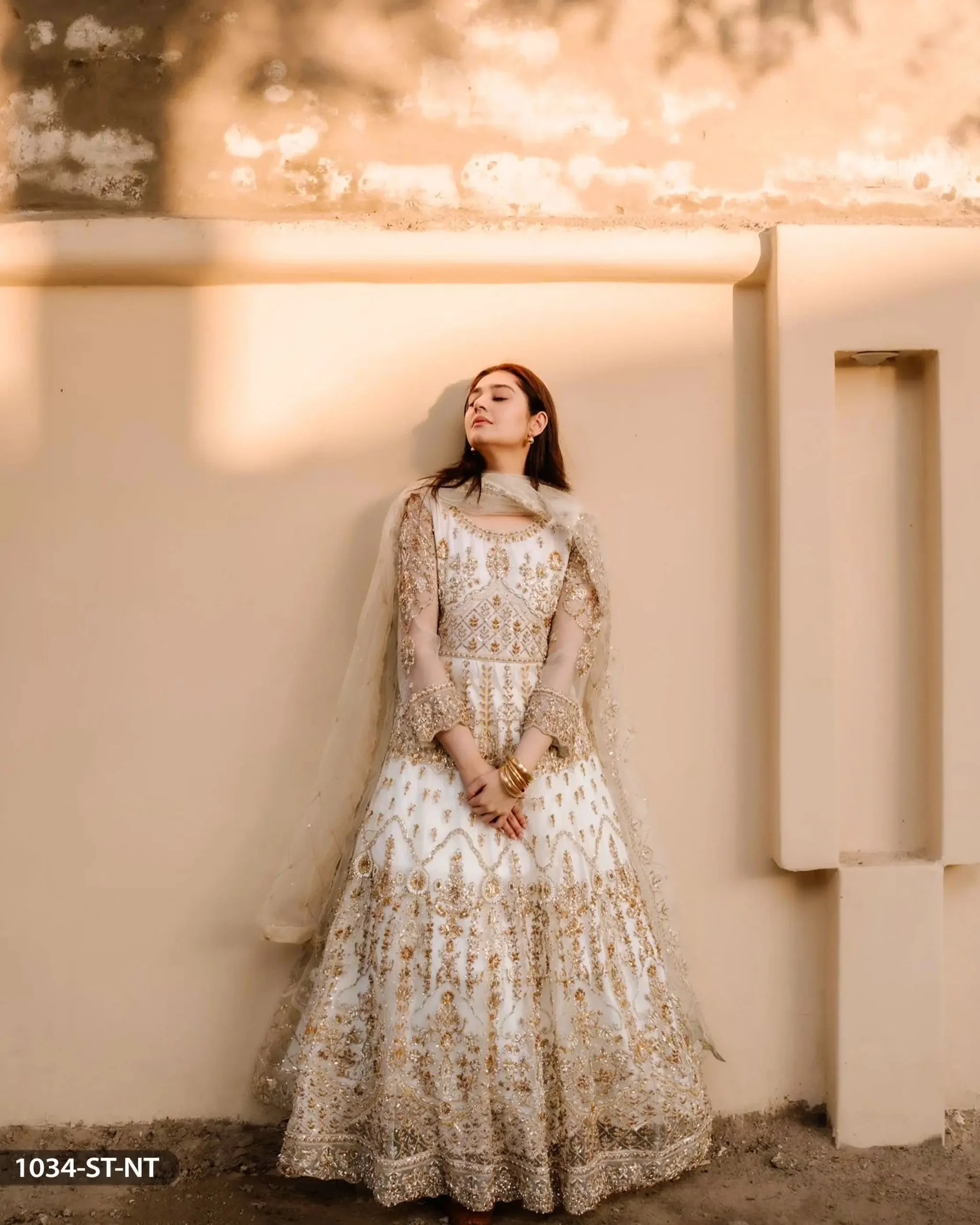 Pair this Off White maxi with statement gold jewellery — chandelier earrings and a layered choker work beautifully with the tilla embroidery. Opt for nude or champagne heels to elongate the silhouette. A subtle smoky eye and a sleek updo will allow the intricate embellishments to take centre stage.