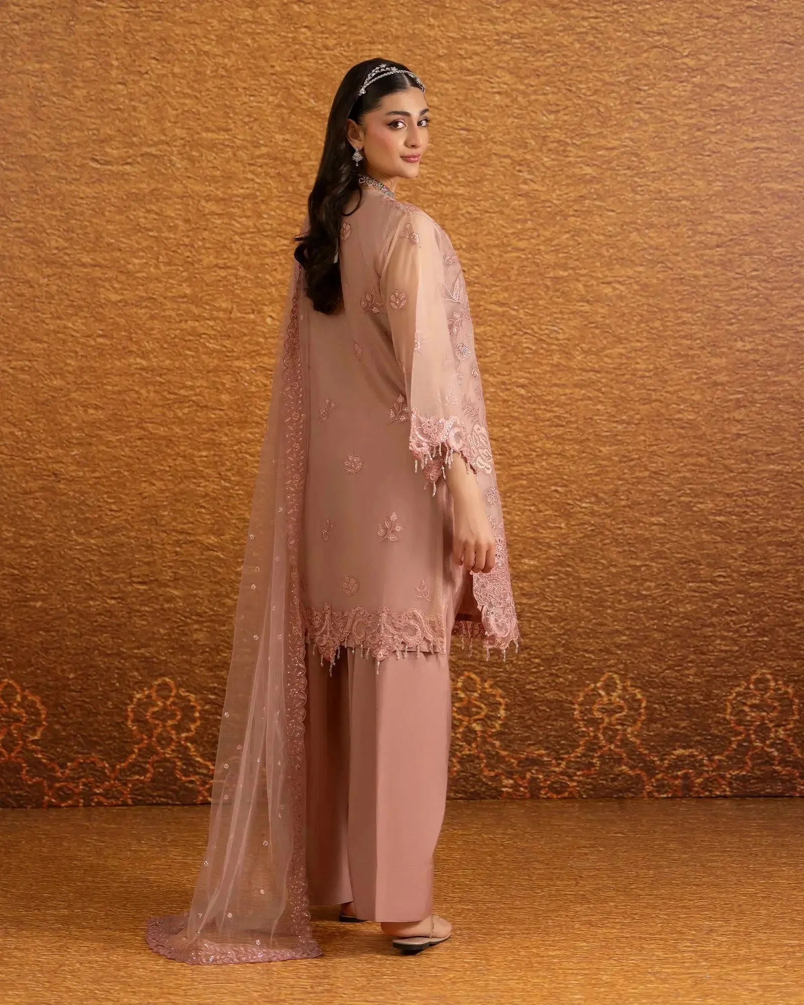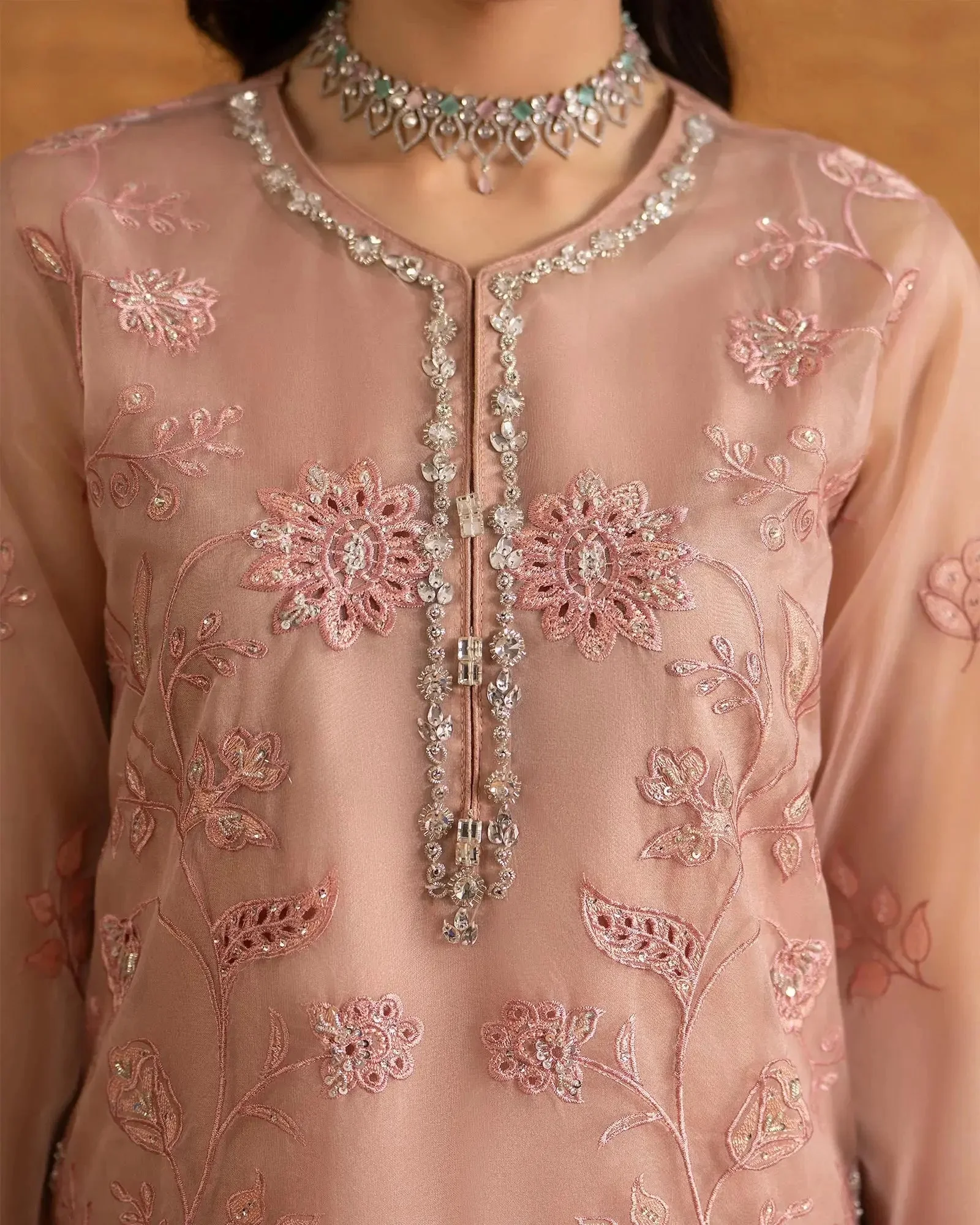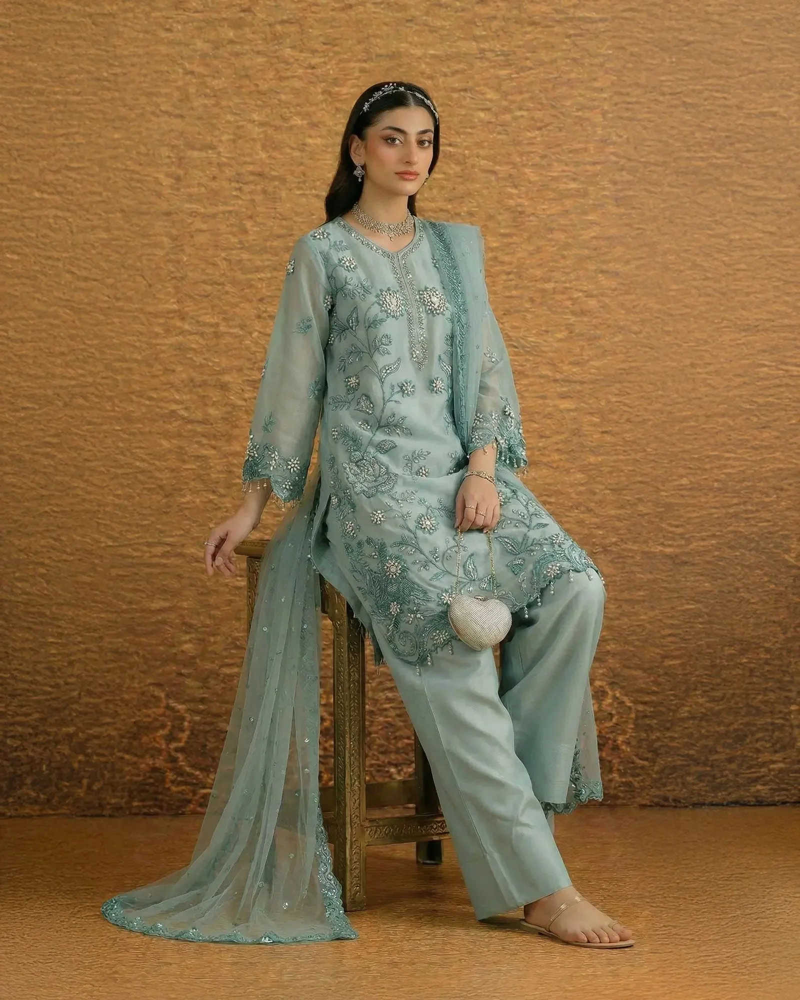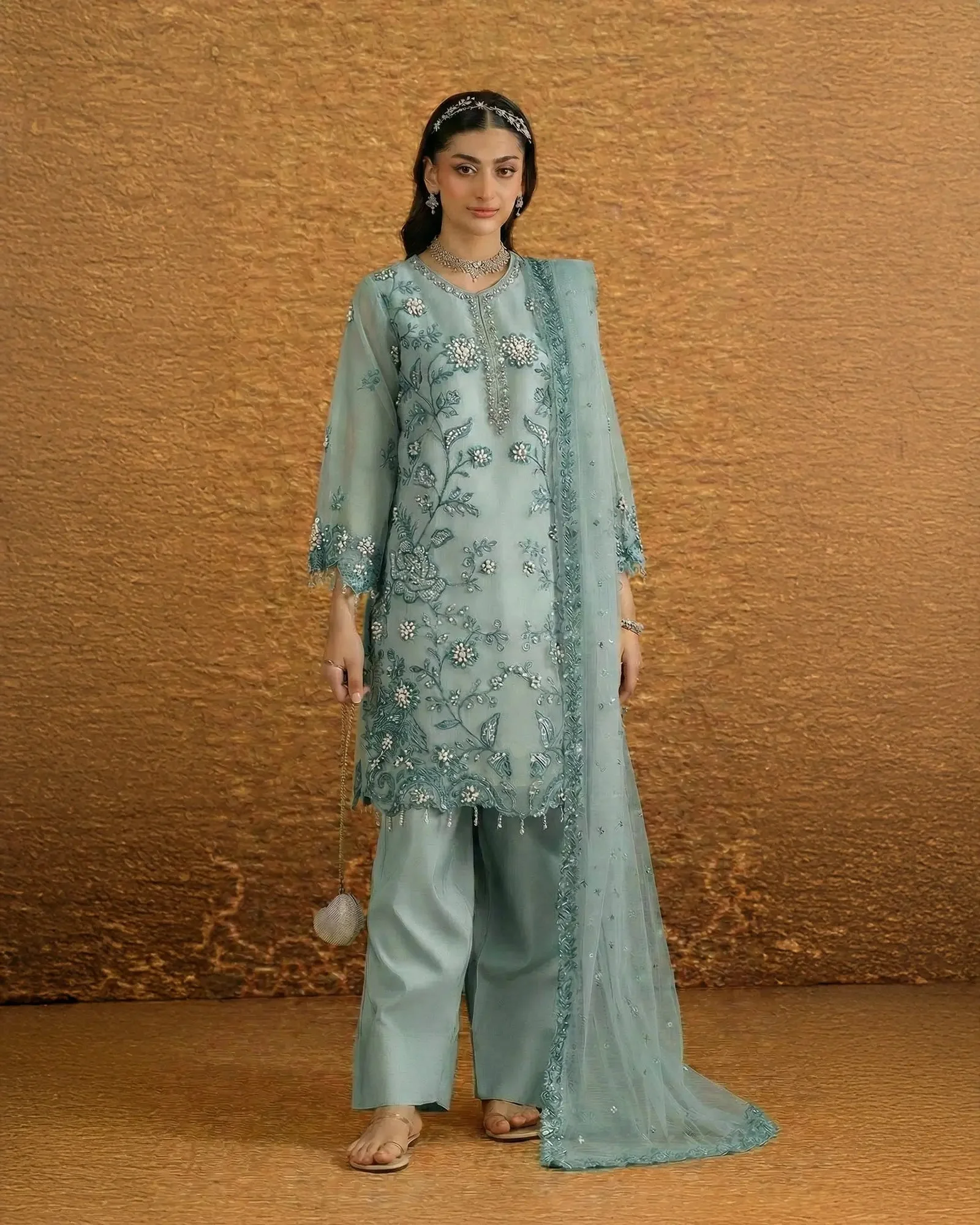 The centerpiece of this ensemble is a beautifully embroidered semi pure organza shirt that captures the essence of traditional Pakistani artistry. Delicate embroidery work adorns the shirt in a manner that reflects Sha Posh Textile’s signature design philosophy — intricate yet wearable, classic yet contemporary. Paired with a refined embroidered net dupatta, the overall silhouette exudes understated glamour perfect for formal settings.