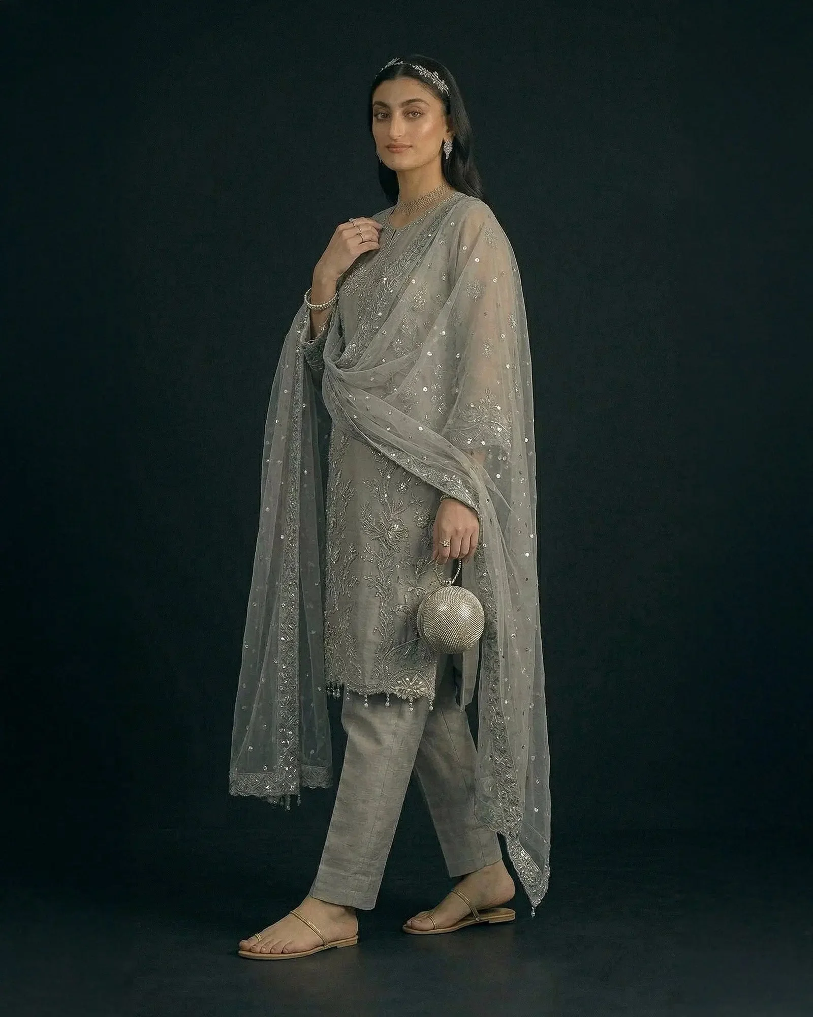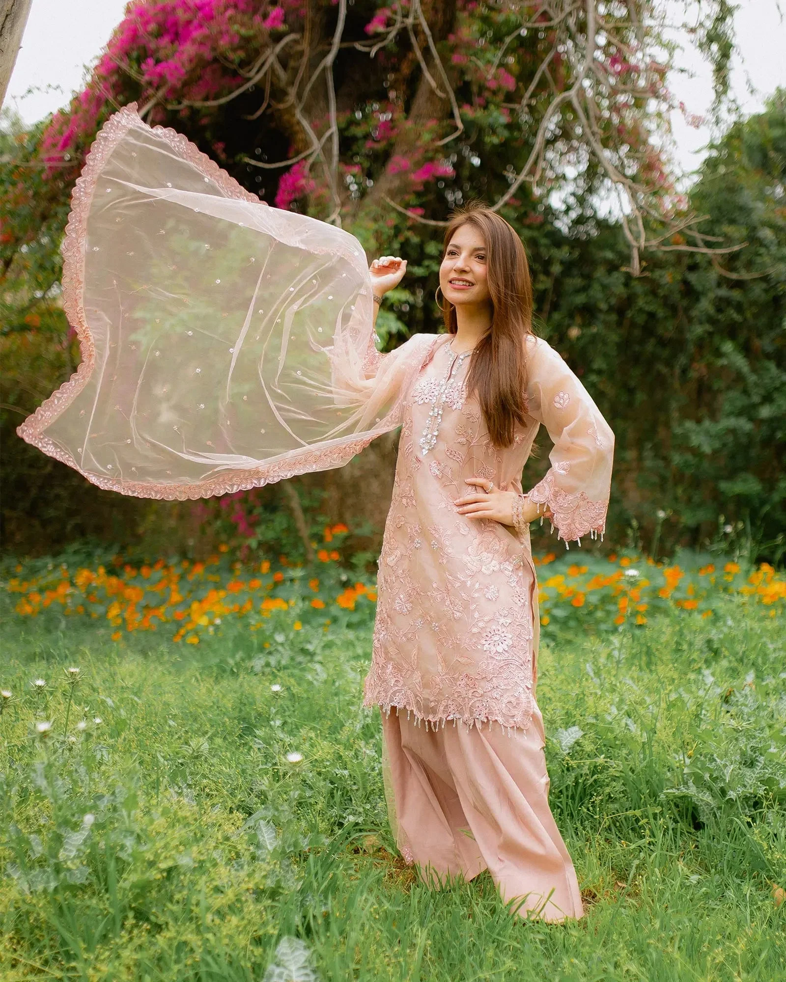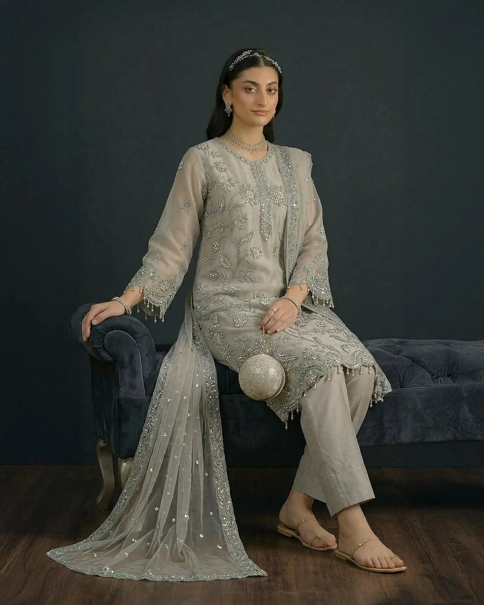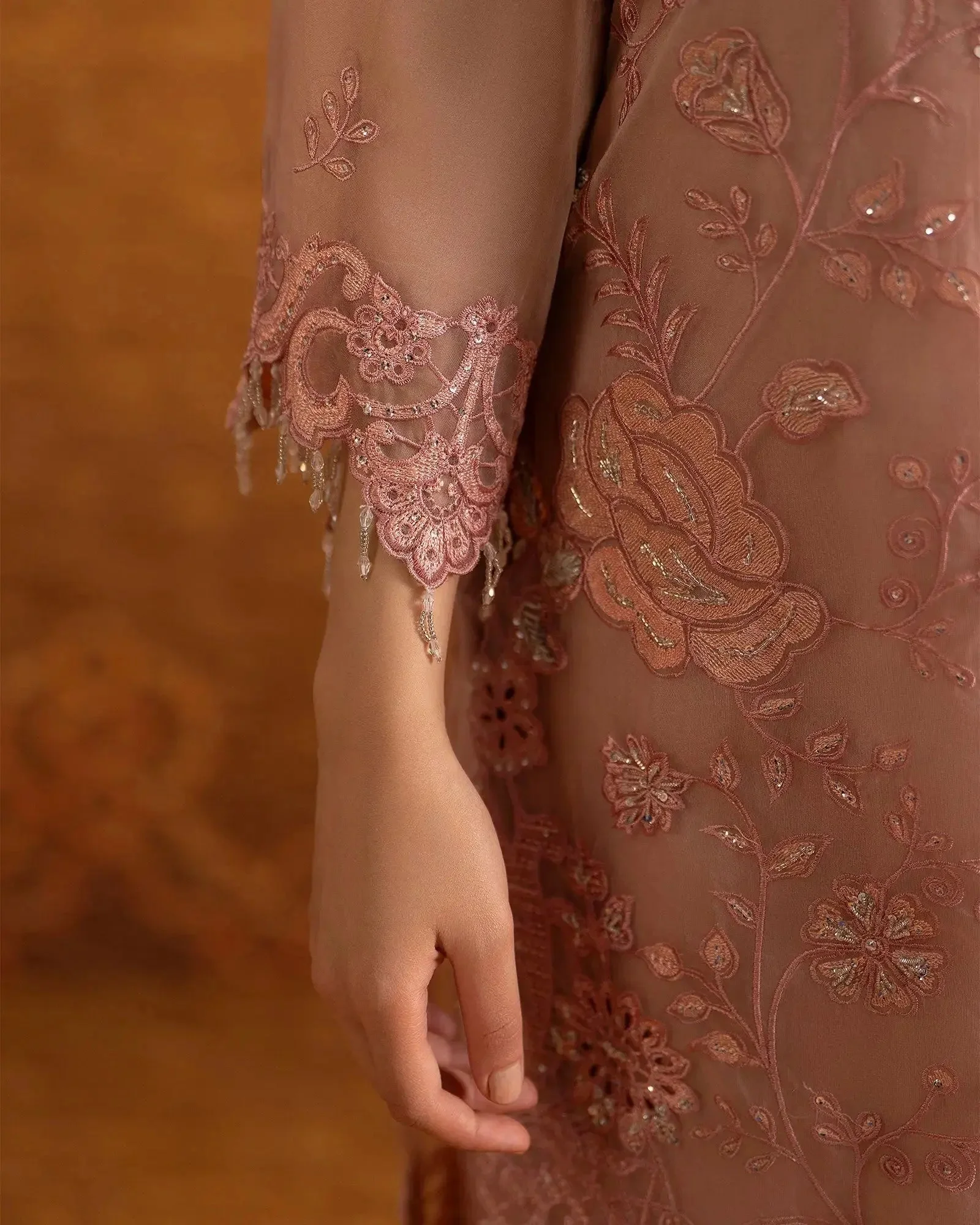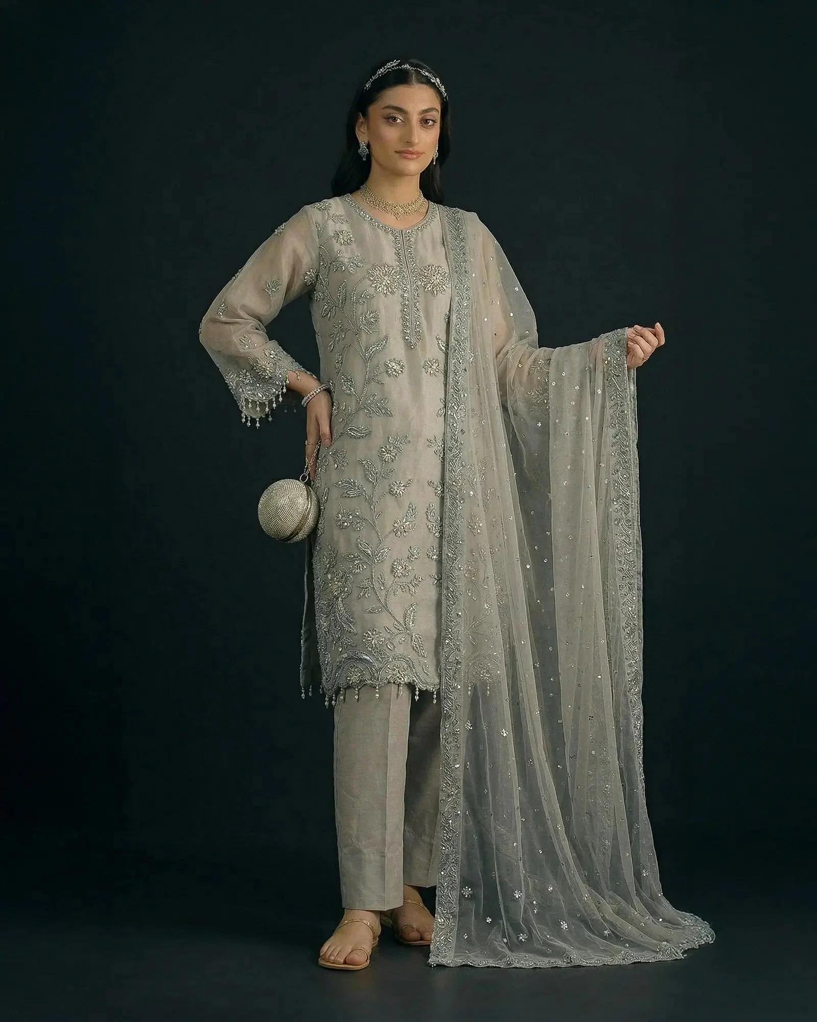 The centerpiece of this ensemble is a beautifully embroidered semi pure organza shirt that captures the essence of traditional Pakistani artistry. Delicate embroidery work adorns the shirt in a manner that reflects Sha Posh Textile’s signature design philosophy — intricate yet wearable, classic yet contemporary. Paired with a refined embroidered net dupatta, the overall silhouette exudes understated glamour perfect for formal settings.