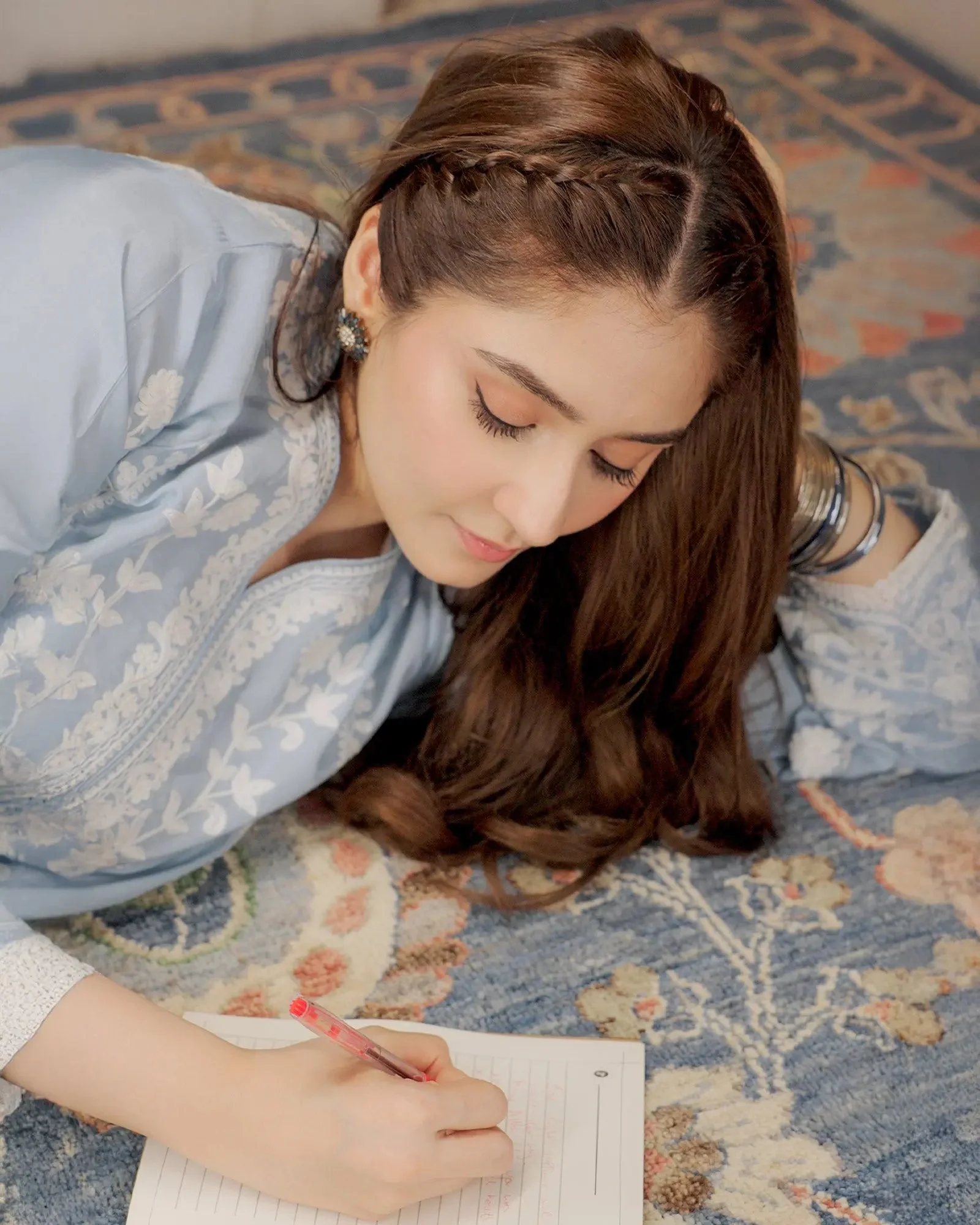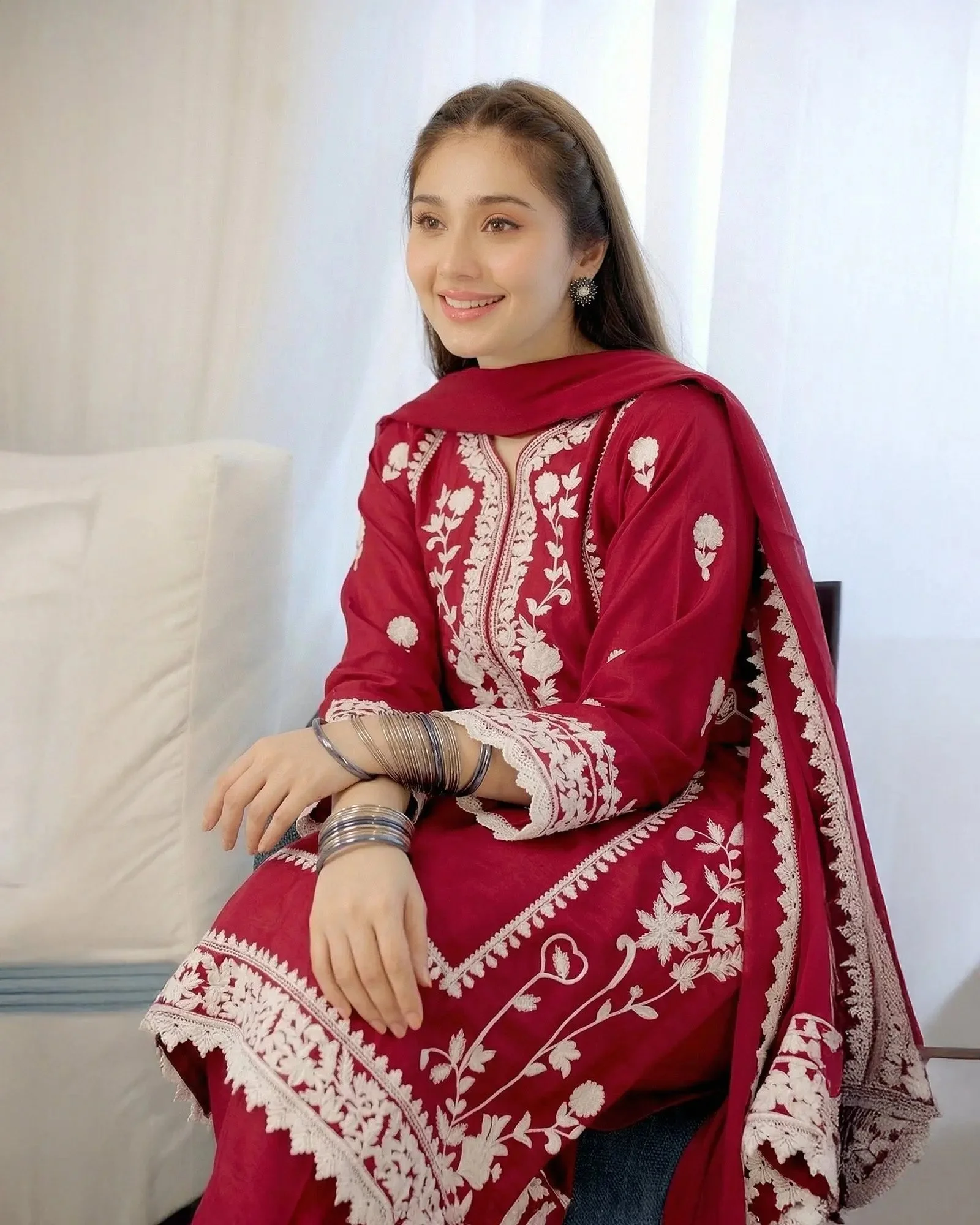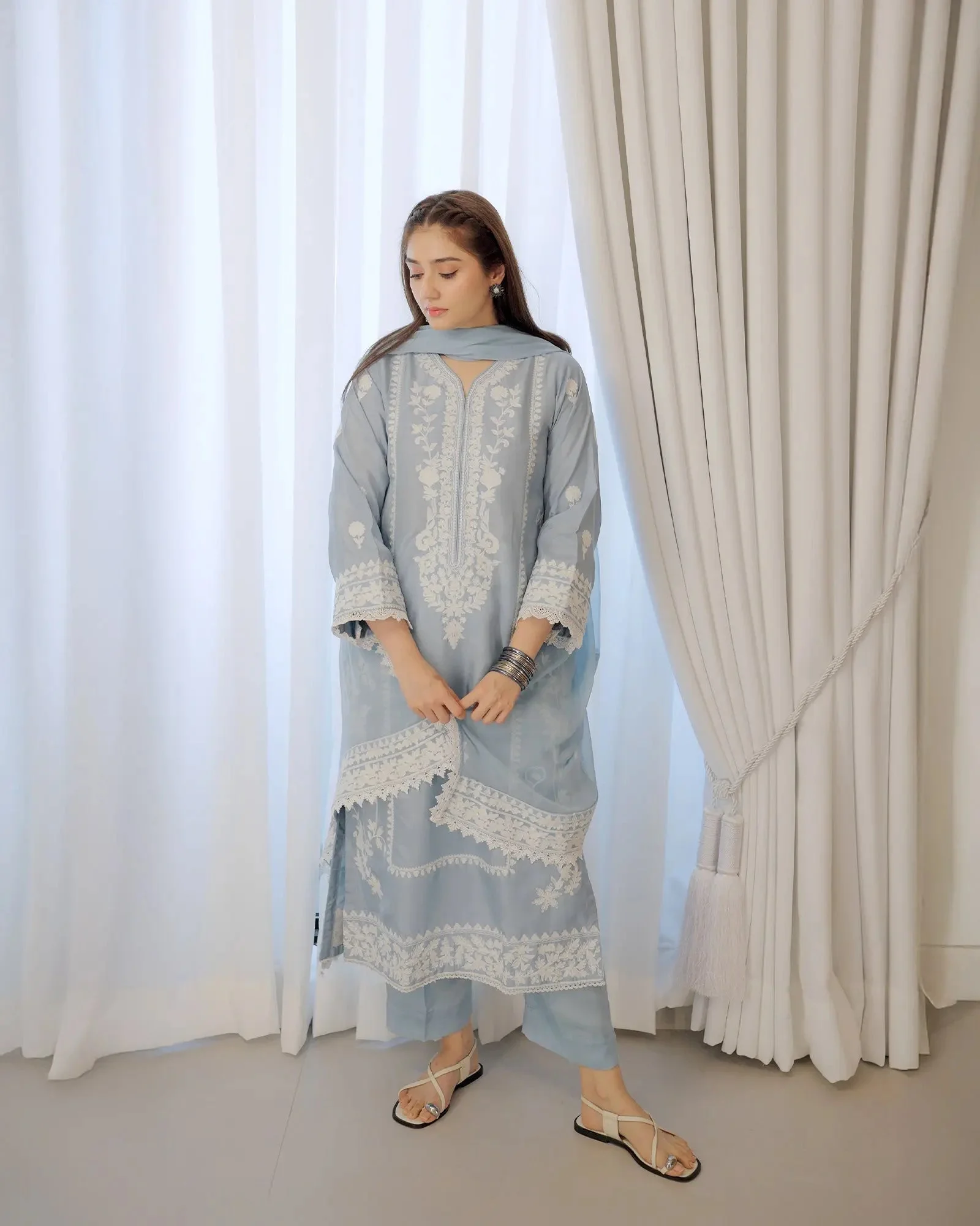 Pair this Sha Posh embroidered shalwar kameez with statement chandelier earrings and strappy heels for a polished festive look. The Crinkle Chiffon dupatta can be draped over the shoulder for a classic style or pinned elegantly for a more structured appearance. Both the Ferozi and Anari colorways complement gold jewellery beautifully, making accessorising effortless.