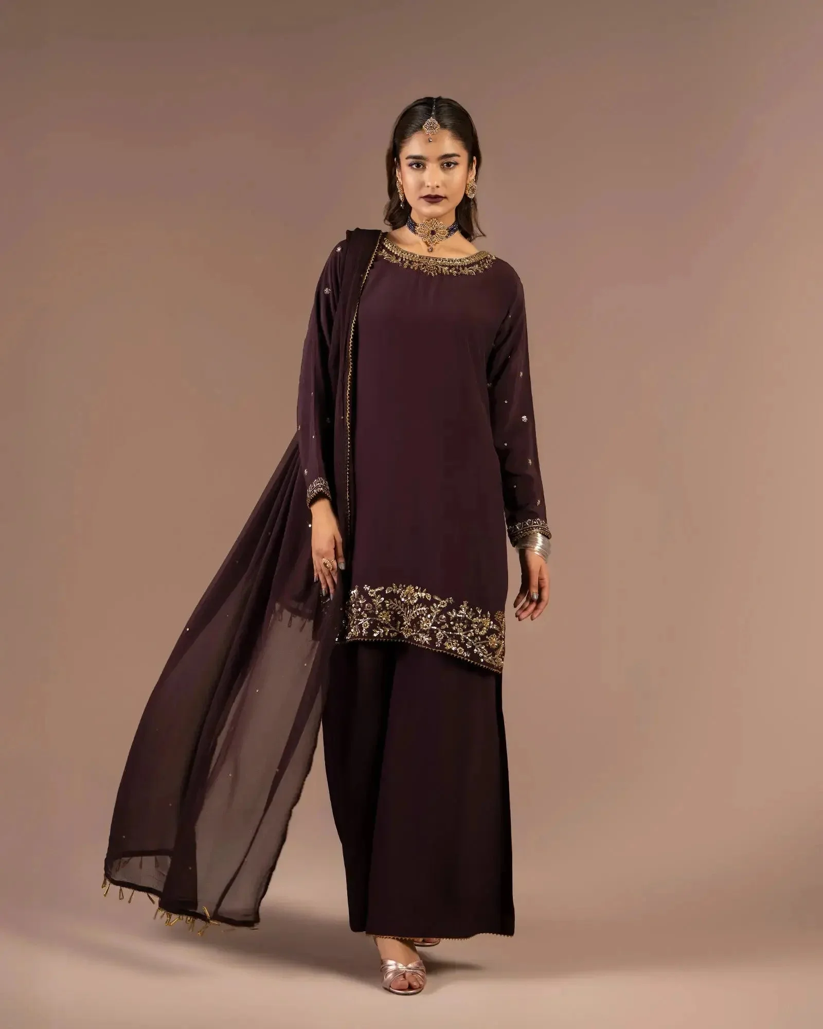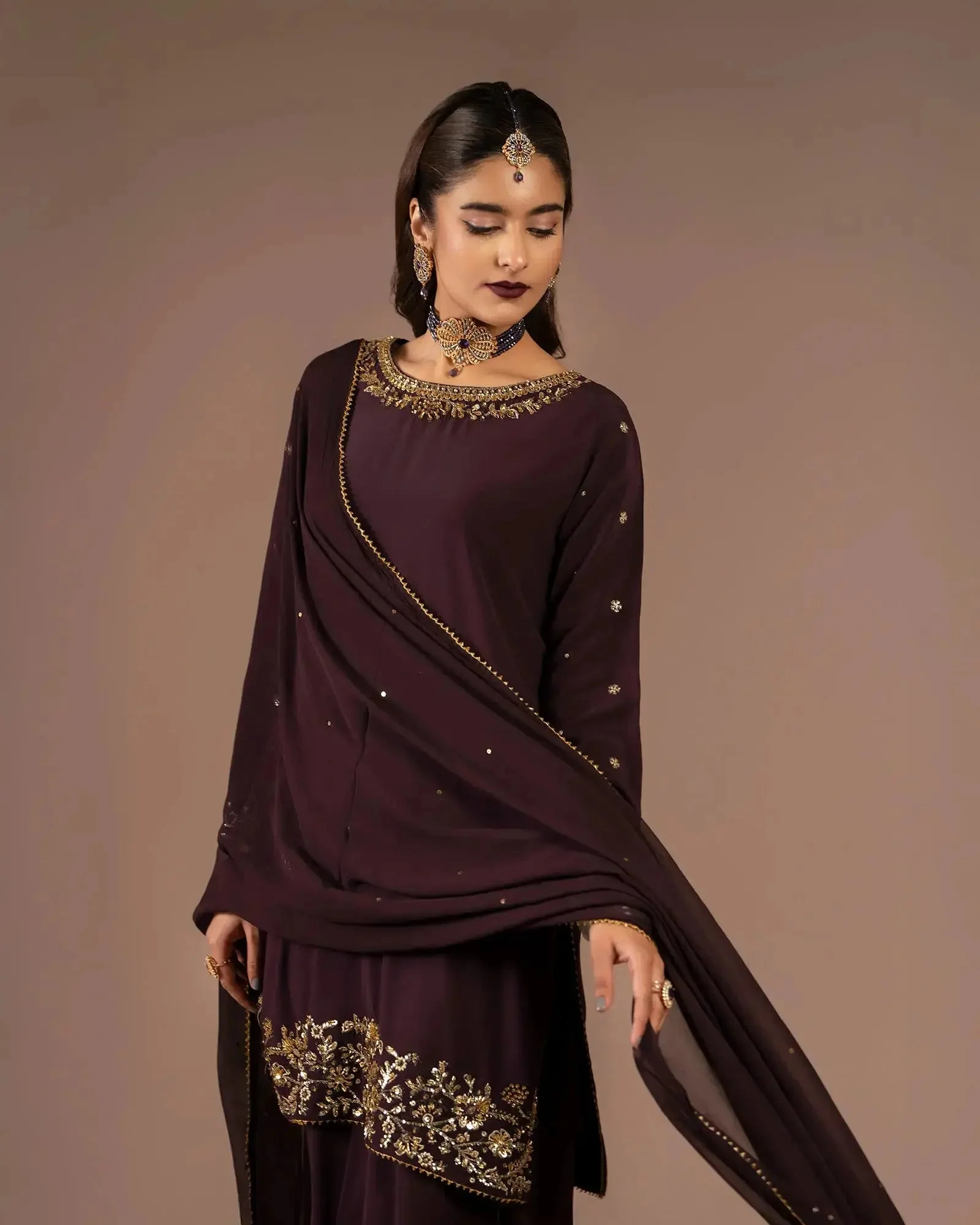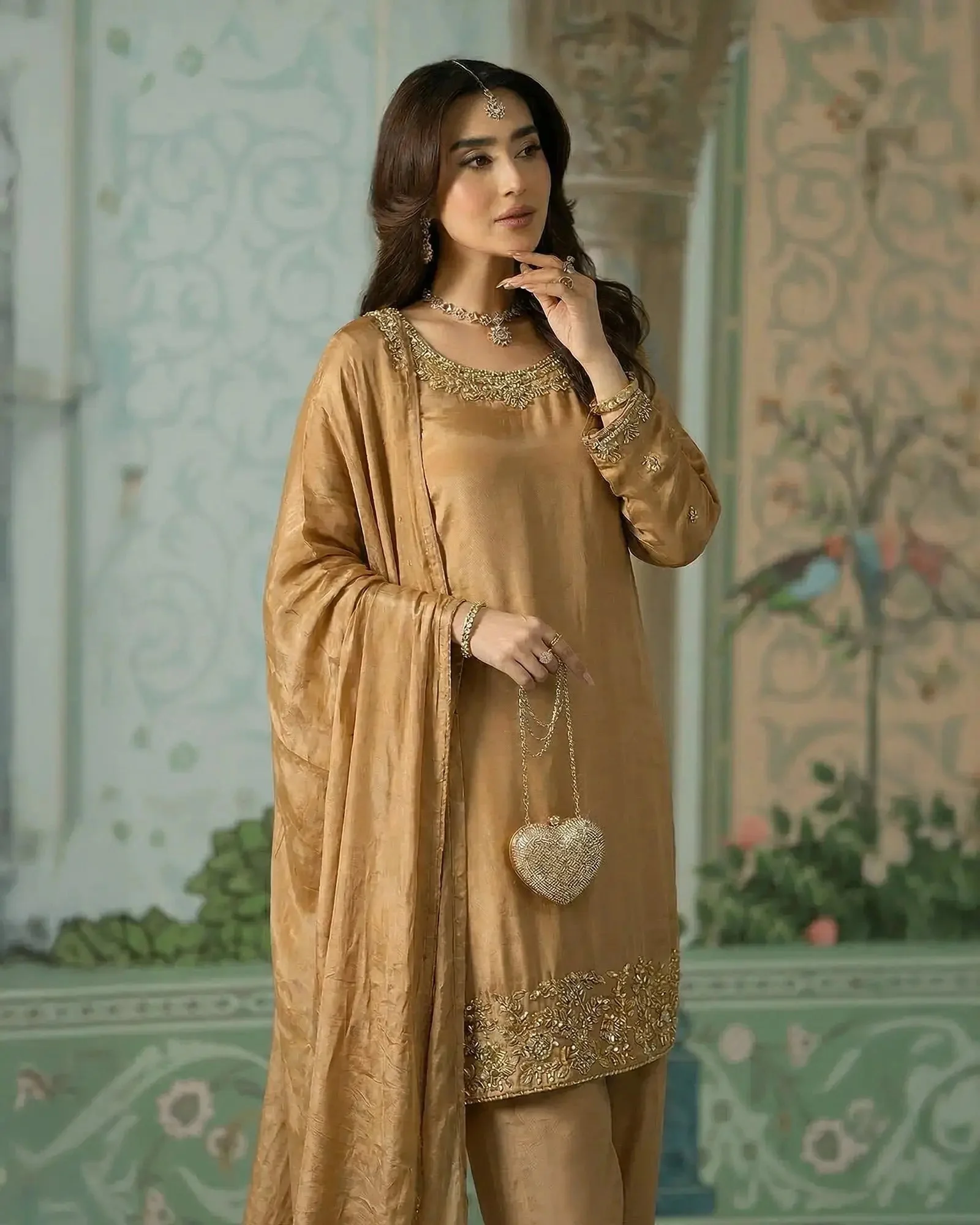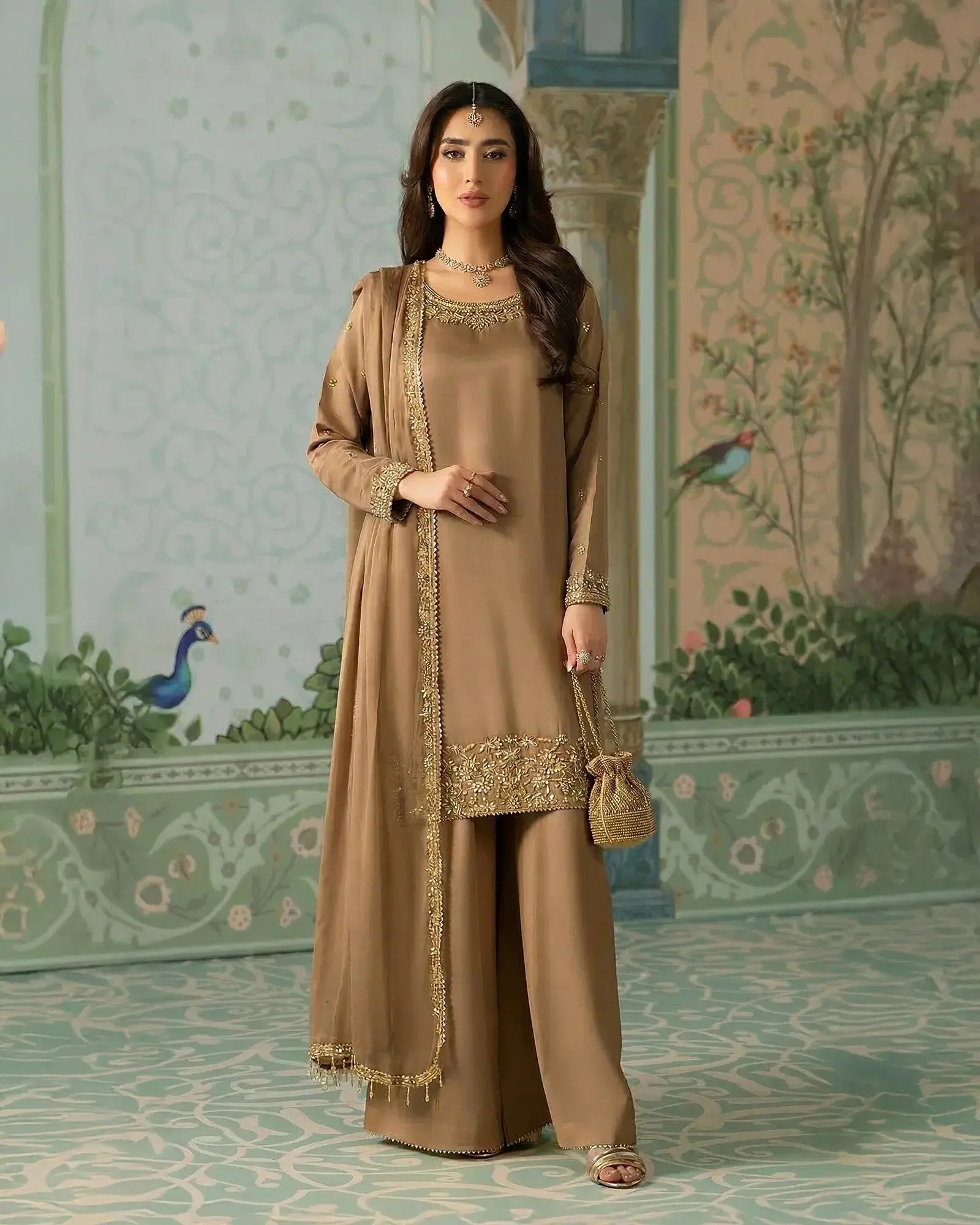 This authentic Sha Posh Textile creation showcases intricate tilla embroidery on a flowing silk shirt, complemented by a matching imported silk sharara that creates a regal silhouette. The sharara cut adds a timeless traditional touch while keeping the look fashion-forward. Available in six versatile shades — Camel, Ice Blue, Mehndi, Sky Blue, Lemon, and Chocolate — every color option is thoughtfully curated for the modern Pakistani fashion connoisseur.