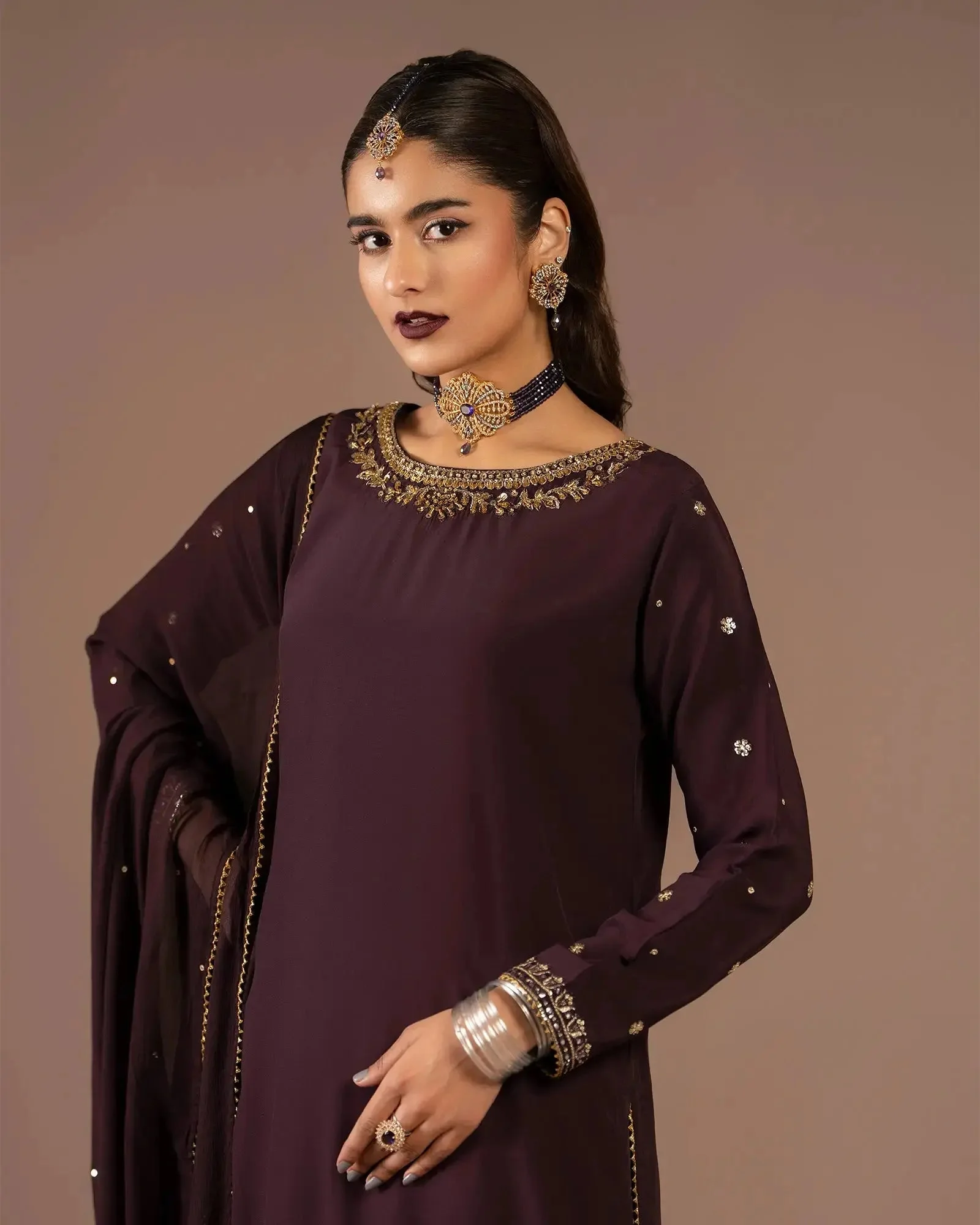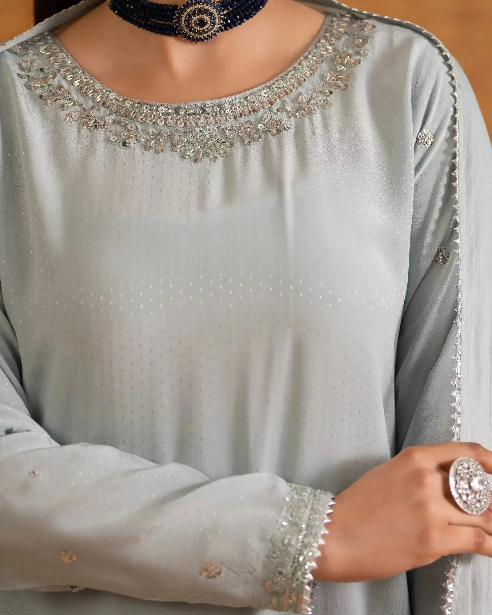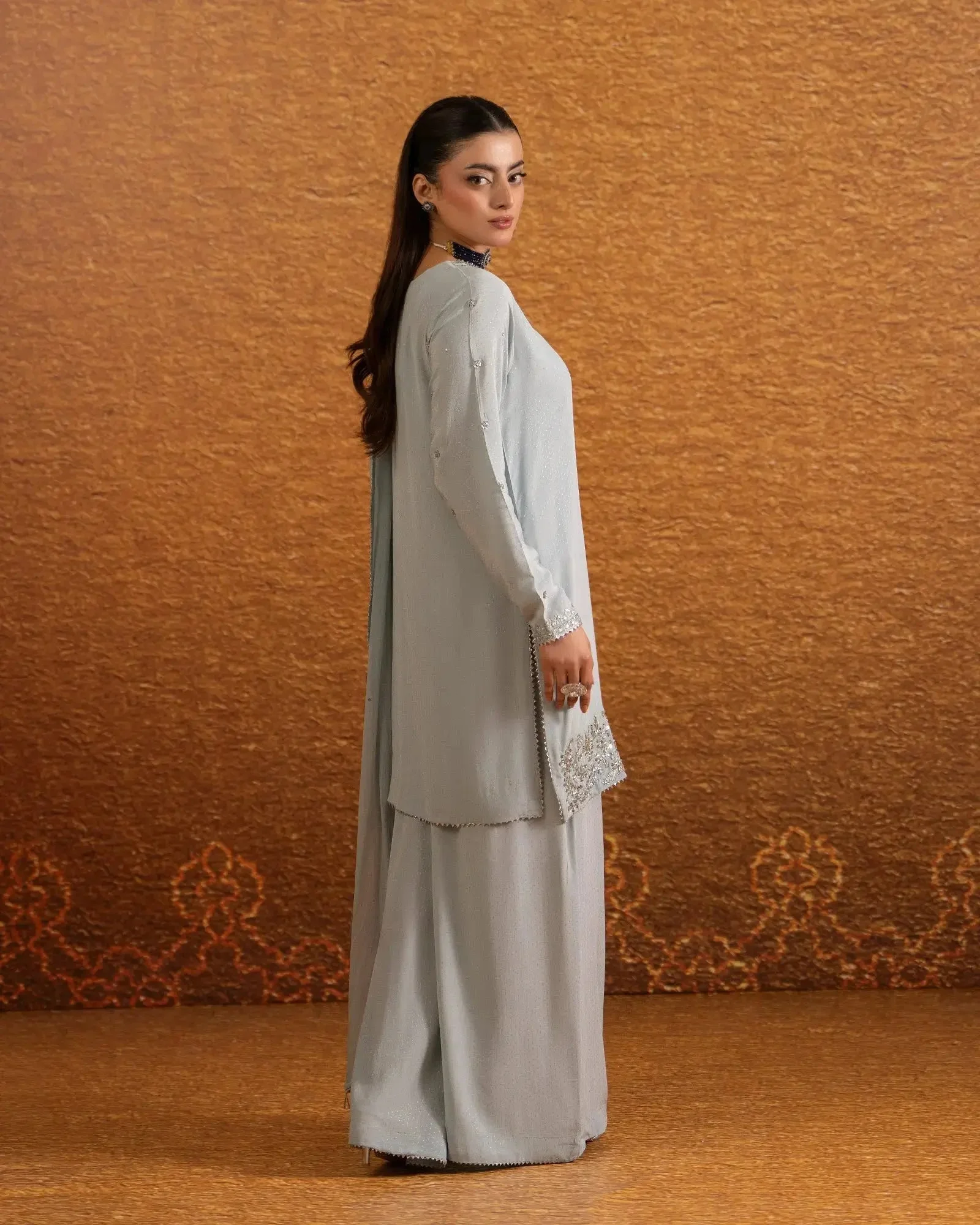 This authentic Sha Posh Textile creation showcases intricate tilla embroidery on a flowing silk shirt, complemented by a matching imported silk sharara that creates a regal silhouette. The sharara cut adds a timeless traditional touch while keeping the look fashion-forward. Available in six versatile shades — Camel, Ice Blue, Mehndi, Sky Blue, Lemon, and Chocolate — every color option is thoughtfully curated for the modern Pakistani fashion connoisseur.