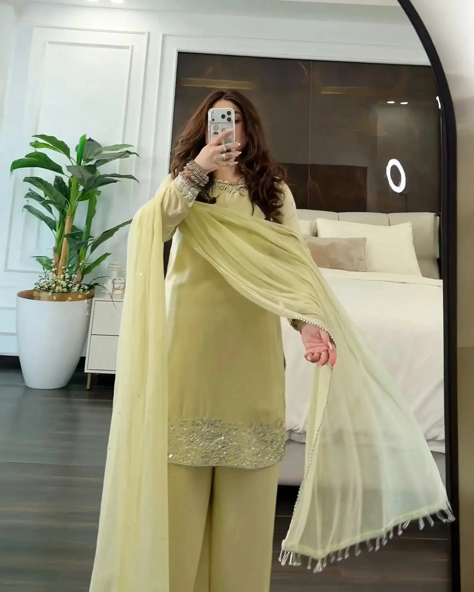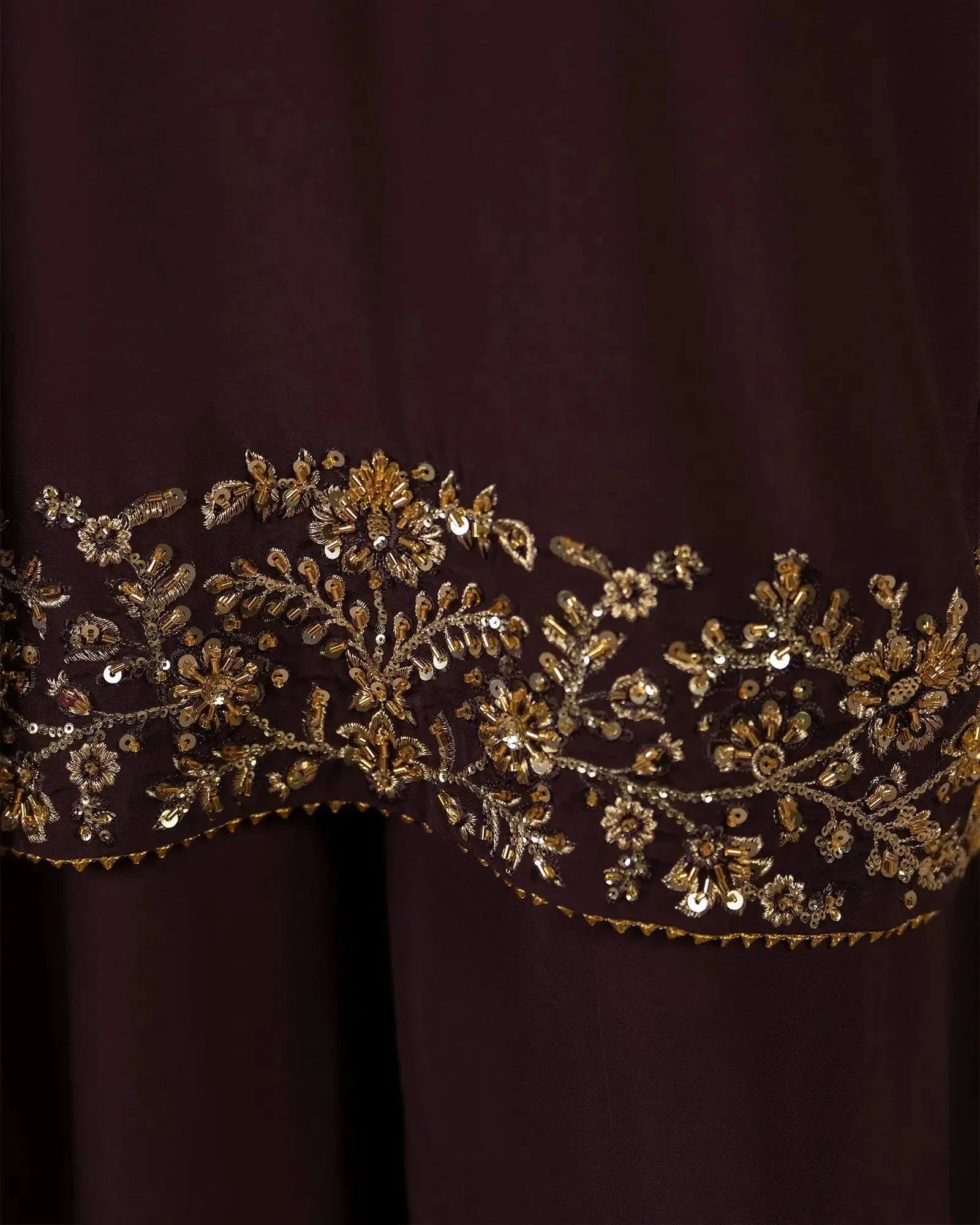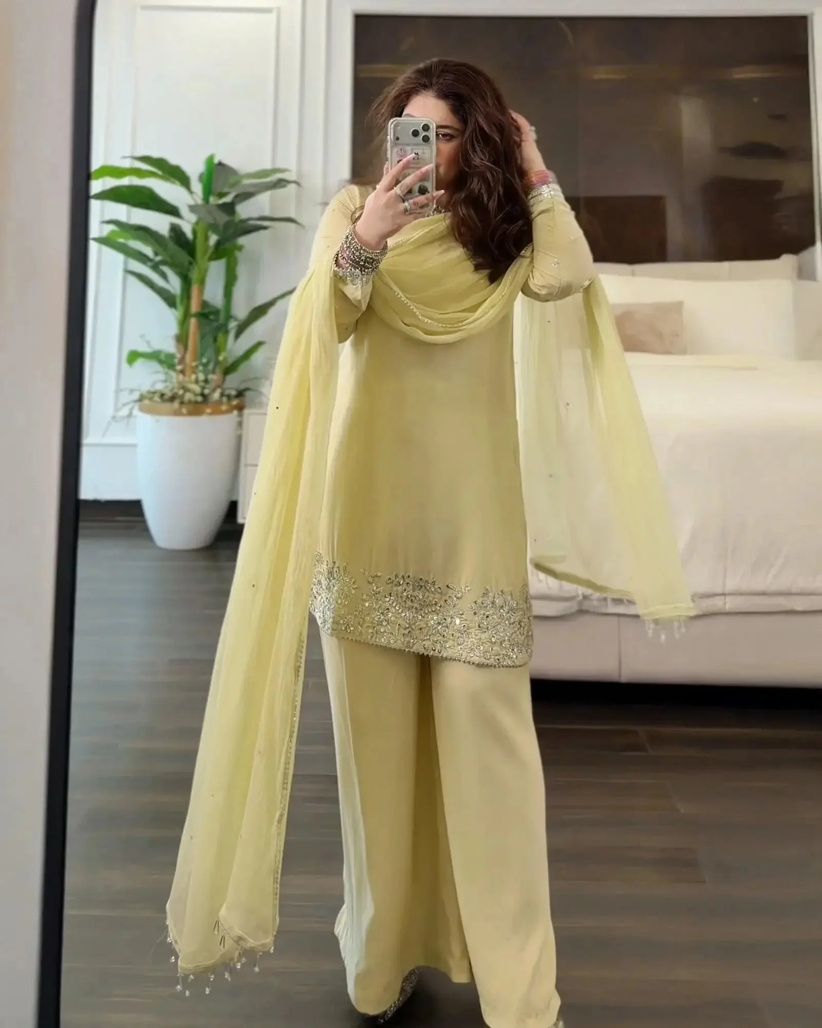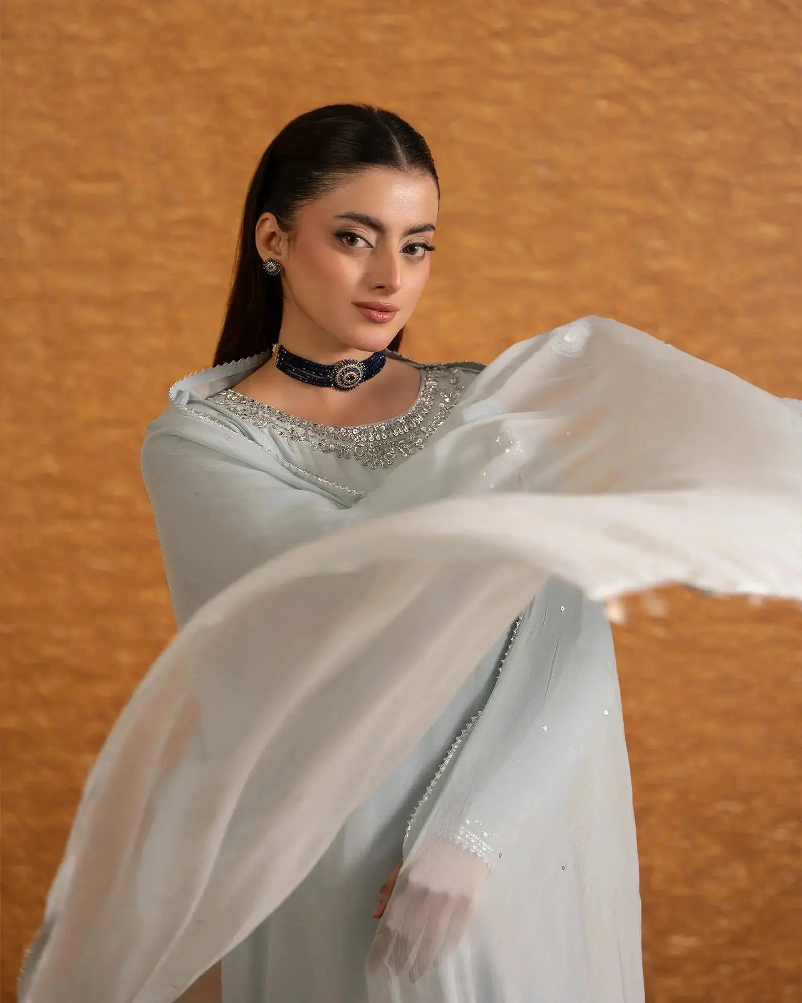 This authentic Sha Posh Textile creation showcases intricate tilla embroidery on a flowing silk shirt, complemented by a matching imported silk sharara that creates a regal silhouette. The sharara cut adds a timeless traditional touch while keeping the look fashion-forward. Available in six versatile shades — Camel, Ice Blue, Mehndi, Sky Blue, Lemon, and Chocolate — every color option is thoughtfully curated for the modern Pakistani fashion connoisseur.