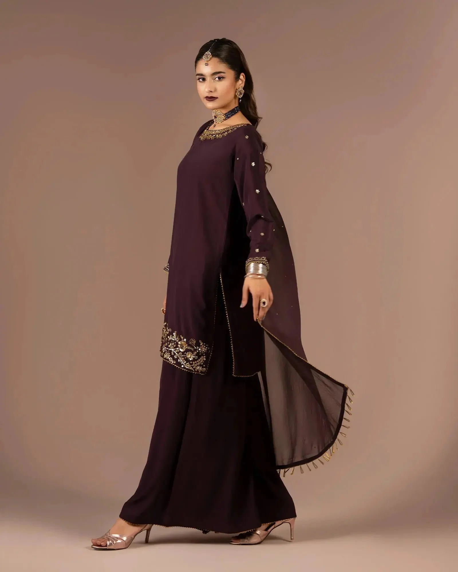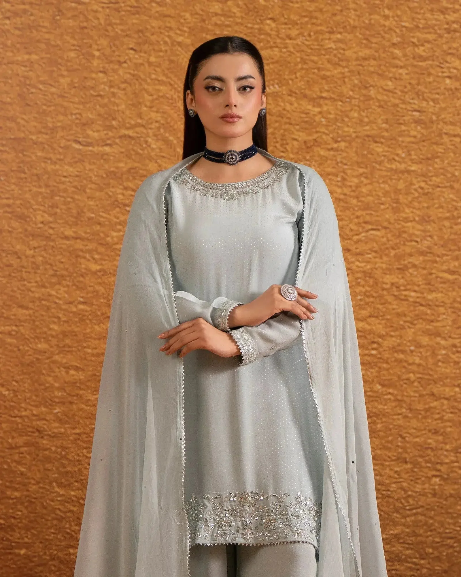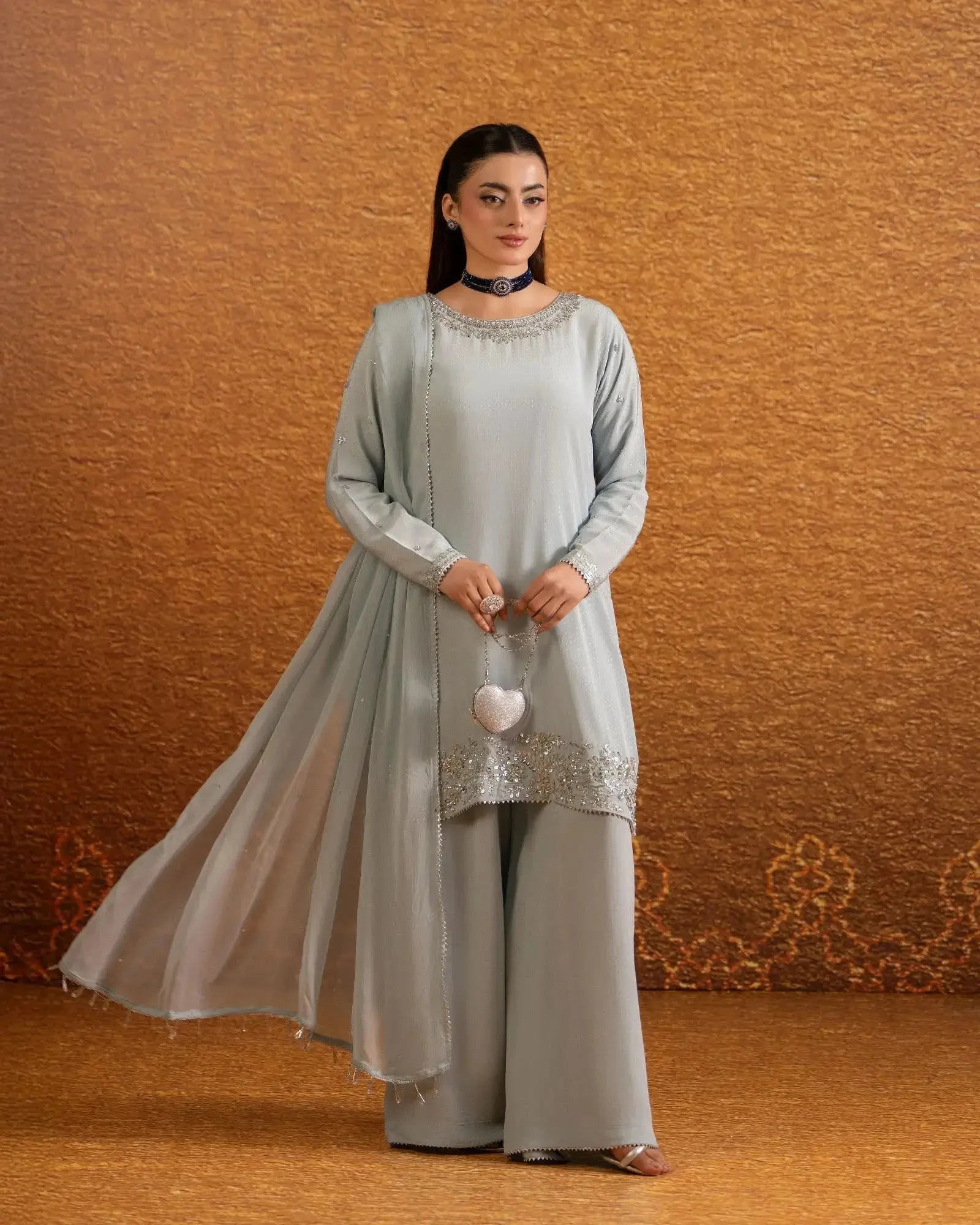 Step into elegance with this breathtaking Sha Posh Textile Imported Silk 3-Piece Sharara — a quintessential party wear statement that blends traditional craftsmanship with contemporary Pakistani designer fashion. The tilla embroidery on the shirt elevates this ensemble to luxury territory, making it the ideal choice for women who want to stand out at weddings, mehndi nights, festive dinners, and all celebratory occasions.