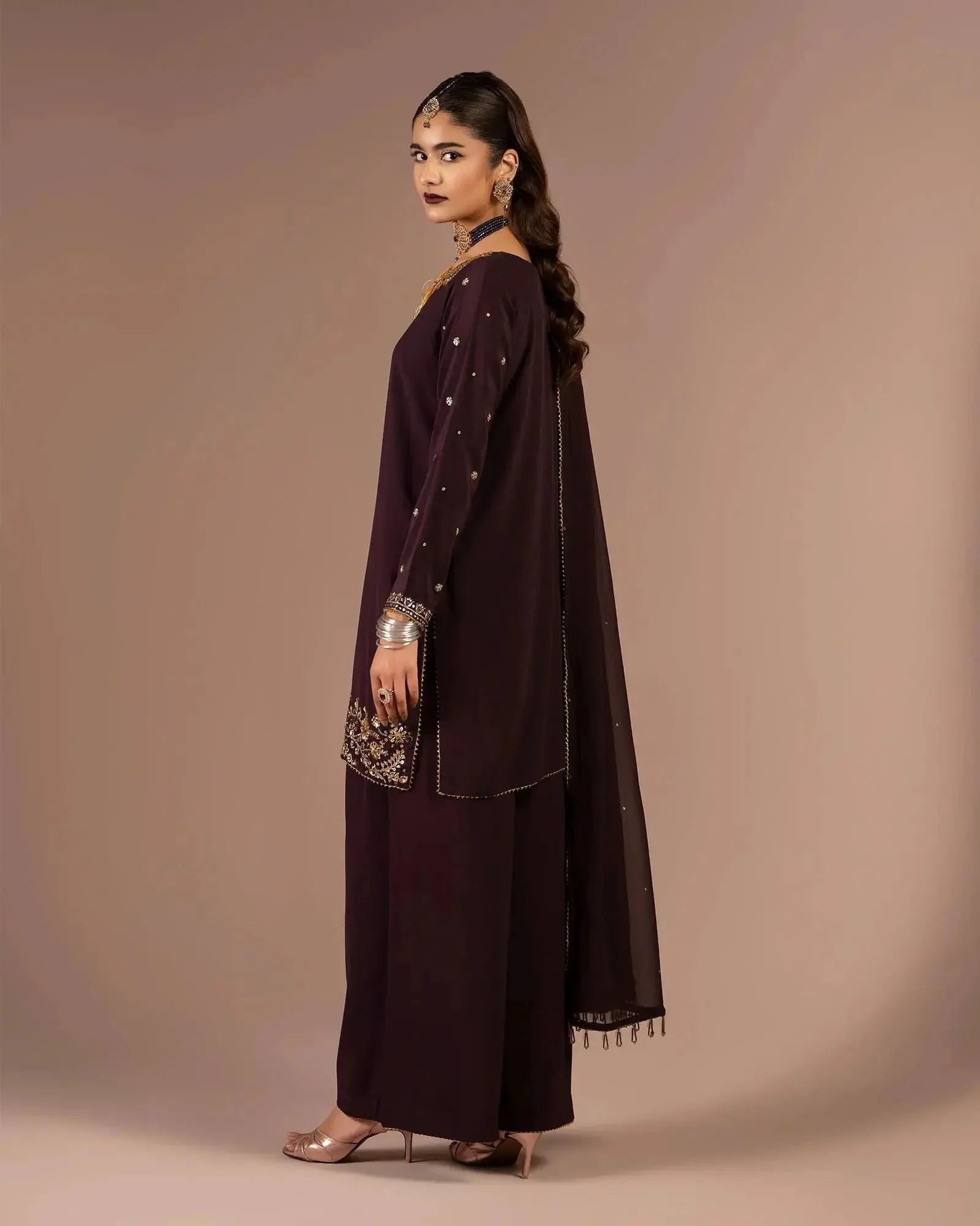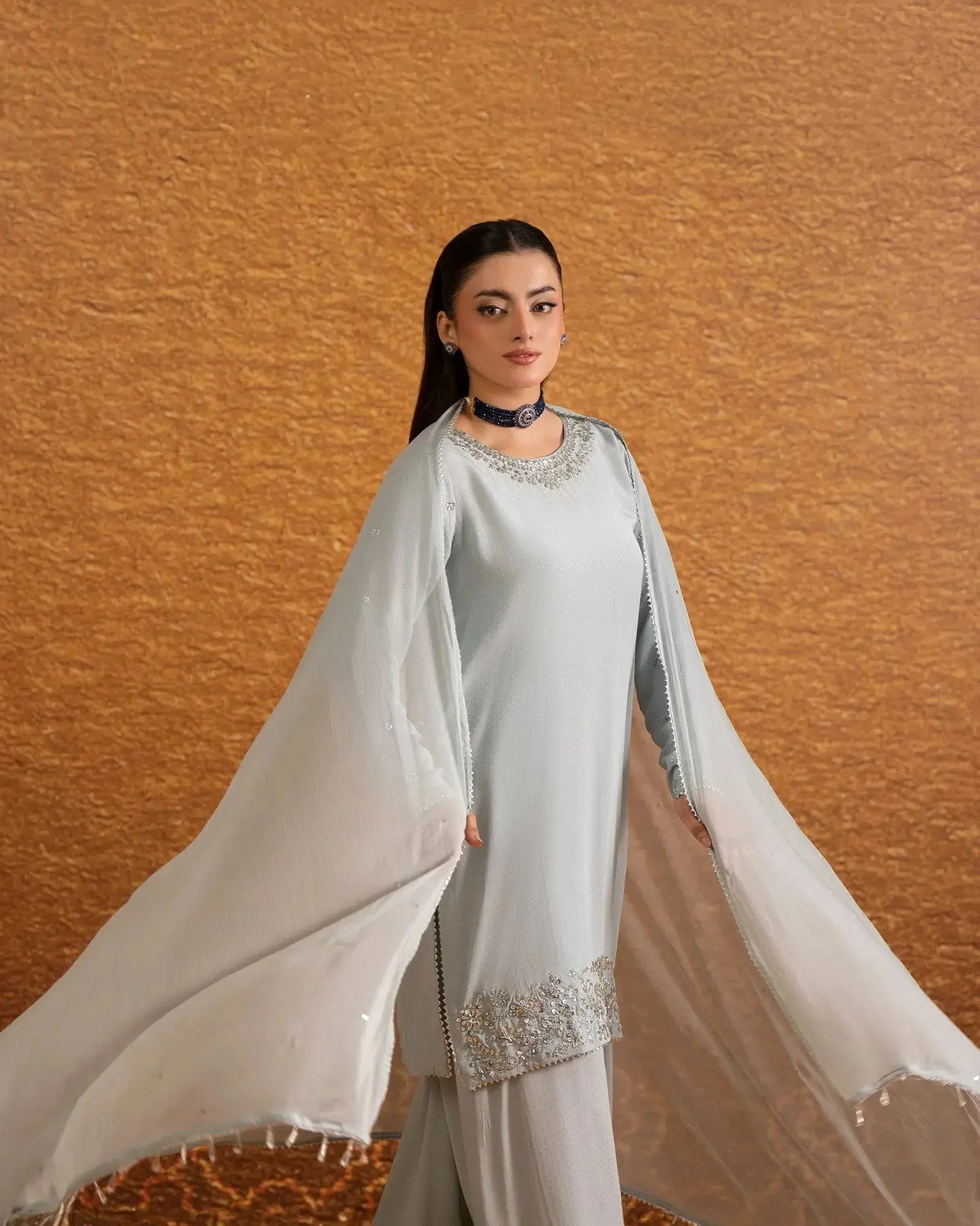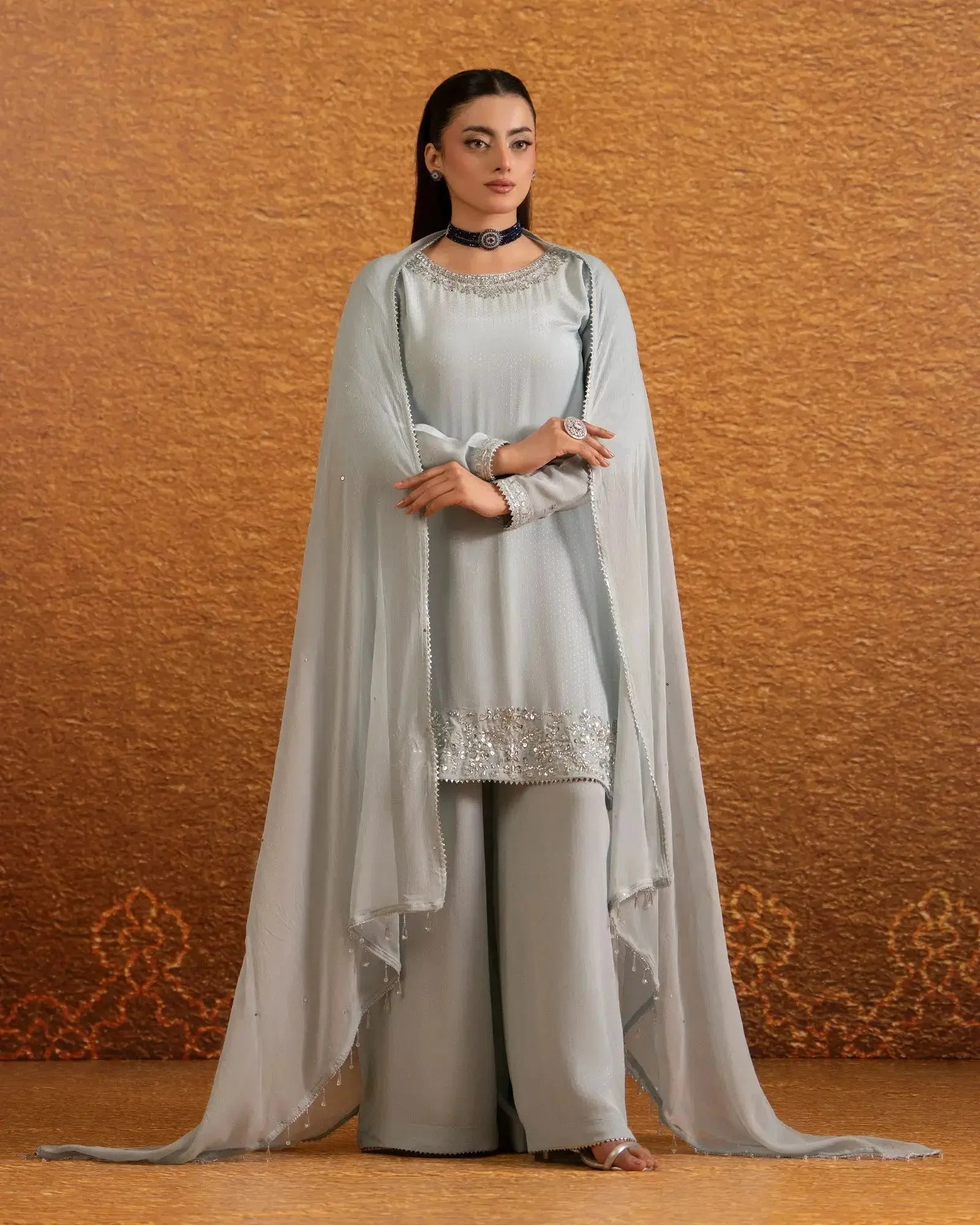 Step into elegance with this breathtaking Sha Posh Textile Imported Silk 3-Piece Sharara — a quintessential party wear statement that blends traditional craftsmanship with contemporary Pakistani designer fashion. The tilla embroidery on the shirt elevates this ensemble to luxury territory, making it the ideal choice for women who want to stand out at weddings, mehndi nights, festive dinners, and all celebratory occasions.