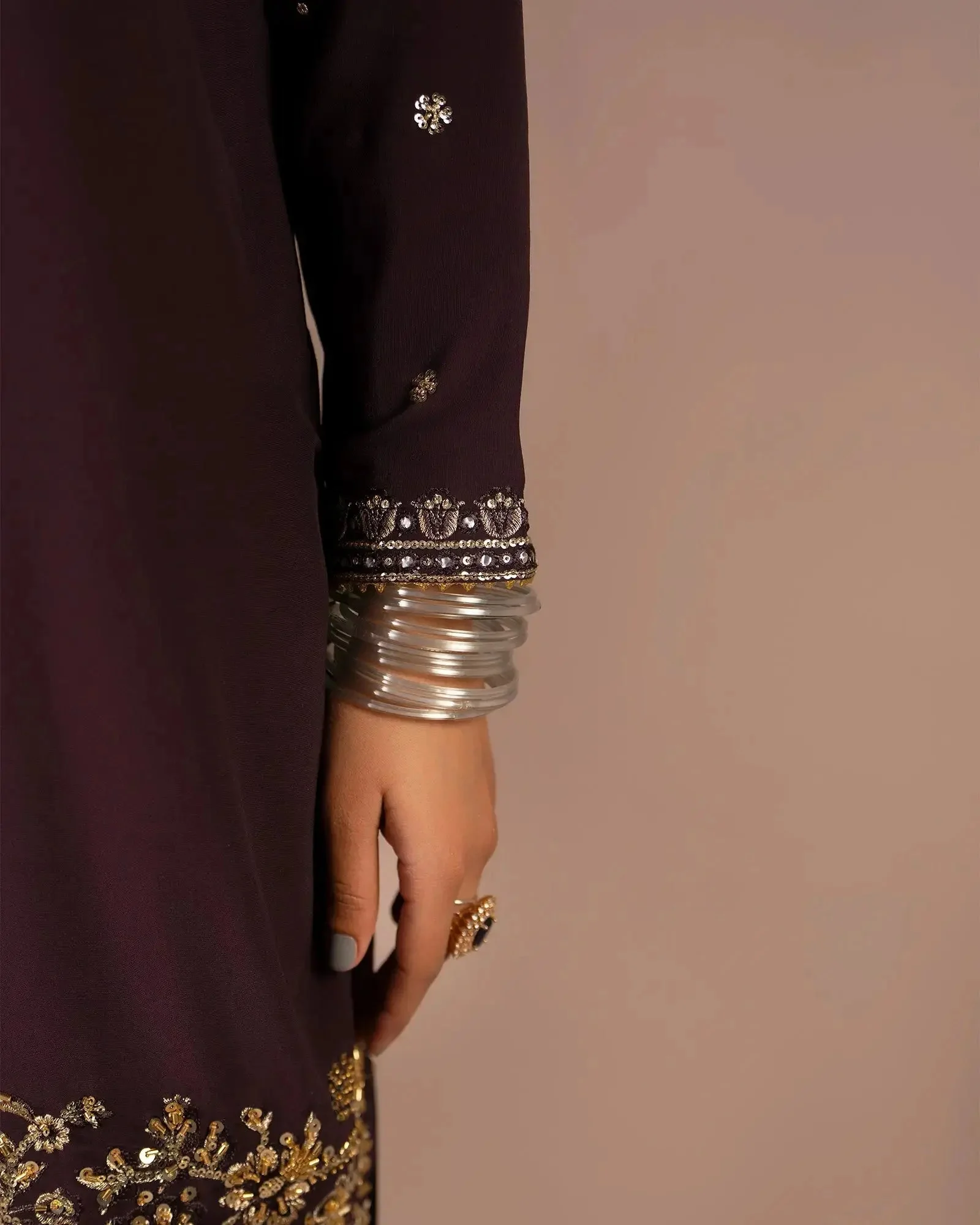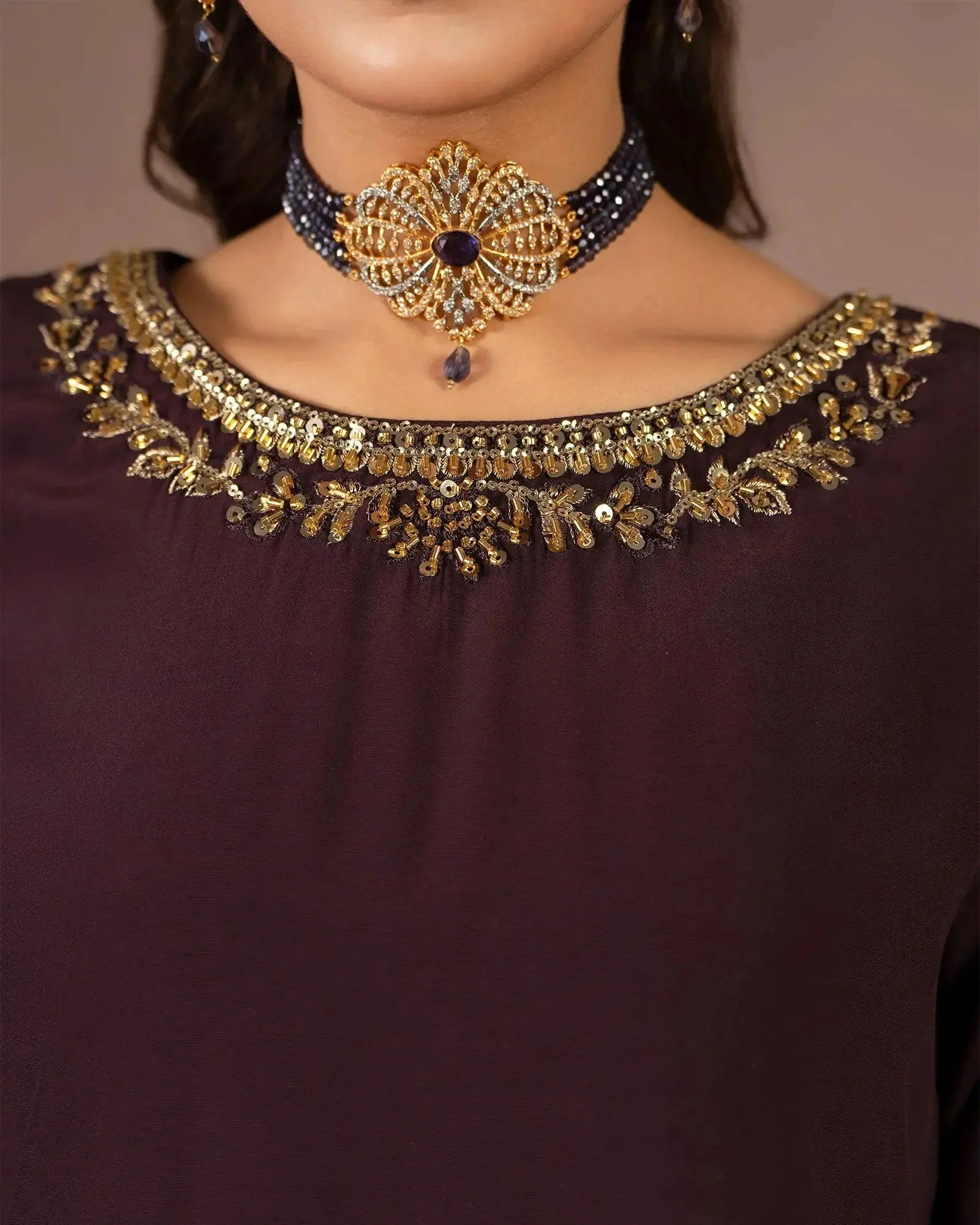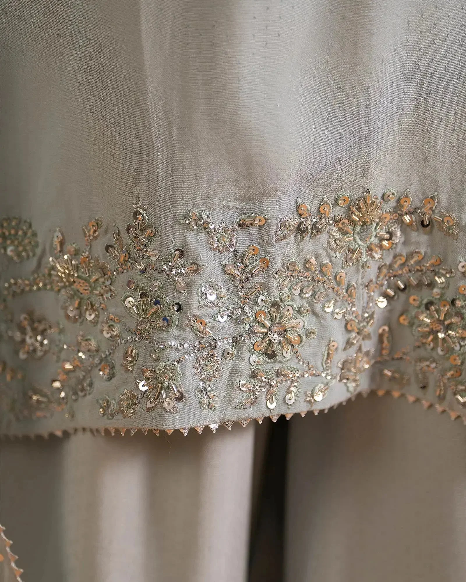Style this original Sha Posh Textile collection piece with statement jhumkas and a silk clutch for a classic Pakistani couture look. Opt for strappy heeled sandals to elongate the silhouette and let the sharara flow beautifully. A sleek bun or soft curls work equally well depending on how formal or festive your event is. Minimal jewellery in gold or silver pairs perfectly with the tilla embroidery detailing.